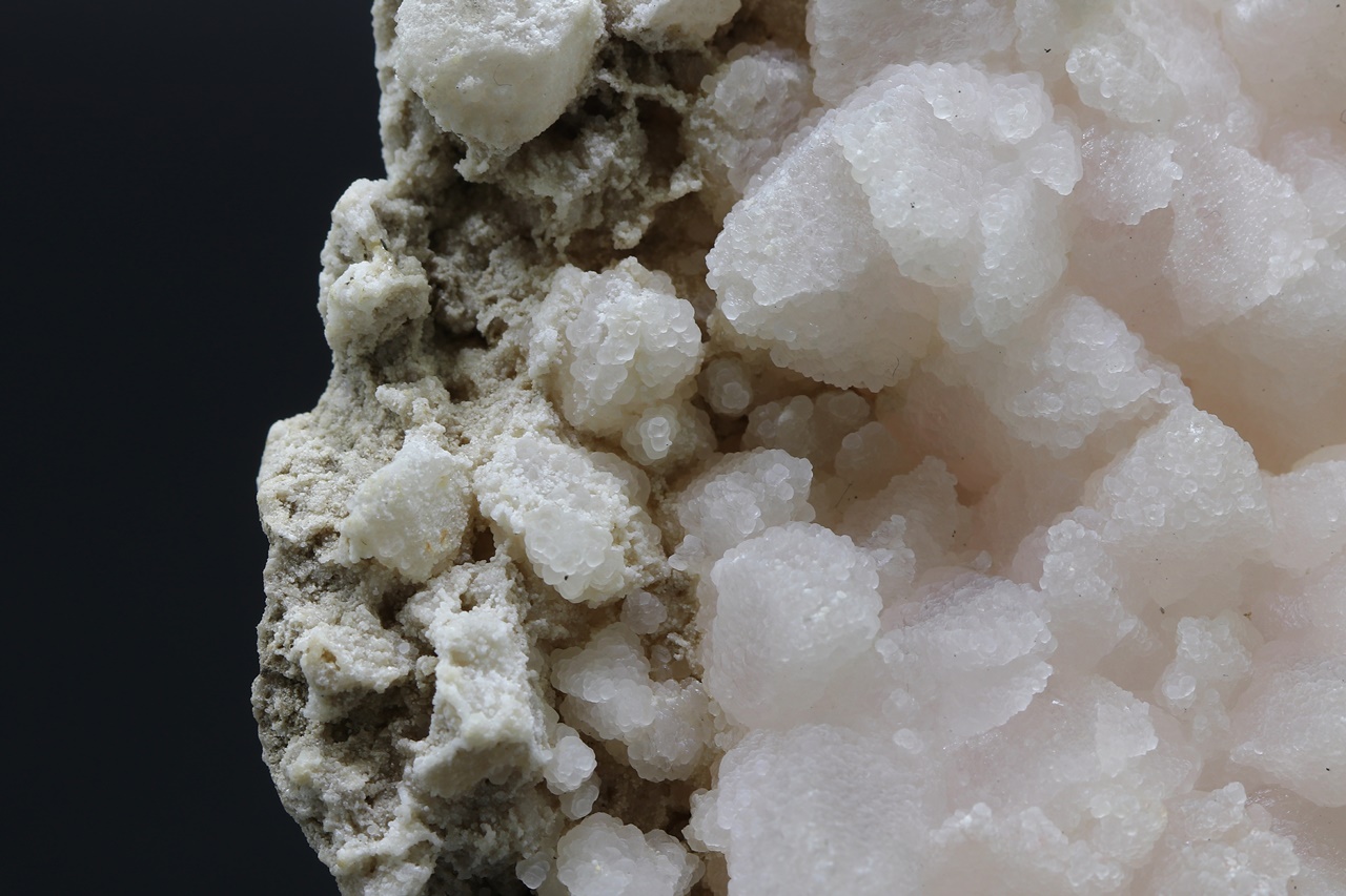 Manganese-rich calcite aggregates grown on corroded dolomite, fused together in a hypoparallel manner.