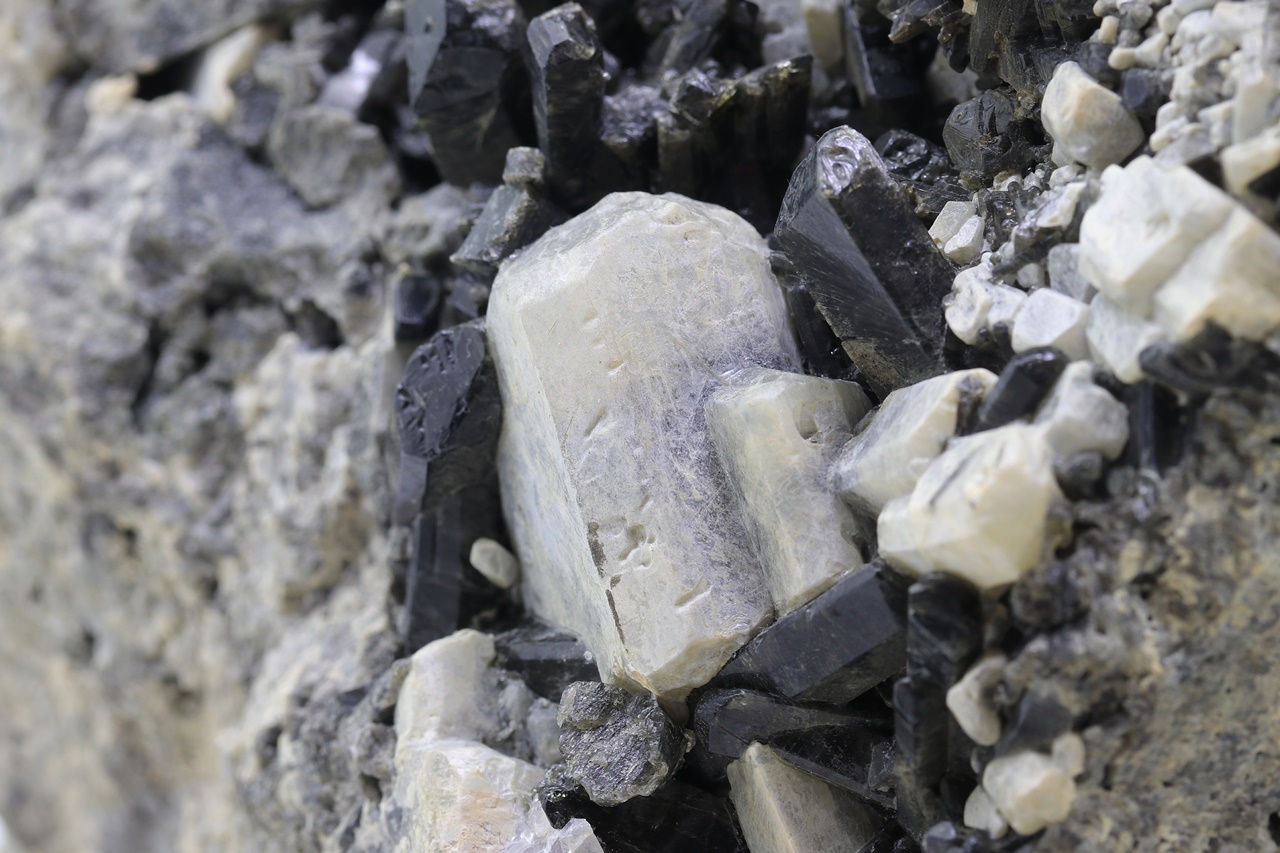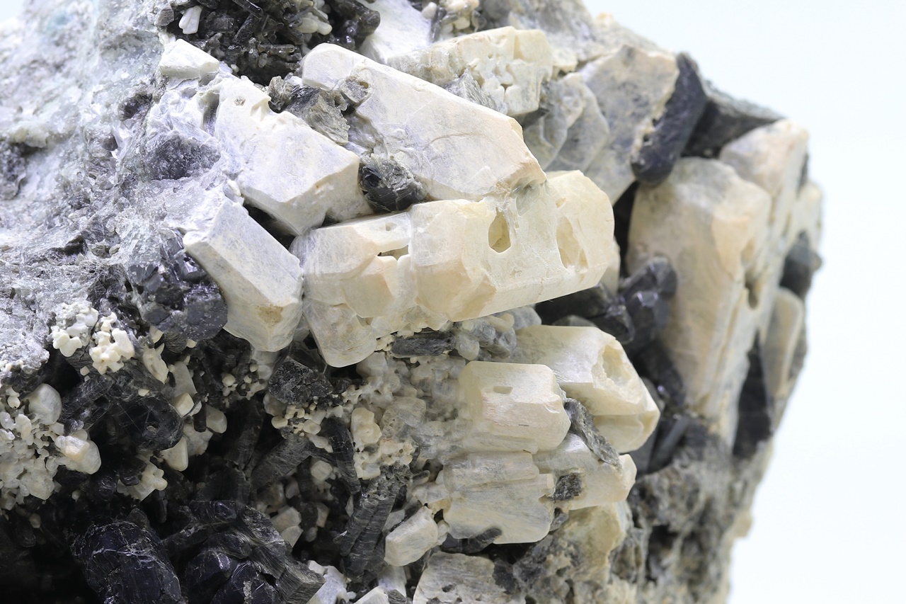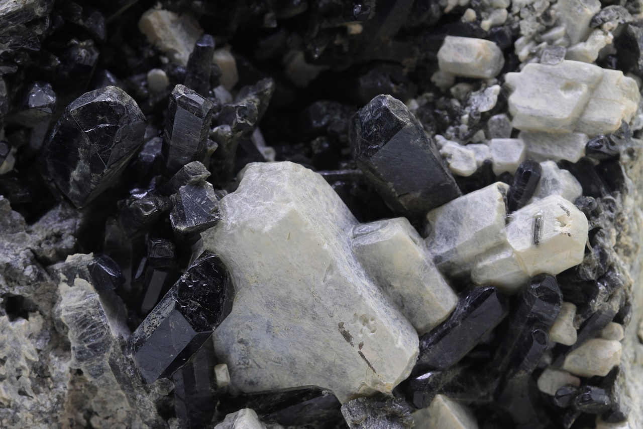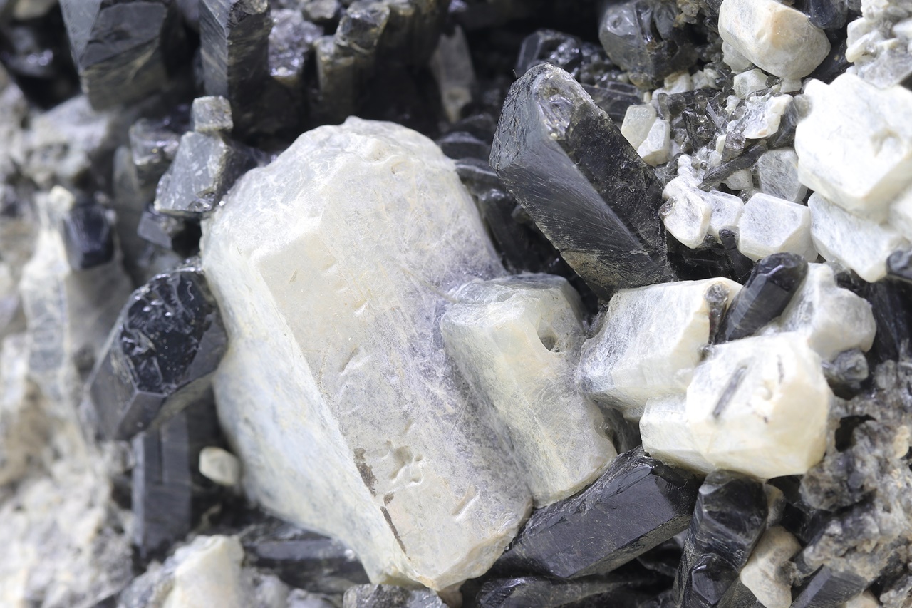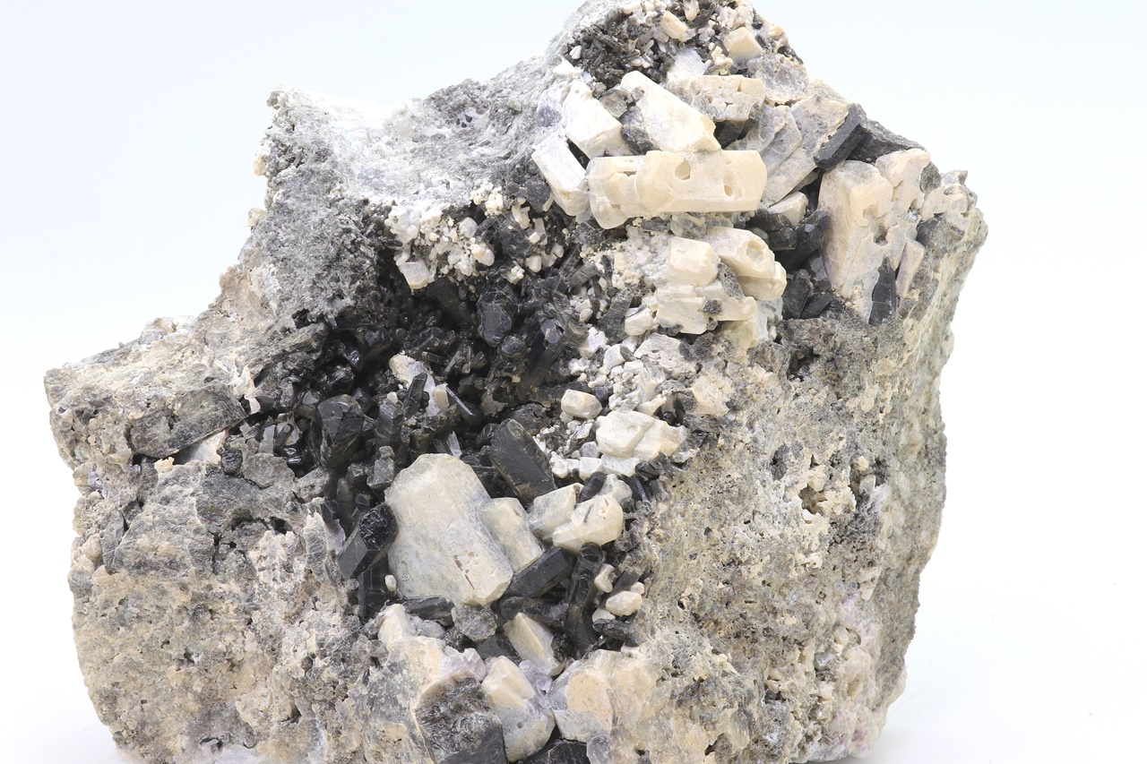 Druse composed of dark green crystals of Diopside and milky-white crystals of the rare Meionite. The largest Meionite crystal is 3 cm large. The specimen is trimmed from the bottom and the back side.