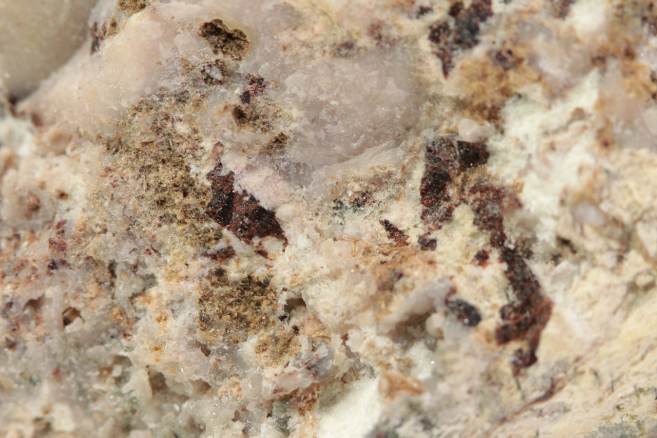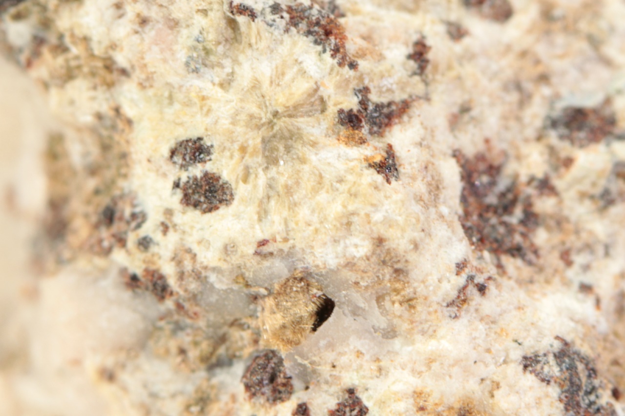 Vzácná ukázka minerální asociace bílého na pohled plstnatého mountainitu (známý pouze z 5 světových lokalit) s červeným lemem s bežovým šupinatým až tabulkovatým bornemanitem (jediná a typová lokalita).