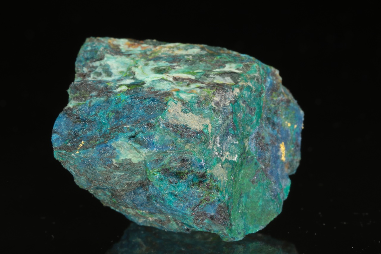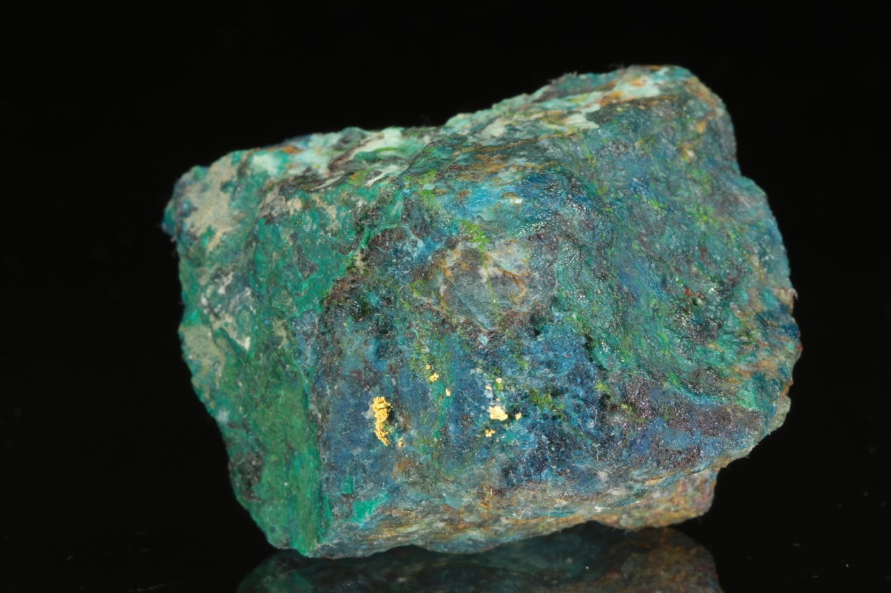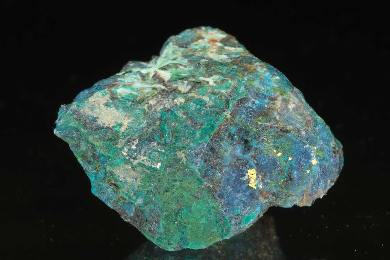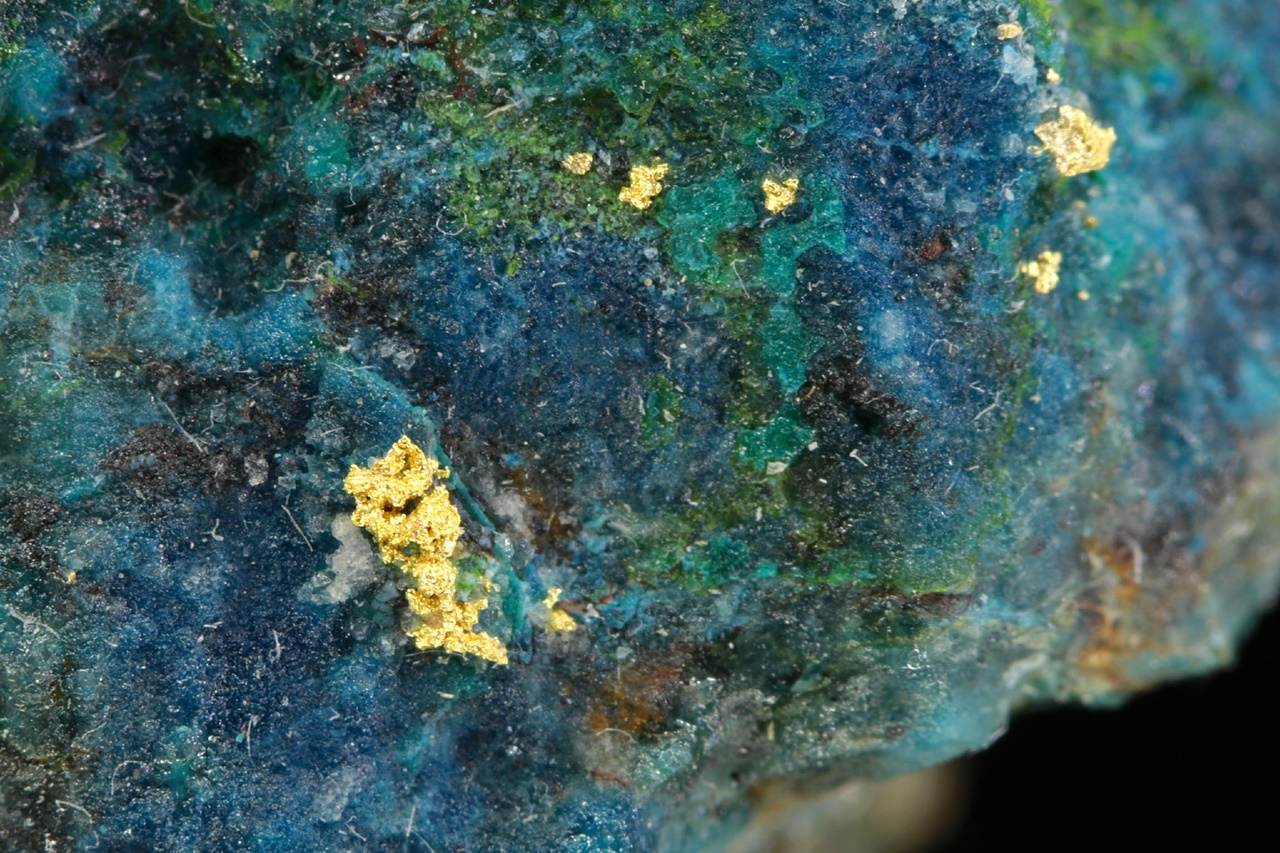 Aggregates of native gold in quartz rock colored blue and green by secondary copper minerals.