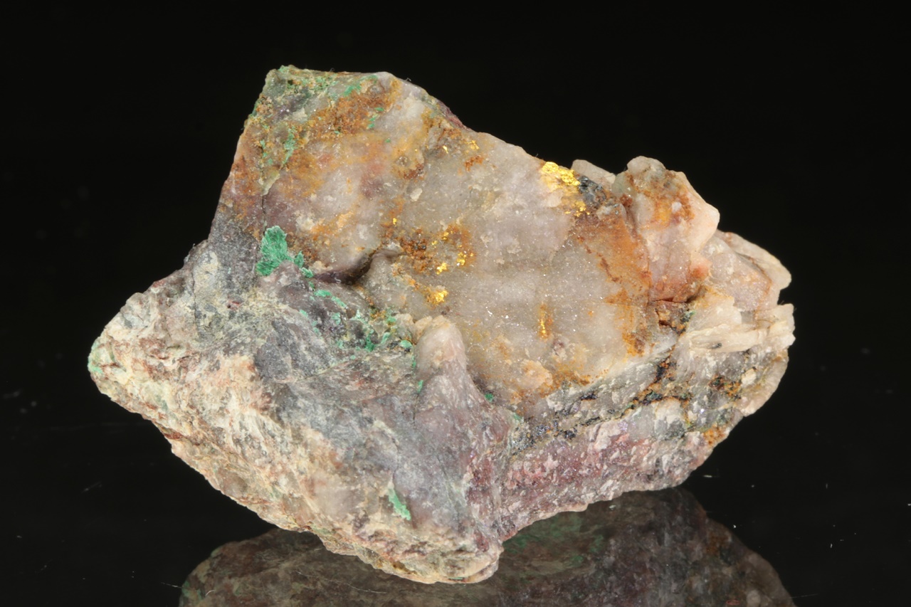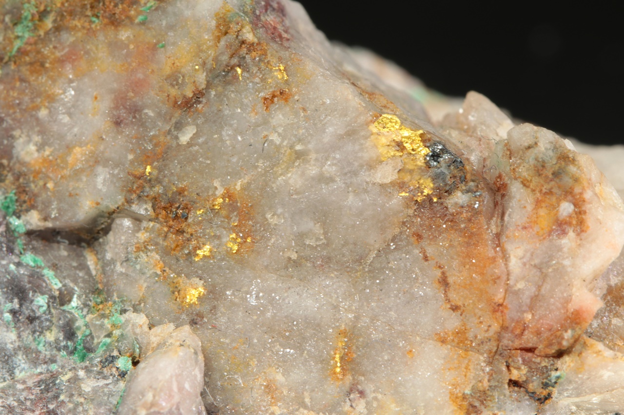 Aggregates of native gold in quartz. The largest aggregate is 3 mm in size .