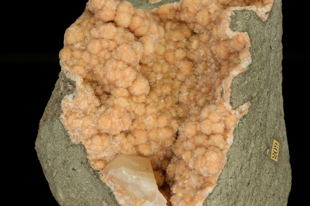 Historický vzorek růžovo oranžových radiálních agregátů natrolitu se světle žlutým kalcitem (2 cm velkým).