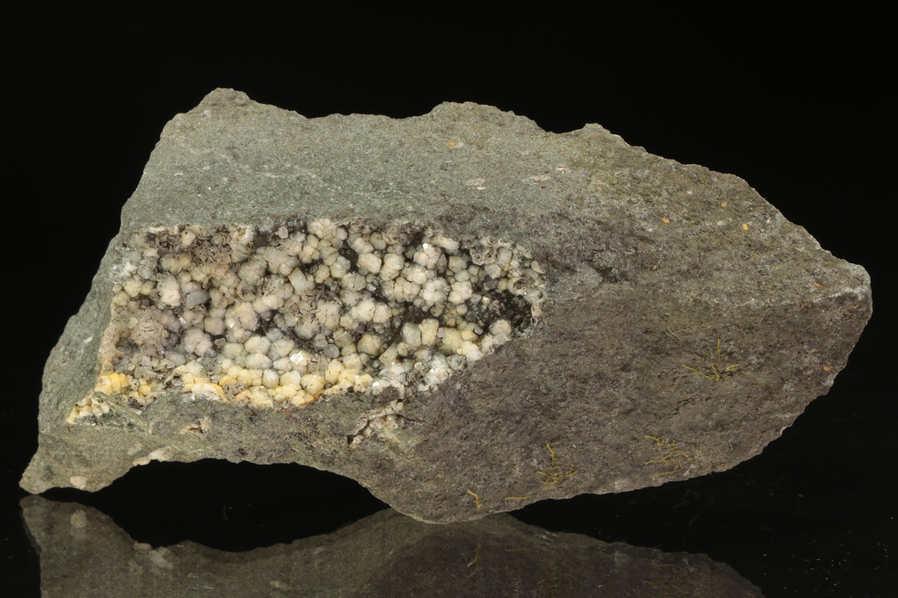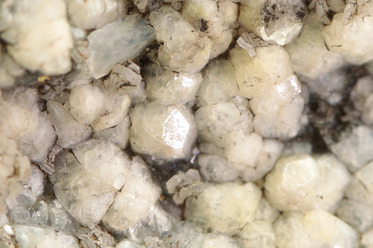 White isometric crystals of analcime with columns of natrolite approximately 3 mm in size and tabular crystals of calcite.