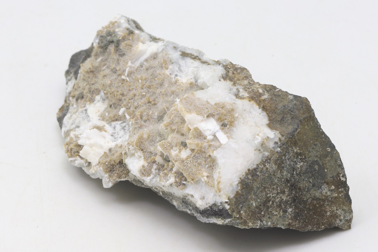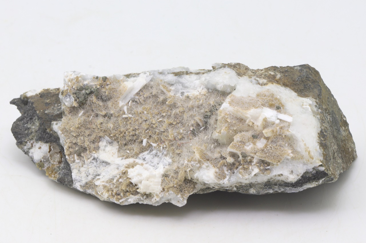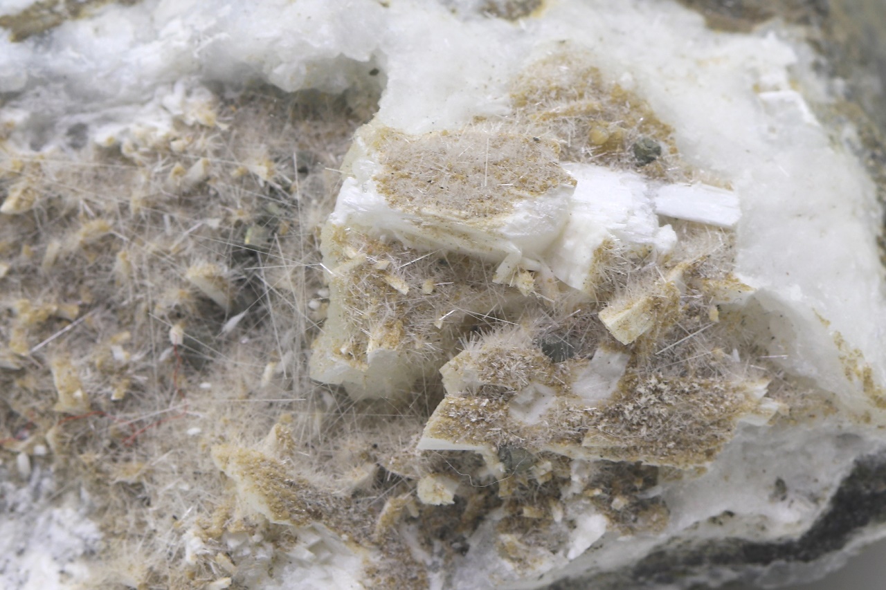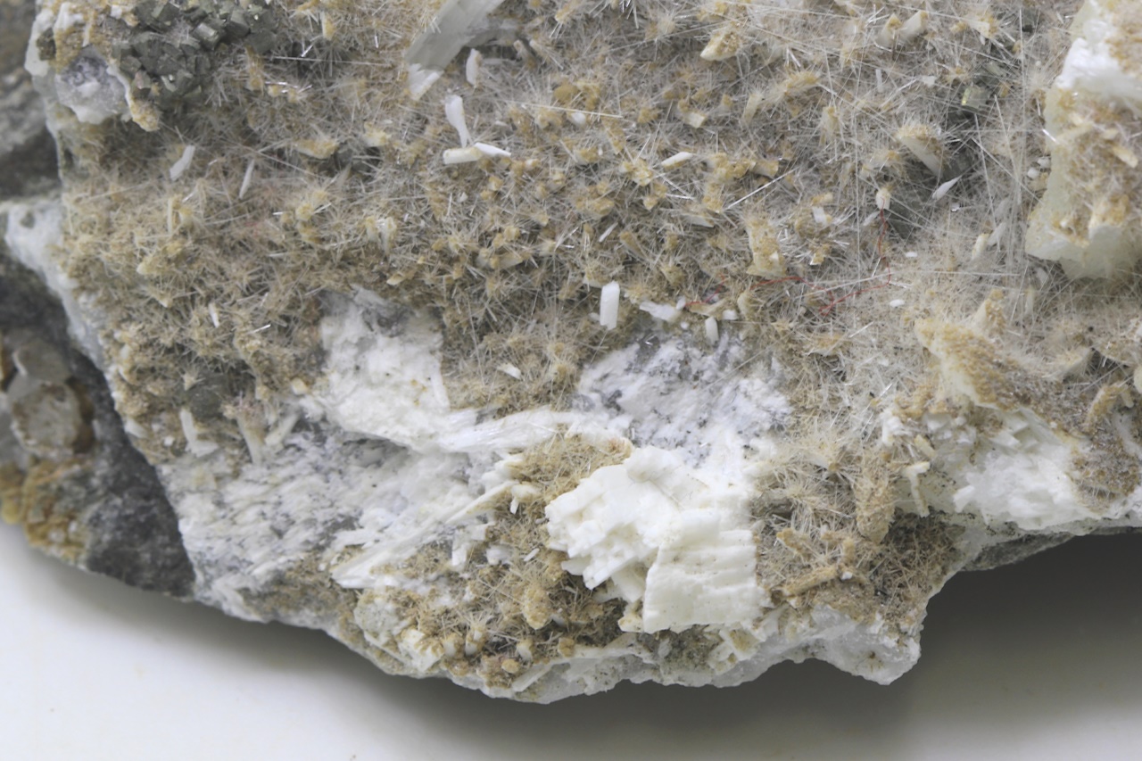 Crystals of white laumontite overgrown with thin, grayish needles of natrolite with a cluster of metallic lustrous pyrite crystals.