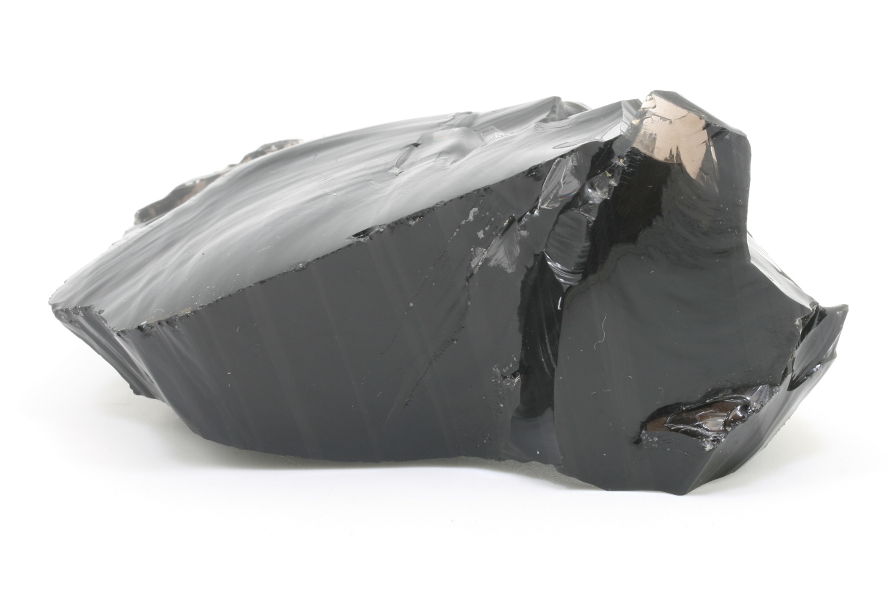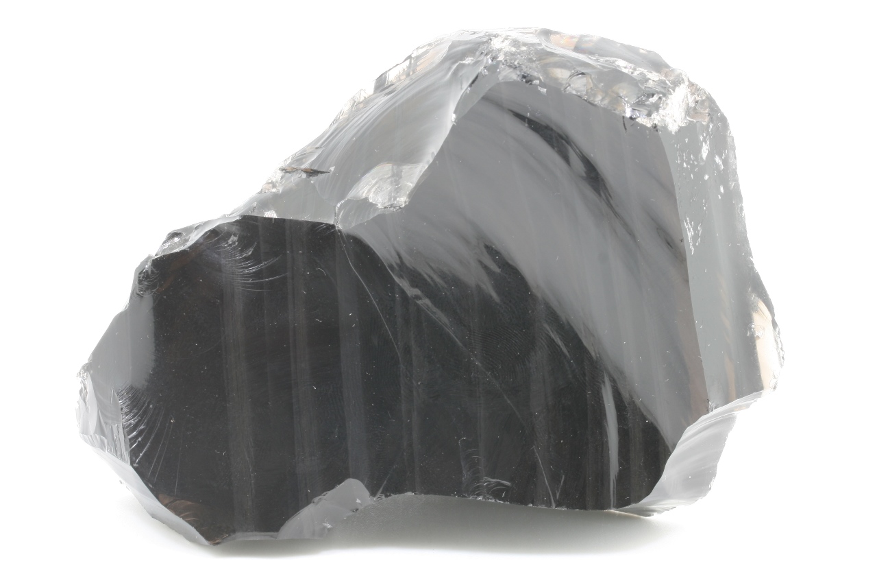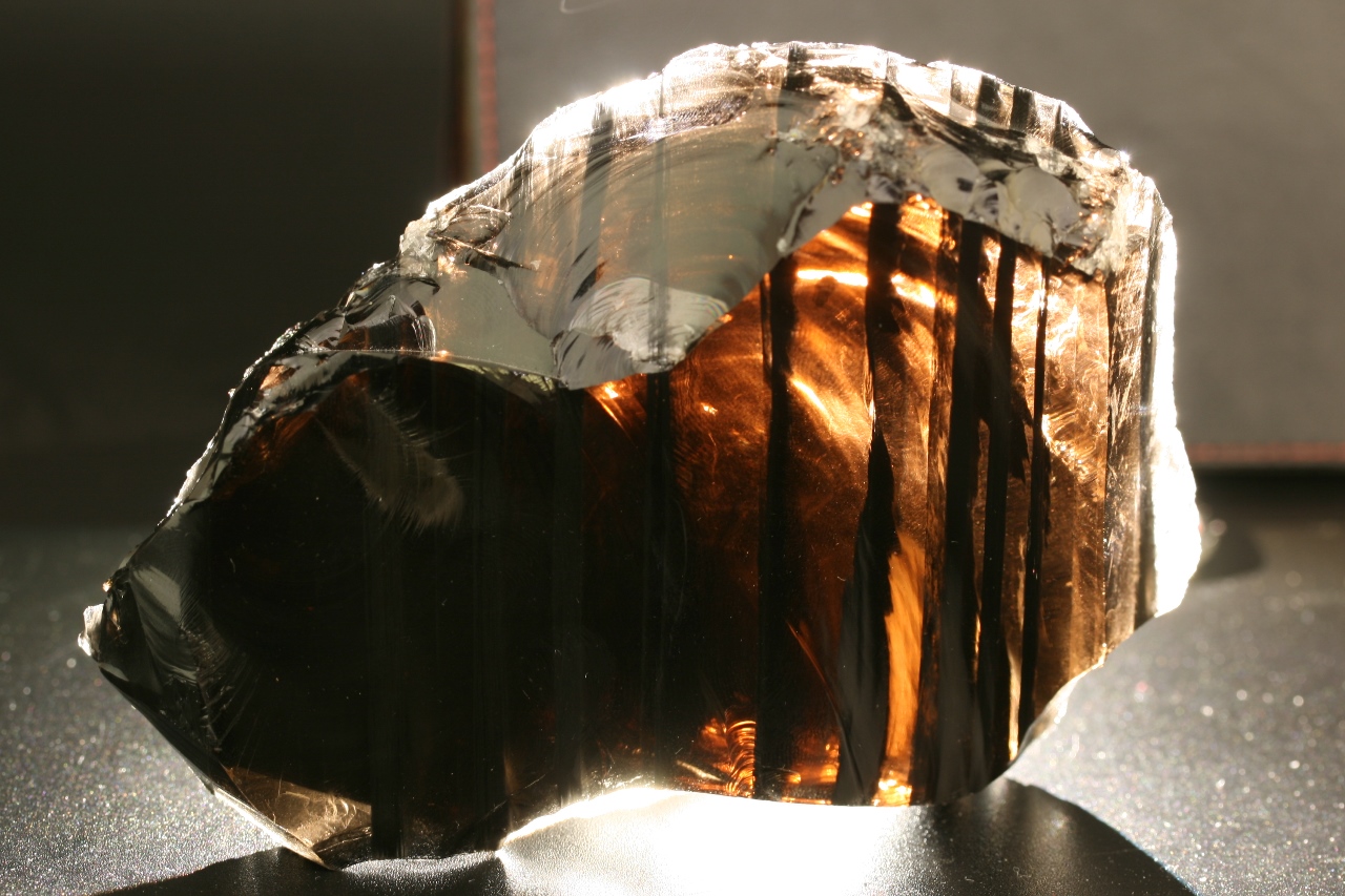 A sample of beautiful, completely pure, perfectly transparent obsidian with a layered structure translucent in purple-brown.