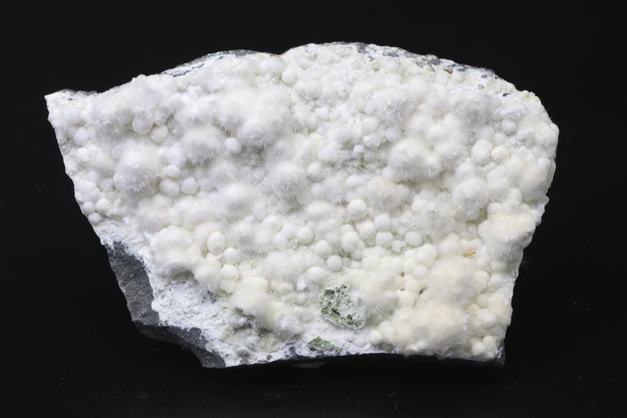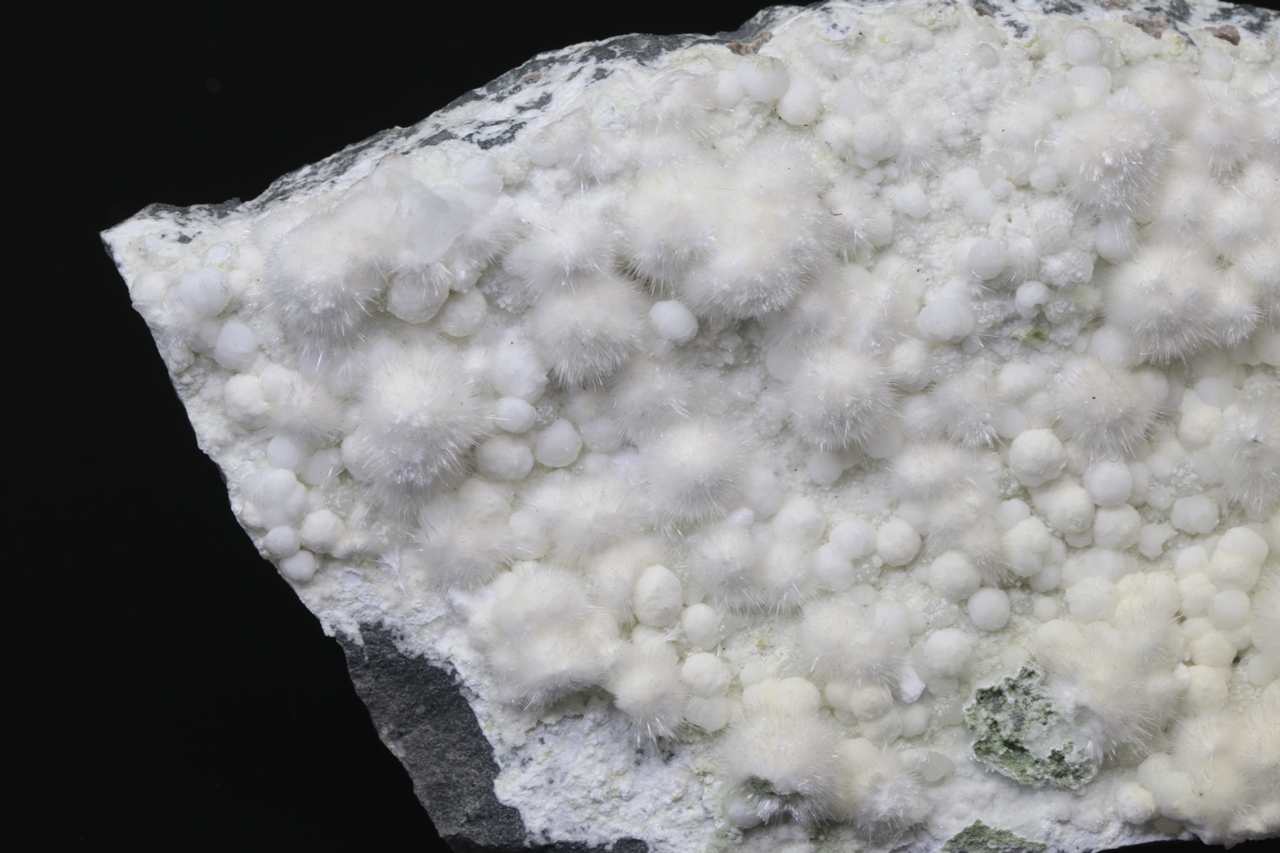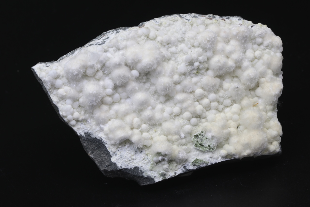 Okenite in the sample forms silky, whitish spherical aggregates, which reach sizes of up to 1 cm and grow on dark substrate rock. Due to the combination of whitish and gray colors, this sample is very aesthetic. It is also a very rich sample, with individual spherical aggregates growing on each other, reaching various sizes. This sample comes from the worldwide known zeolite locality of Poona, India. The sample is undamaged.