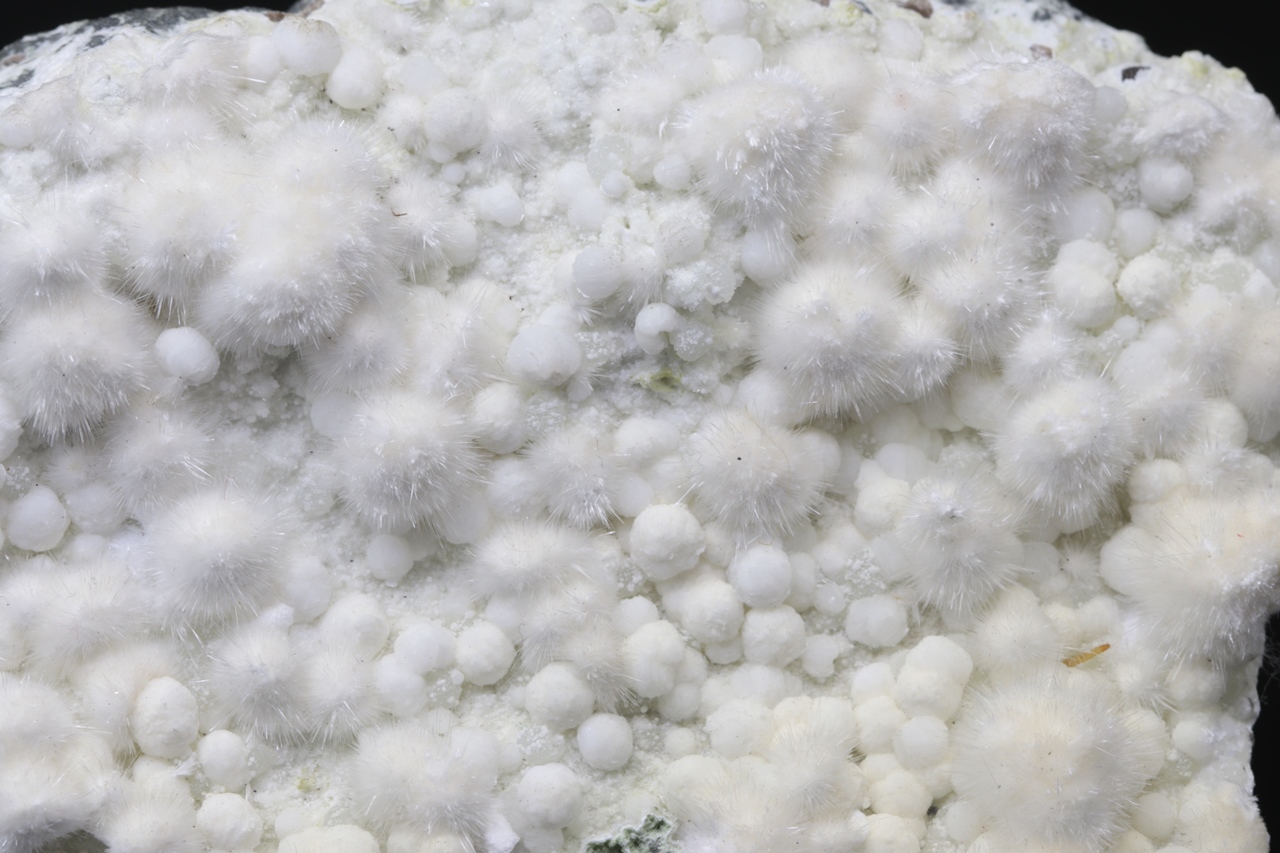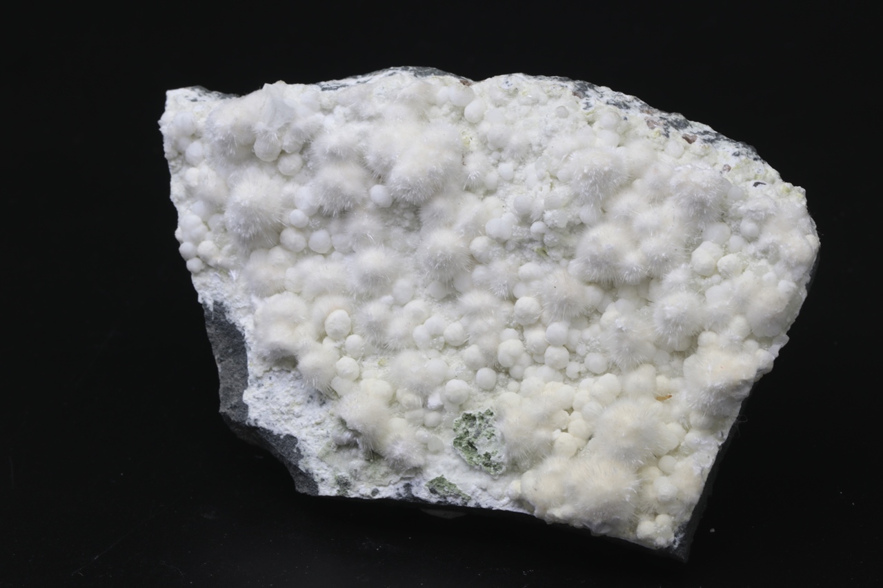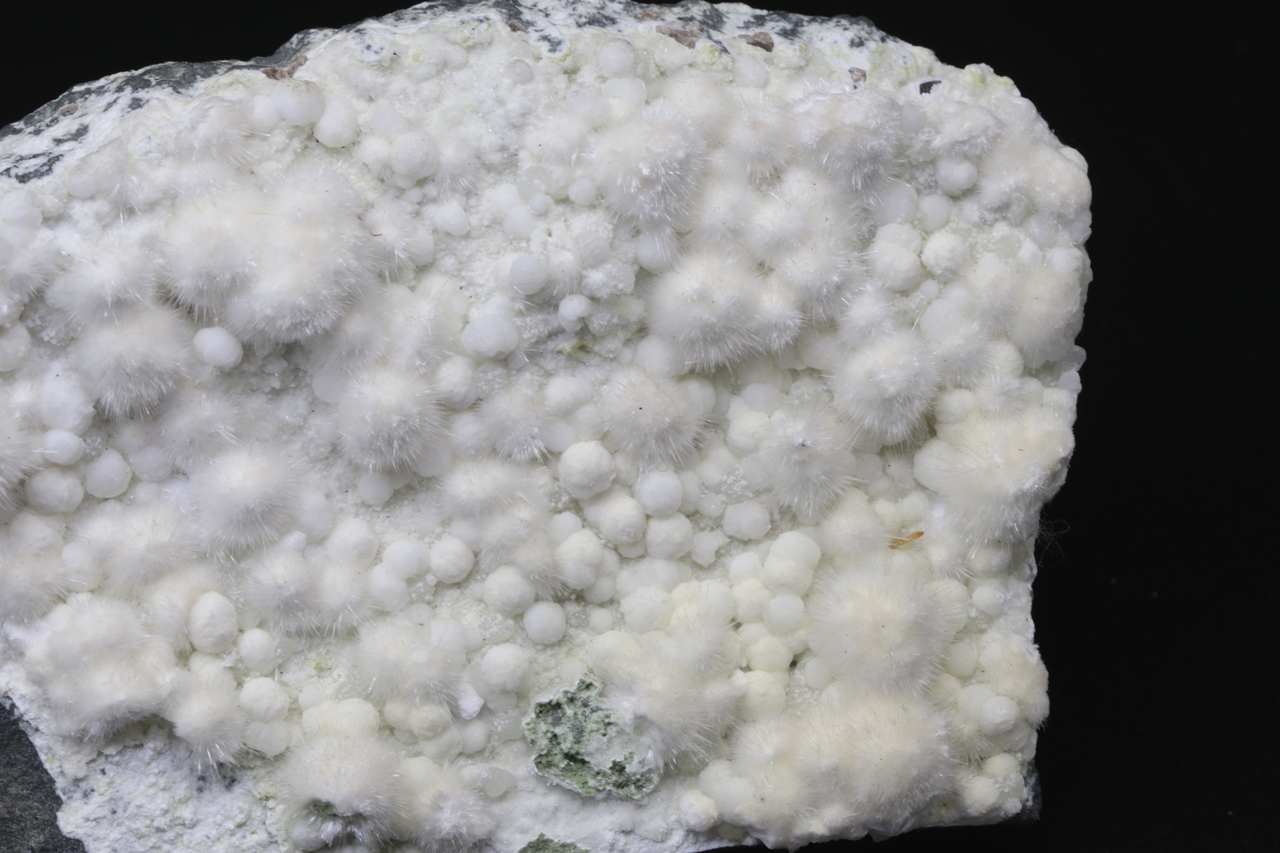 Okenite in the sample forms silky, whitish spherical aggregates, which reach sizes of up to 1 cm and grow on dark substrate rock. Due to the combination of whitish and gray colors, this sample is very aesthetic. It is also a very rich sample, with individual spherical aggregates growing on each other, reaching various sizes. This sample comes from the worldwide known zeolite locality of Poona, India. The sample is undamaged.
