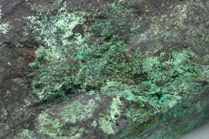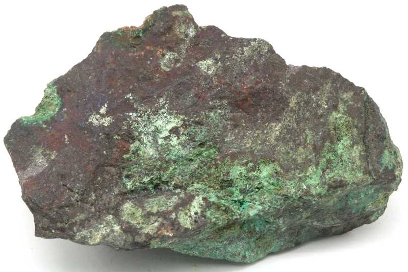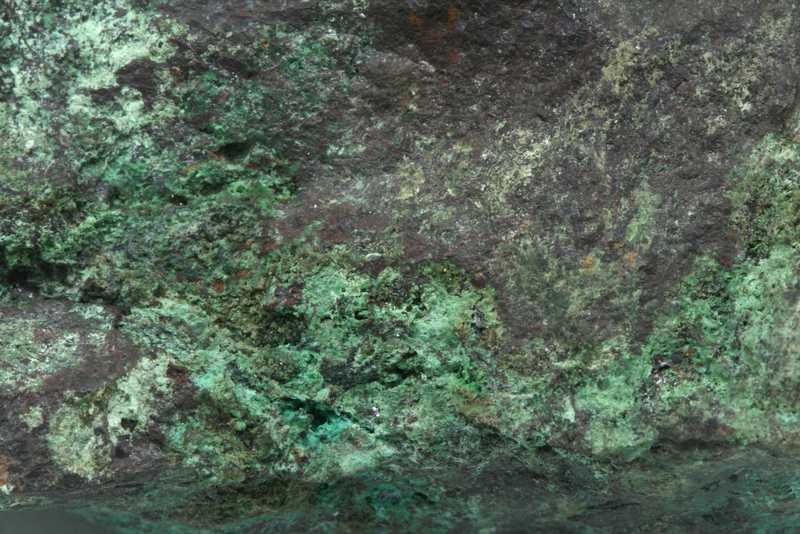 Sample of the not-so-common arsenate of copper, olivenite and cuprite. Sample of dark green aggregates and coatings of olivenite from Běloves near Náchod, Czech Republic.