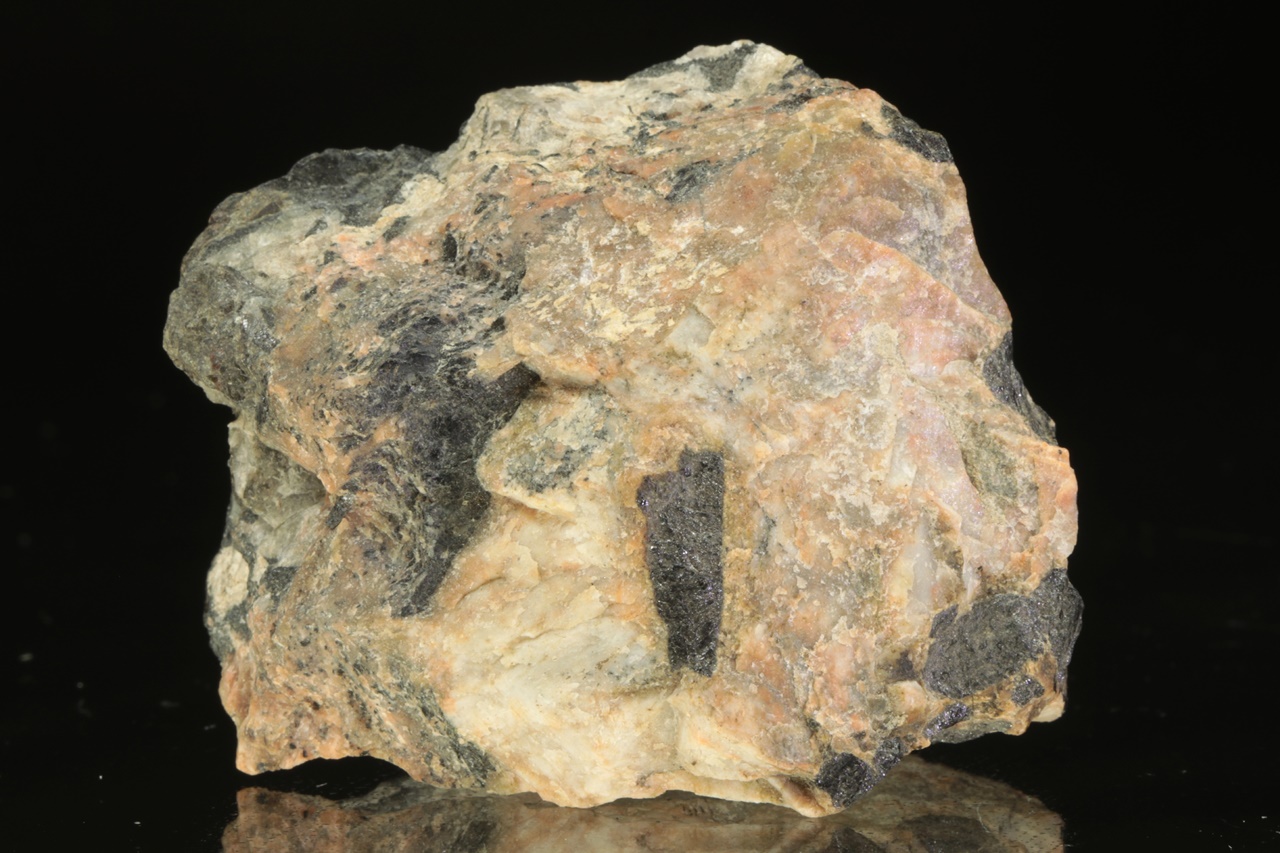 Large black grains of a rare earth mineral from the epidote group. The specimen comes from the 1960s from a now defunct quarry. The largest grain is 14 mm in size.
