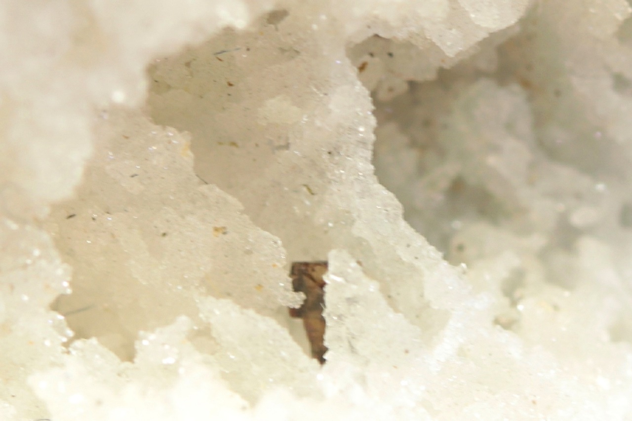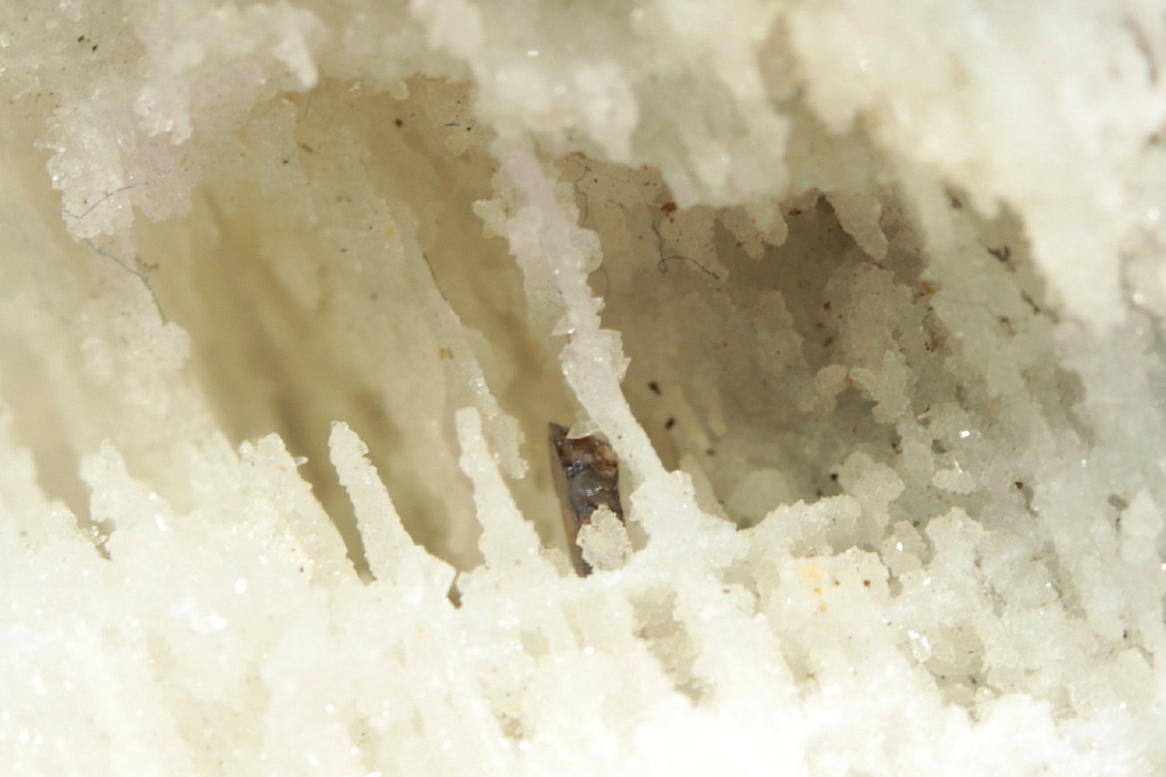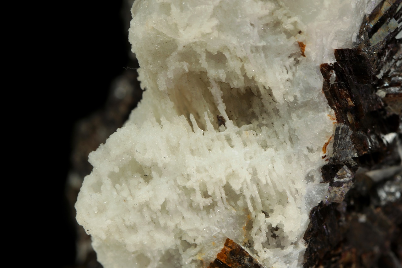 Thin, bladed crystals of pachnolite growing on white thomsenolite.