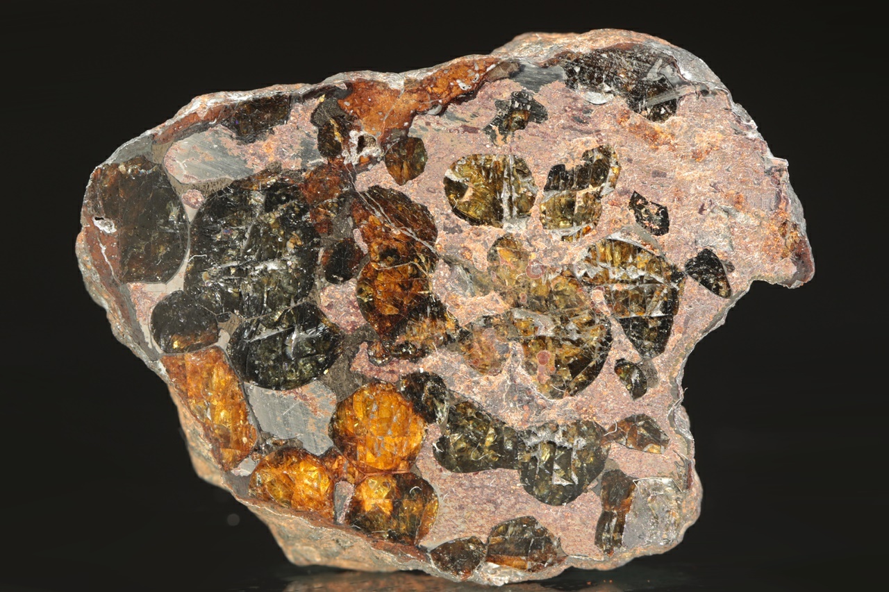Polished on one side, a meteorite sample composed of olivine grains in a nickel-iron matrix. This type of meteorite is very attractive because of its pattern and is not too abundant in nature. The weight of the meteorite is 31.9 g.