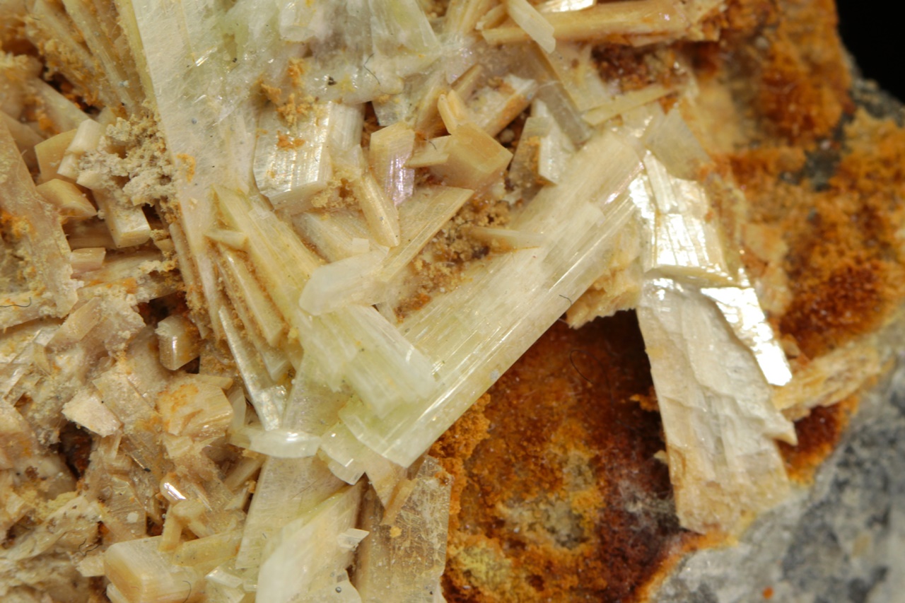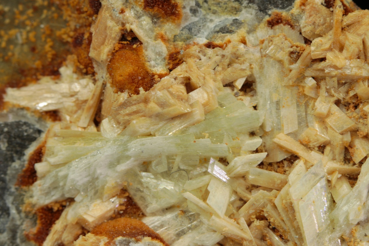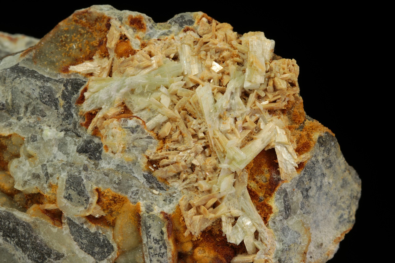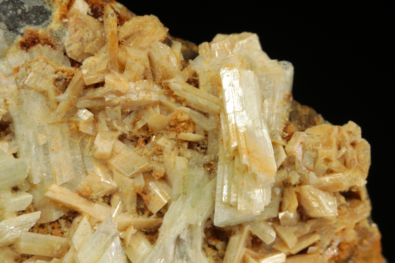 Pearlescent, greenish crystals of paravauxite replaced by darker beige sigloite. This locality is the type locality for sigloite. The largest crystal of paravauxite on the top edge of the sample is 1 cm in size.