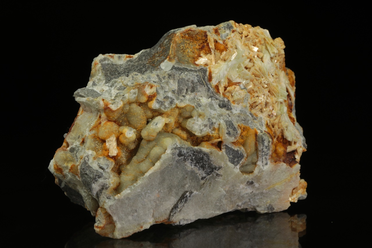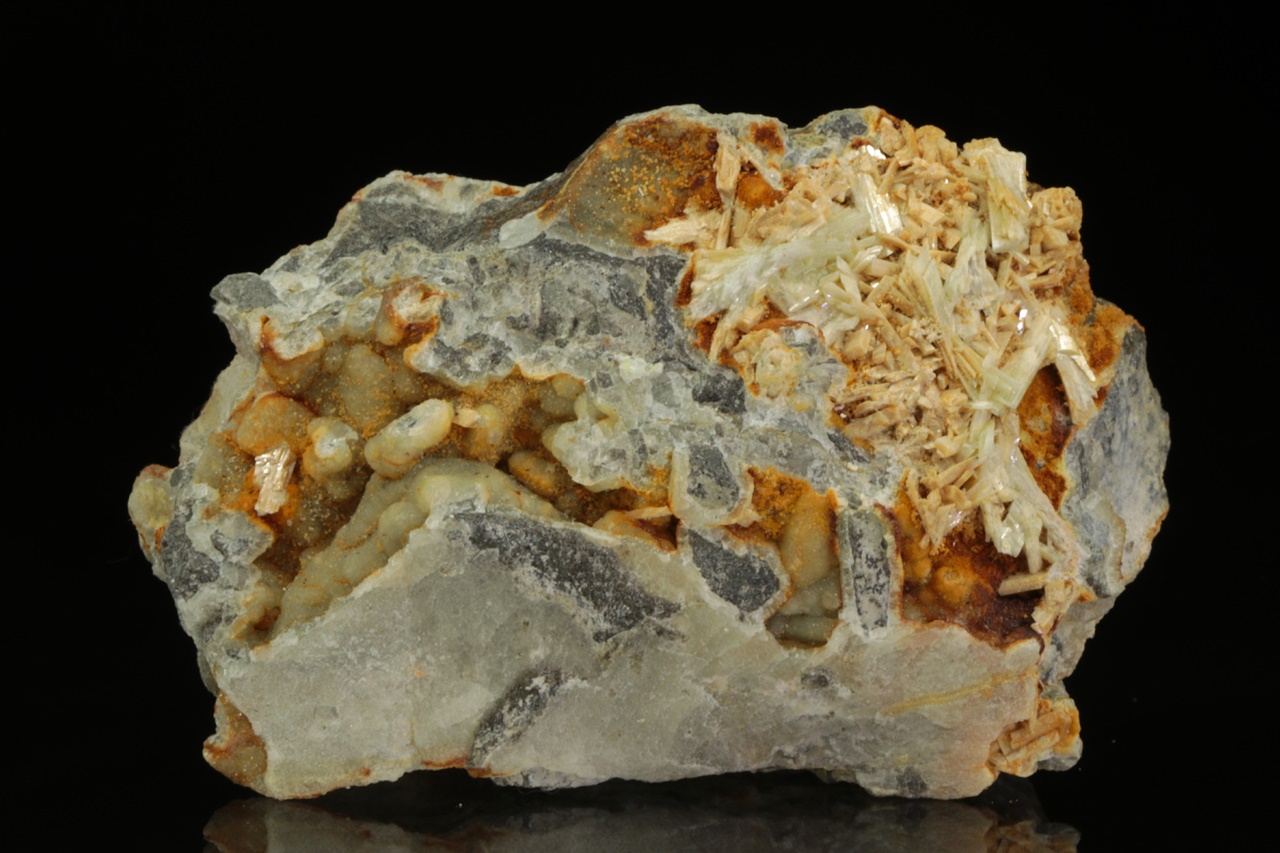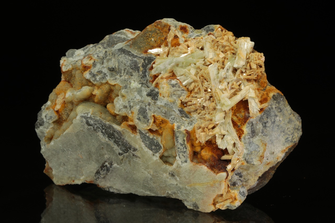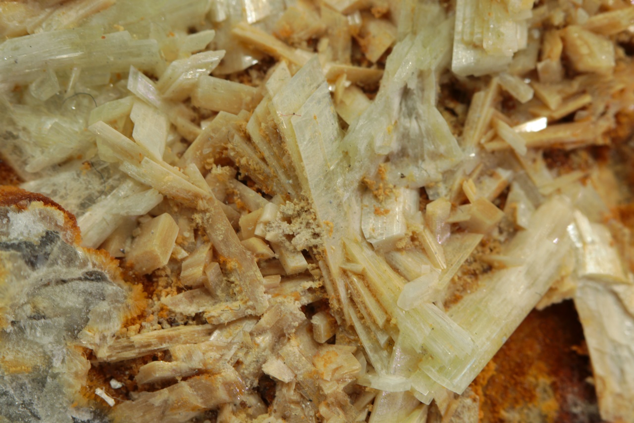Pearlescent, greenish crystals of paravauxite replaced by darker beige sigloite. This locality is the type locality for sigloite. The largest crystal of paravauxite on the top edge of the sample is 1 cm in size.