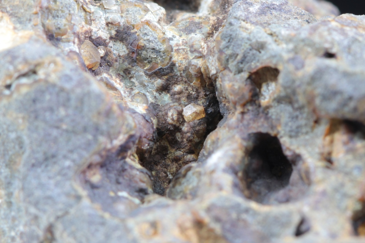 Up to 1 mm large crystals of yellow paulingite grown in the cavities of tuff.