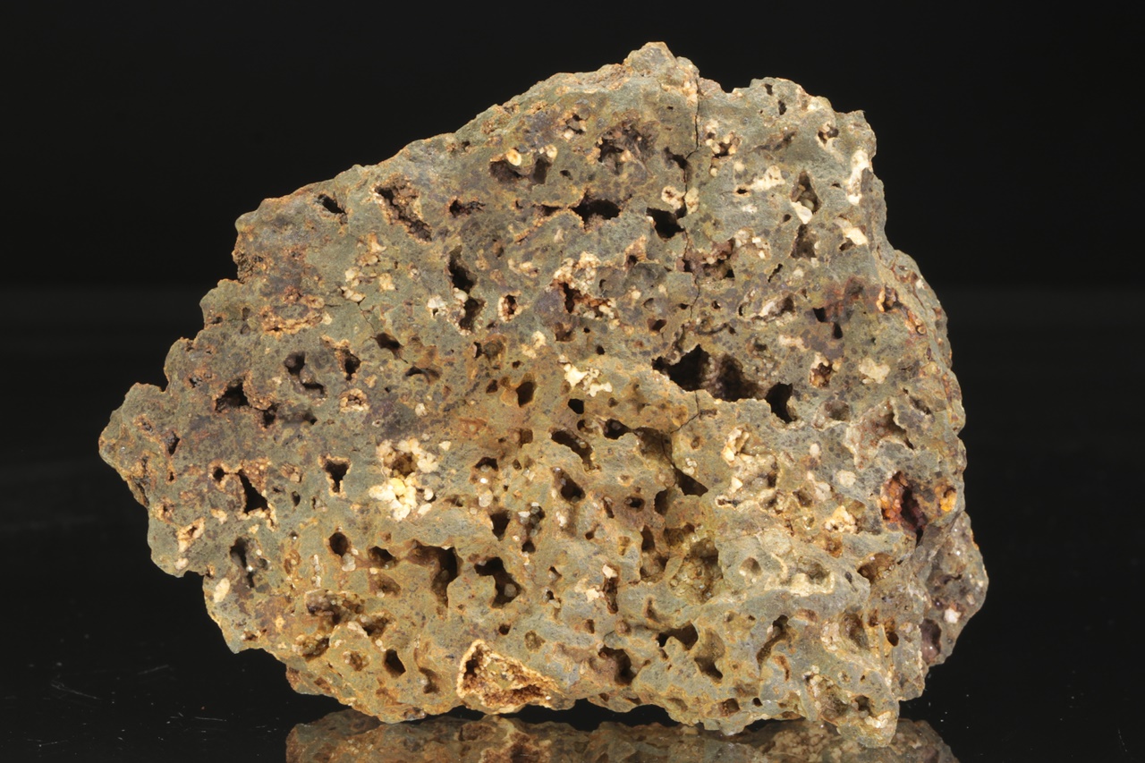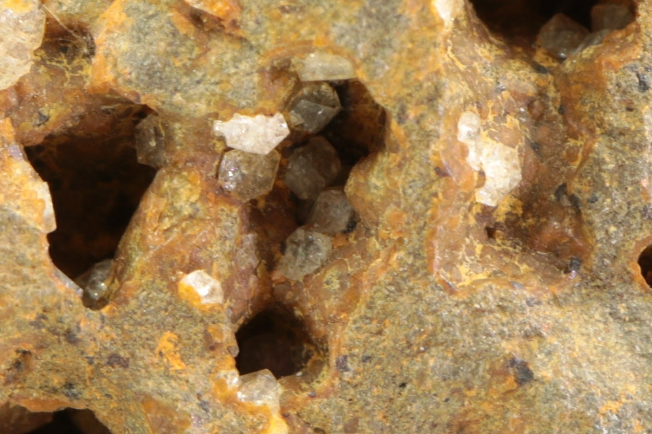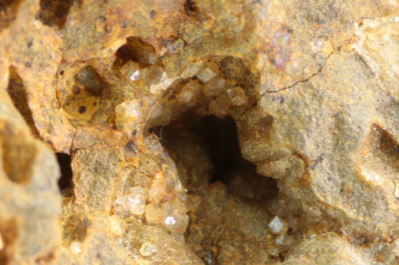 Transparent, glossy, yellow paulingite crystals approximately 1 mm in size grown in cavities of tuff.