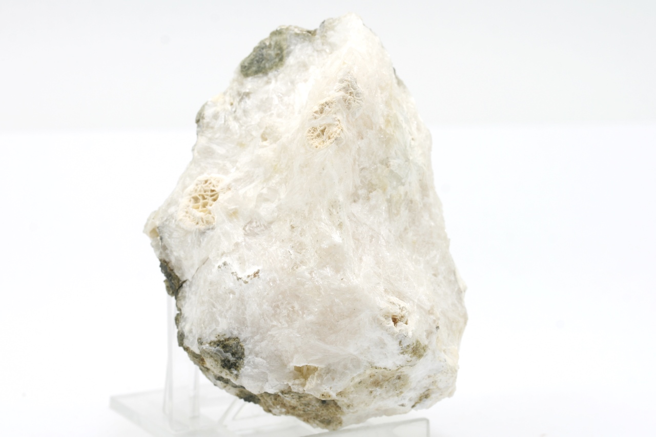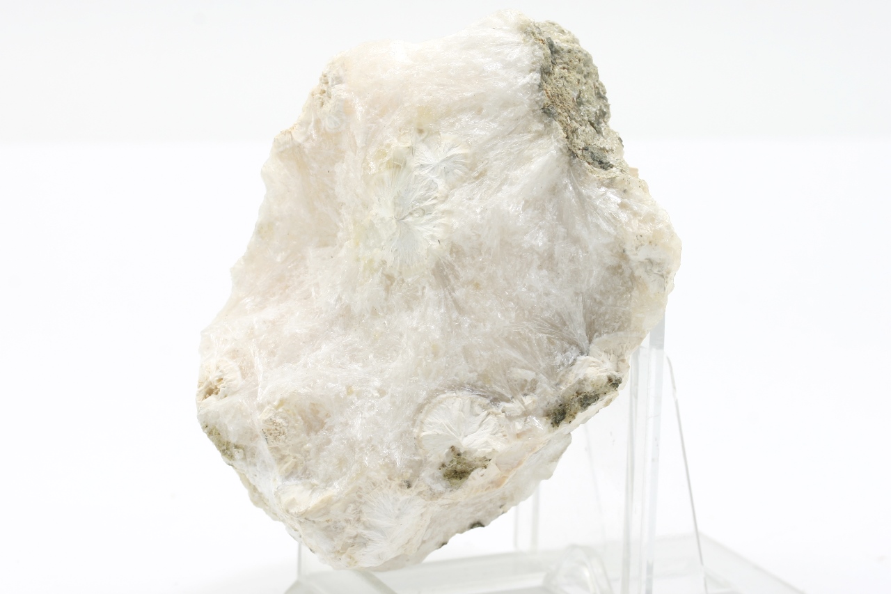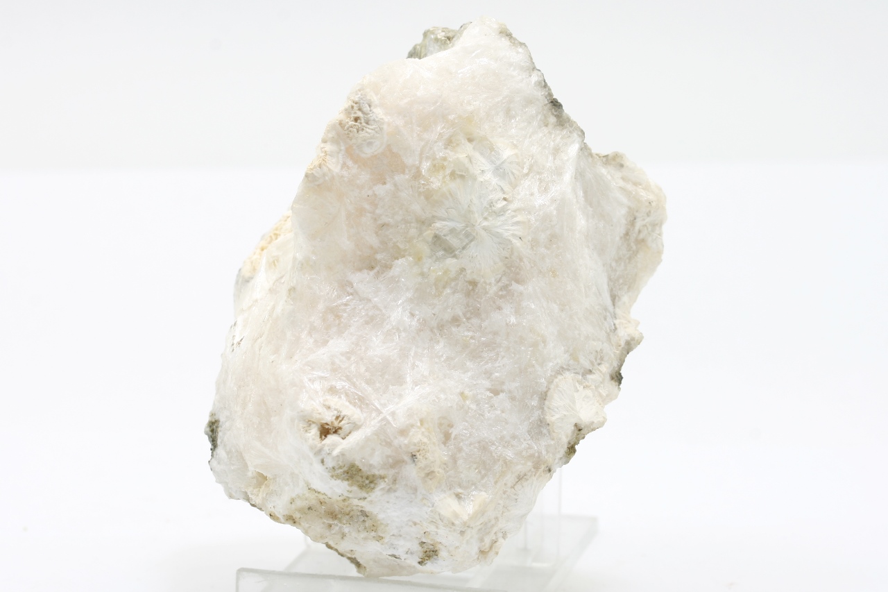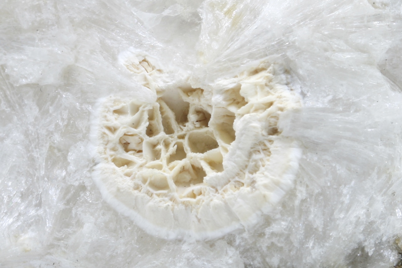 Chalk-white radial aggregates of pectolite with frosted natrolite .