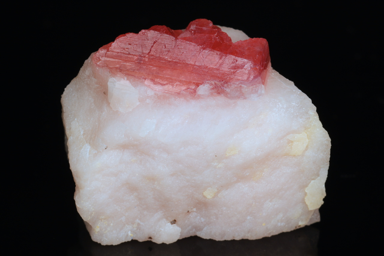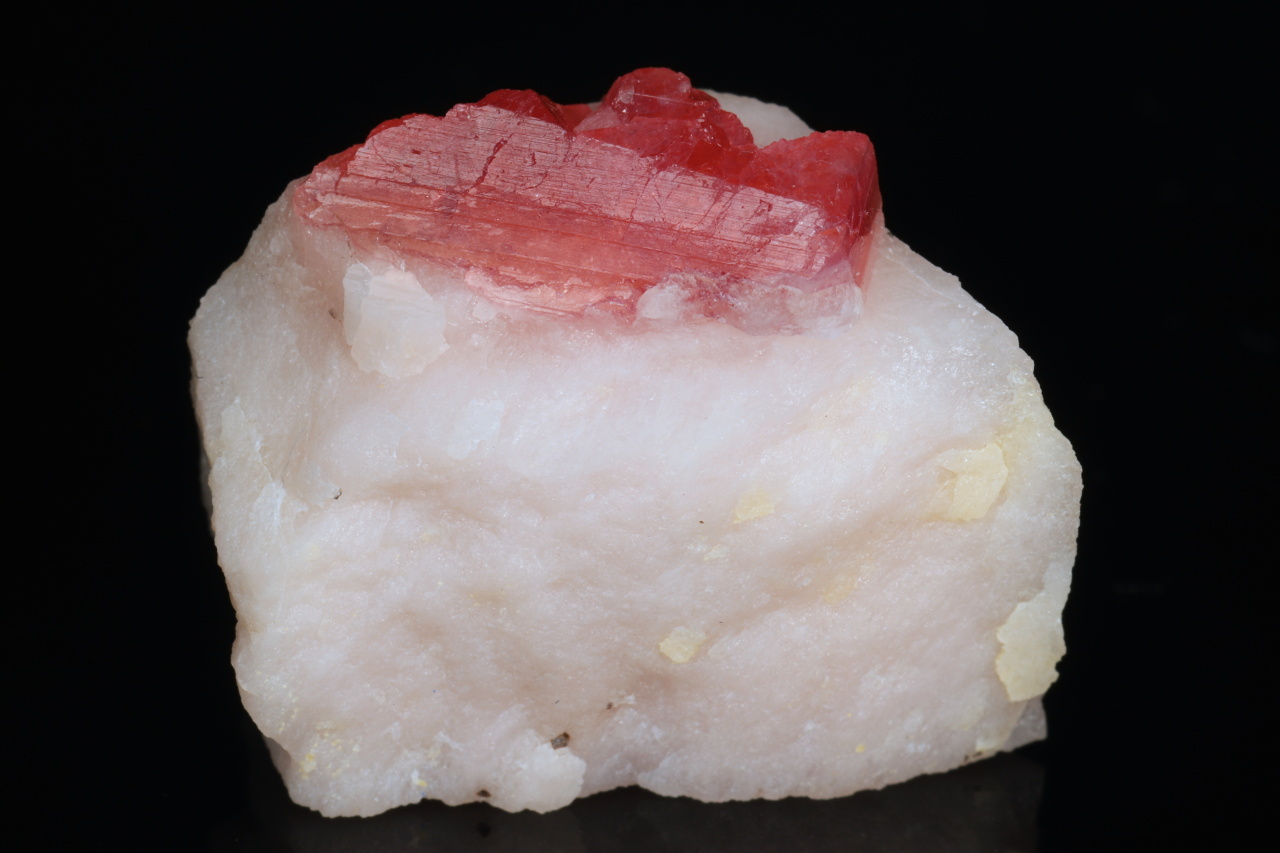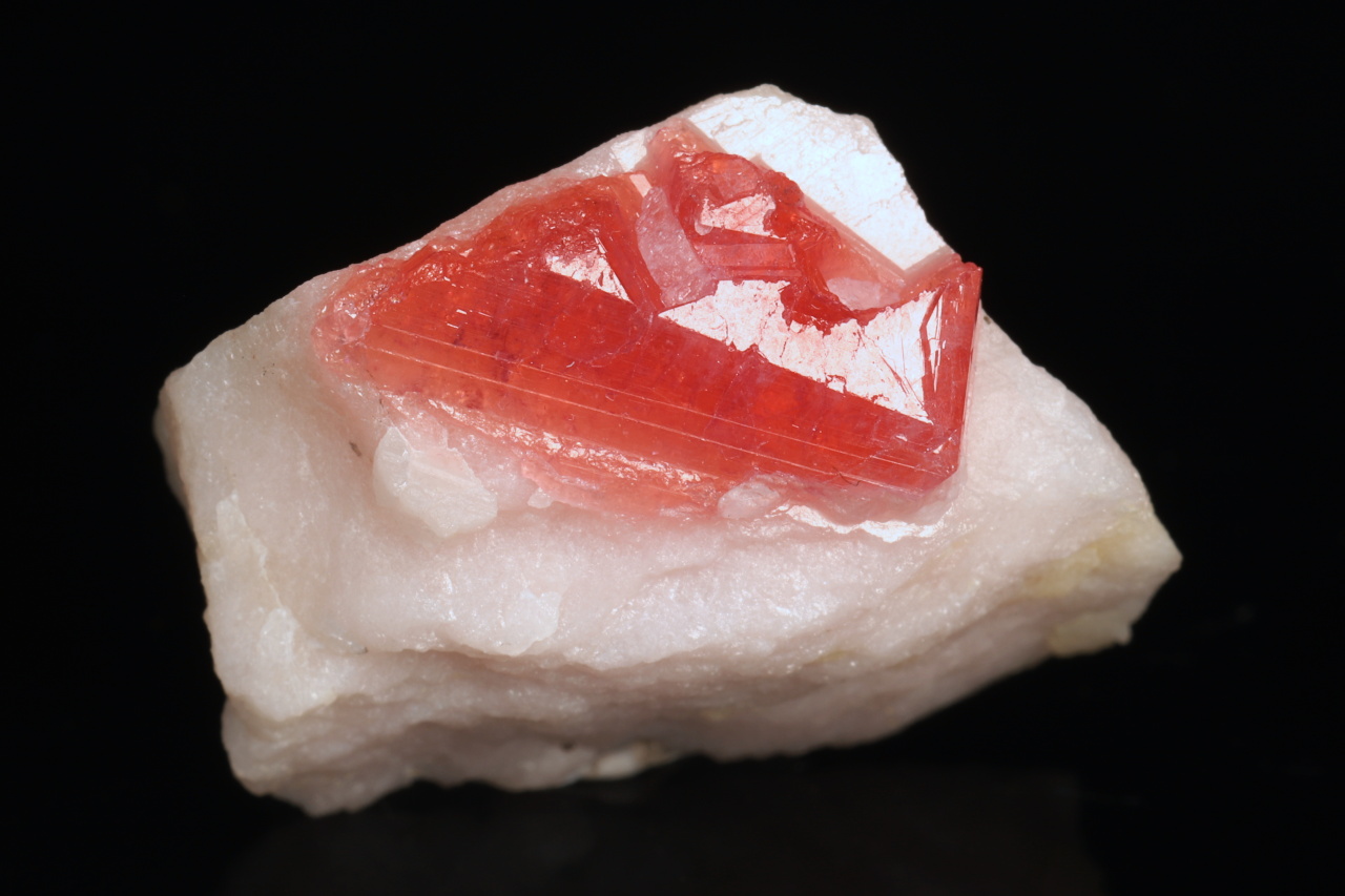 A small specimen of beautiful deep red crystals of extremely rare pezzottite. This mineral has only a few deposits in the world and was named in 2003 after mineralogist Federico Pezzotta, who has been working in Madagascar for a long time. It is a mineral from the beryl group, which is trigonal (as opposed to hexagonal beryl) and contains lithium and cesium. A very nice specimen from Madagascar.