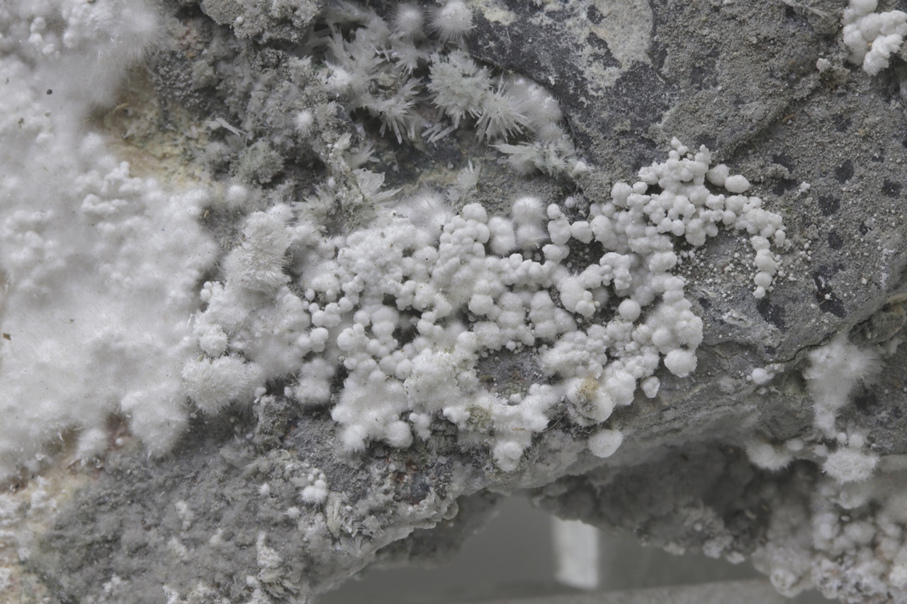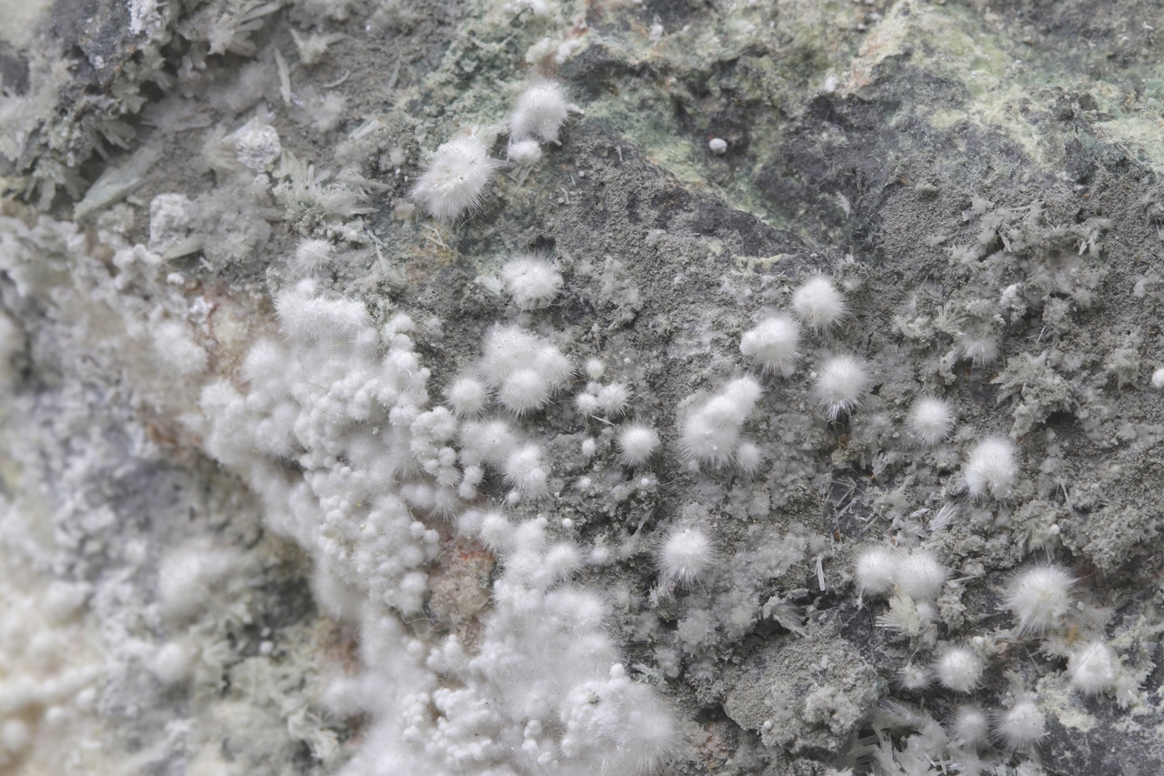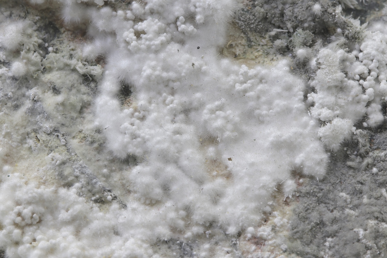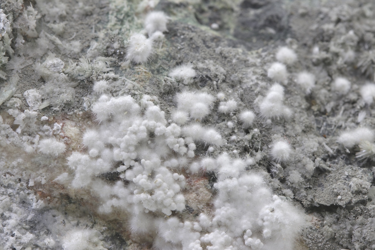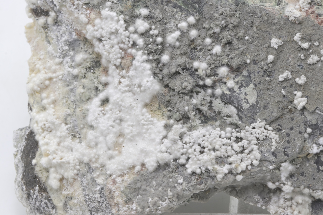 Pikrofarmakolit forms hemispherical aggregates, silken white in color, which are composed of fine needles of this mineral. Individual aggregates of pikrofarmakolit on this sample also often cluster together, creating accumulations and overlay on a grayish base rock. This is a rich specimen of this mineral from the Svornost mine in Jáchymov.