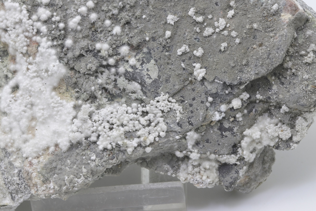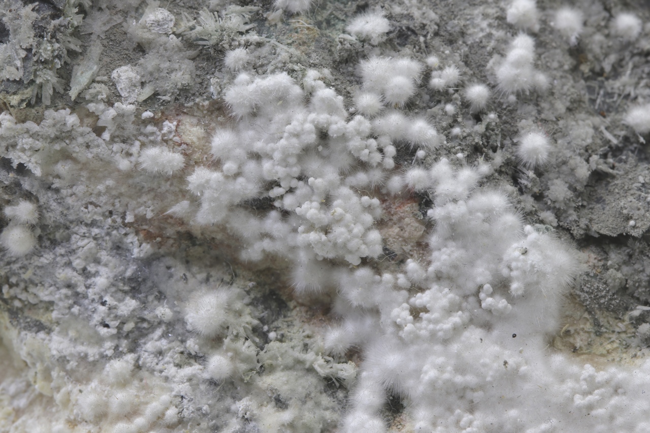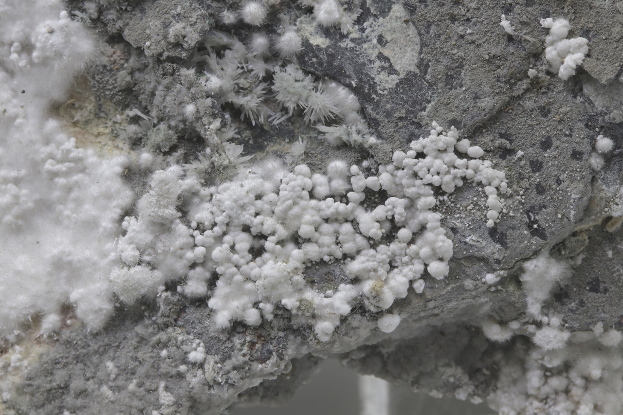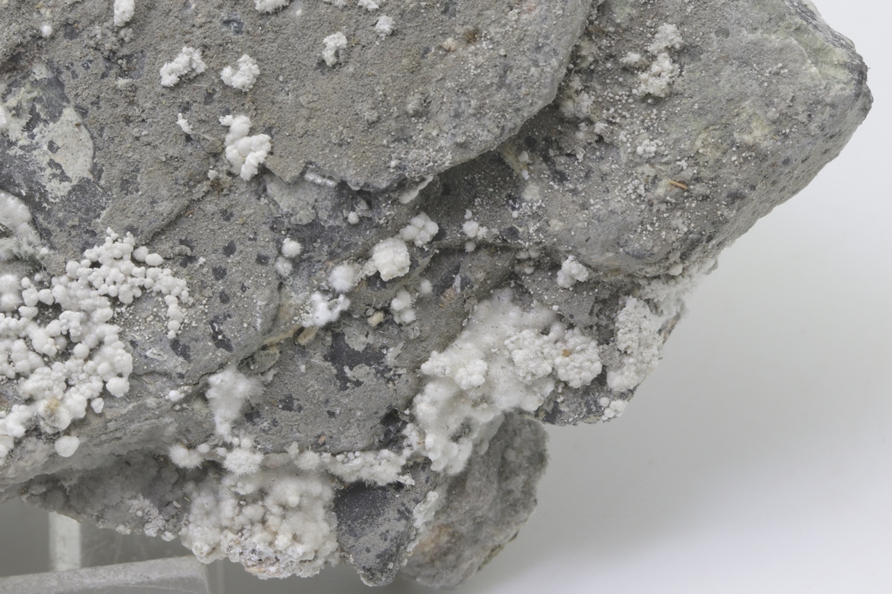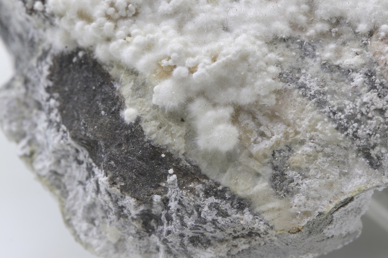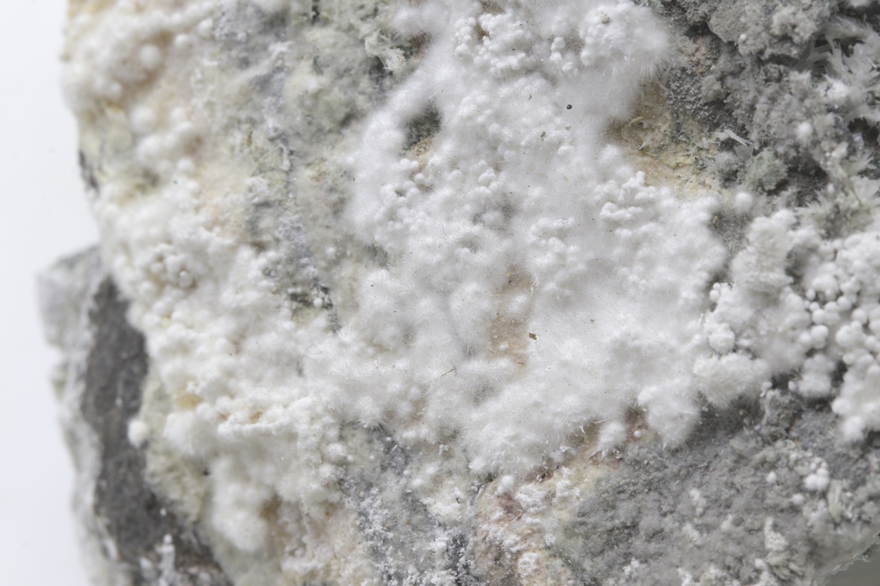 Pikrofarmakolit forms hemispherical aggregates, silken white in color, which are composed of fine needles of this mineral. Individual aggregates of pikrofarmakolit on this sample also often cluster together, creating accumulations and overlay on a grayish base rock. This is a rich specimen of this mineral from the Svornost mine in Jáchymov.