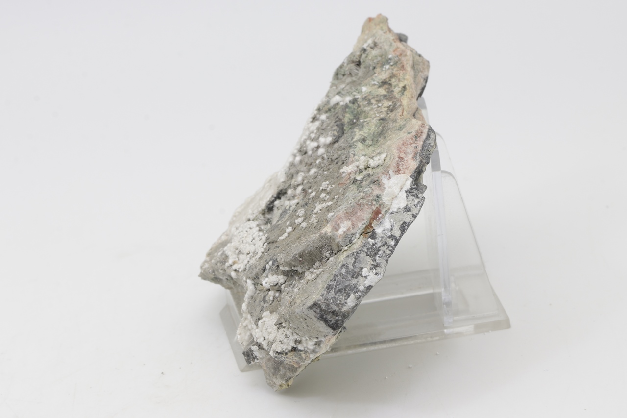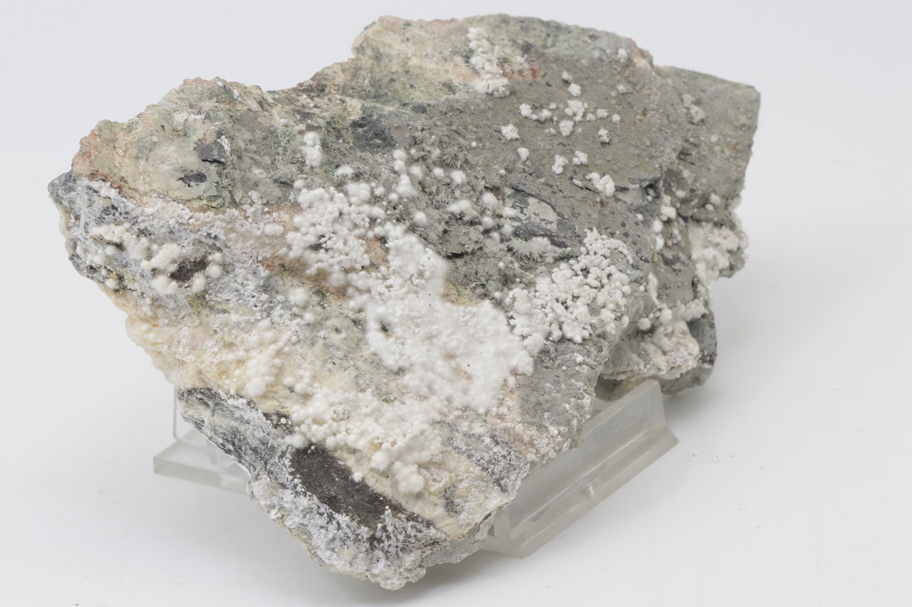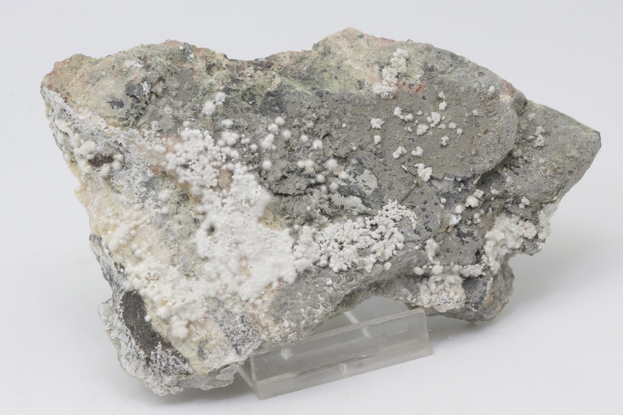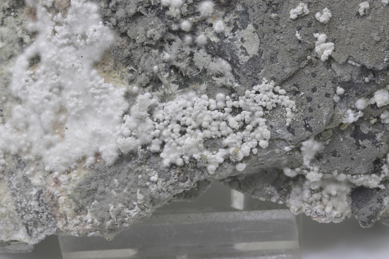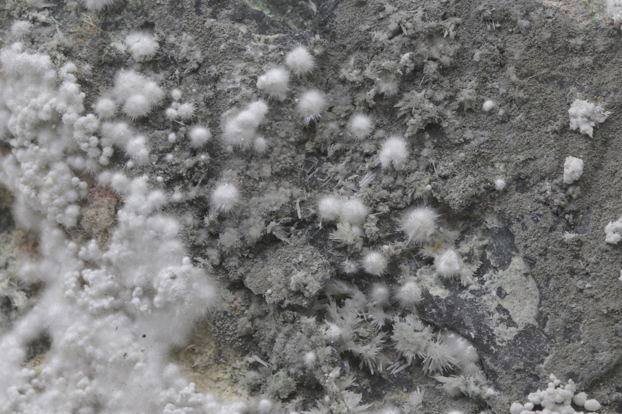 Pikrofarmakolit forms hemispherical aggregates, silken white in color, which are composed of fine needles of this mineral. Individual aggregates of pikrofarmakolit on this sample also often cluster together, creating accumulations and overlay on a grayish base rock. This is a rich specimen of this mineral from the Svornost mine in Jáchymov.