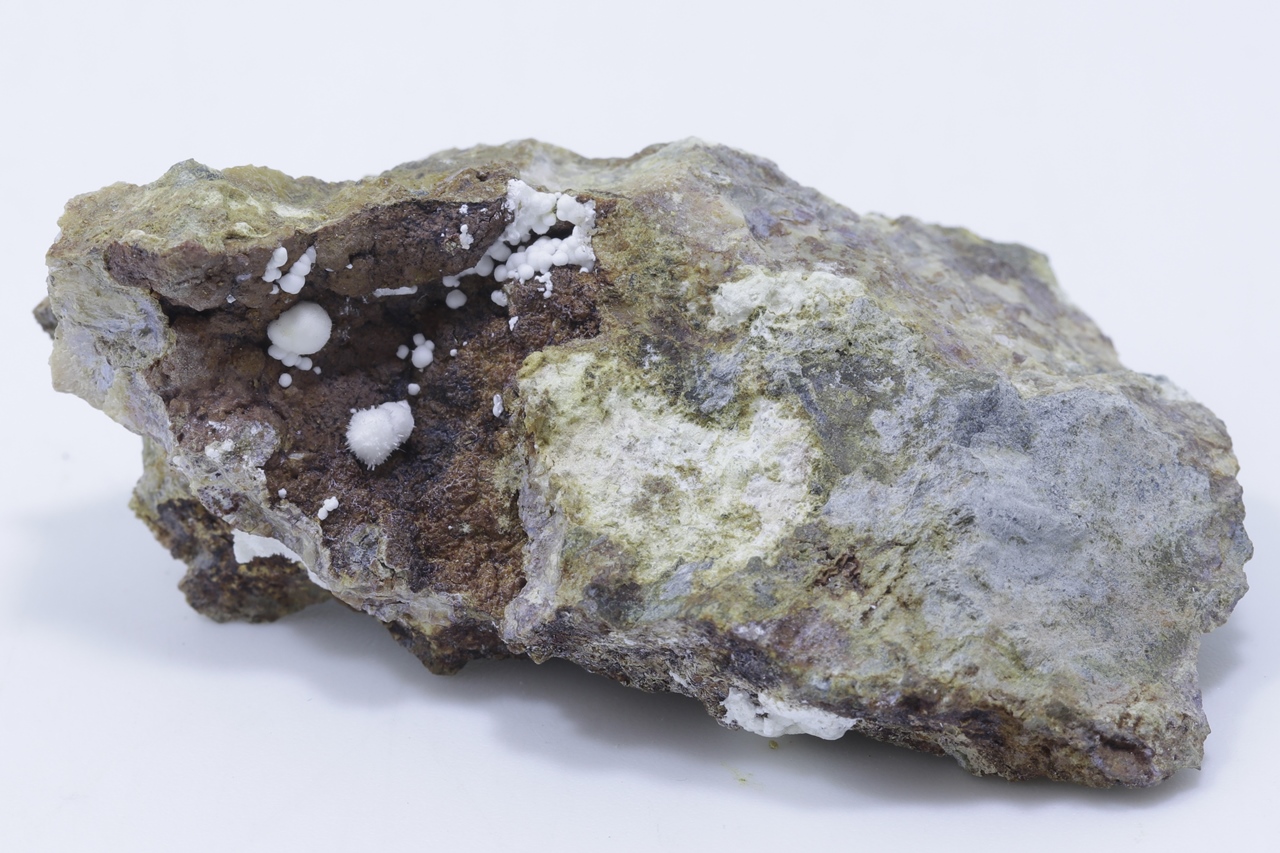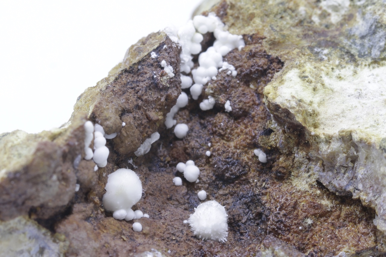 Radial aggregates of chalk-white Pikropharmacolite up to 3 mm large, grown in a contrasting brown cavity.