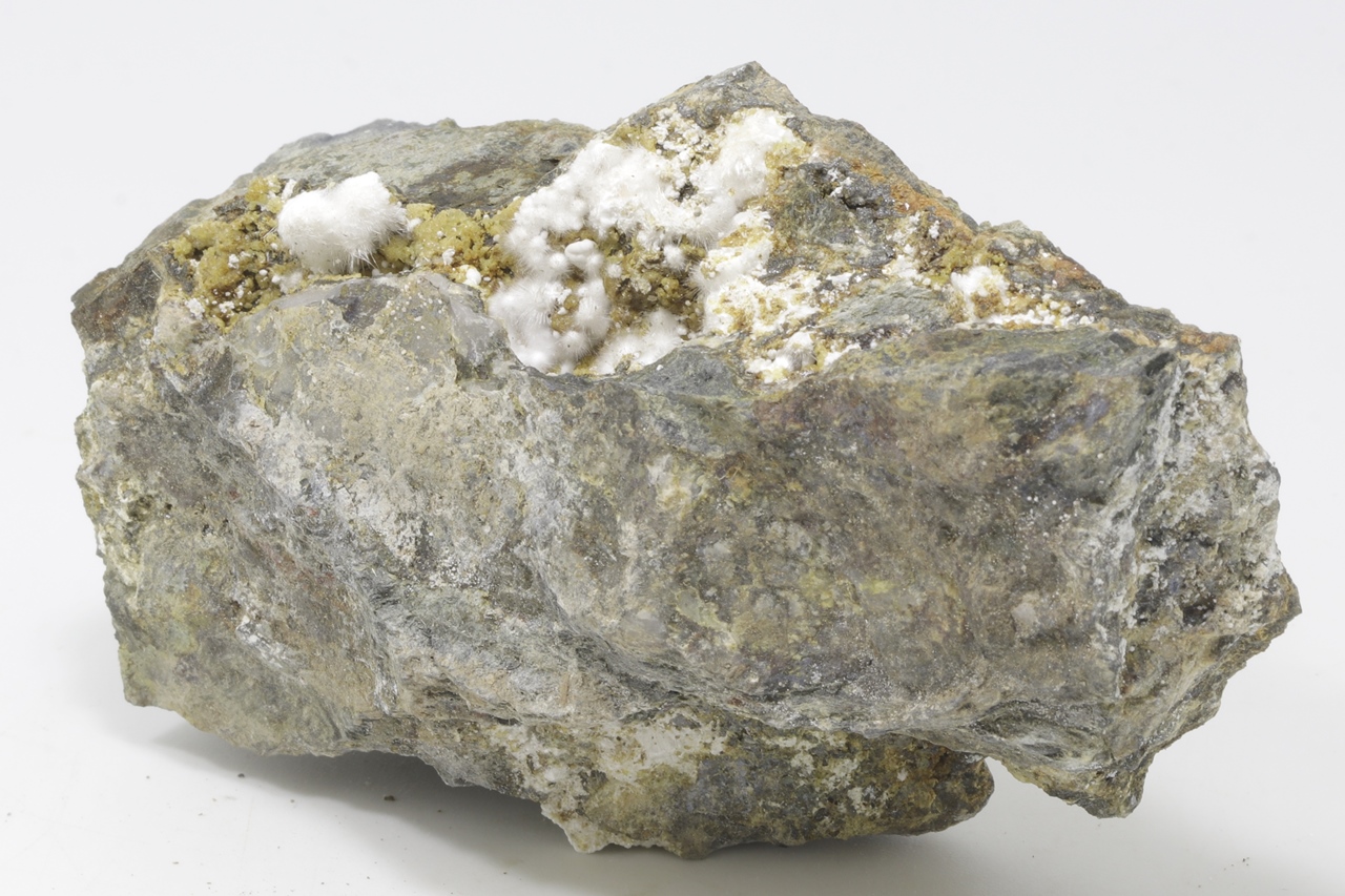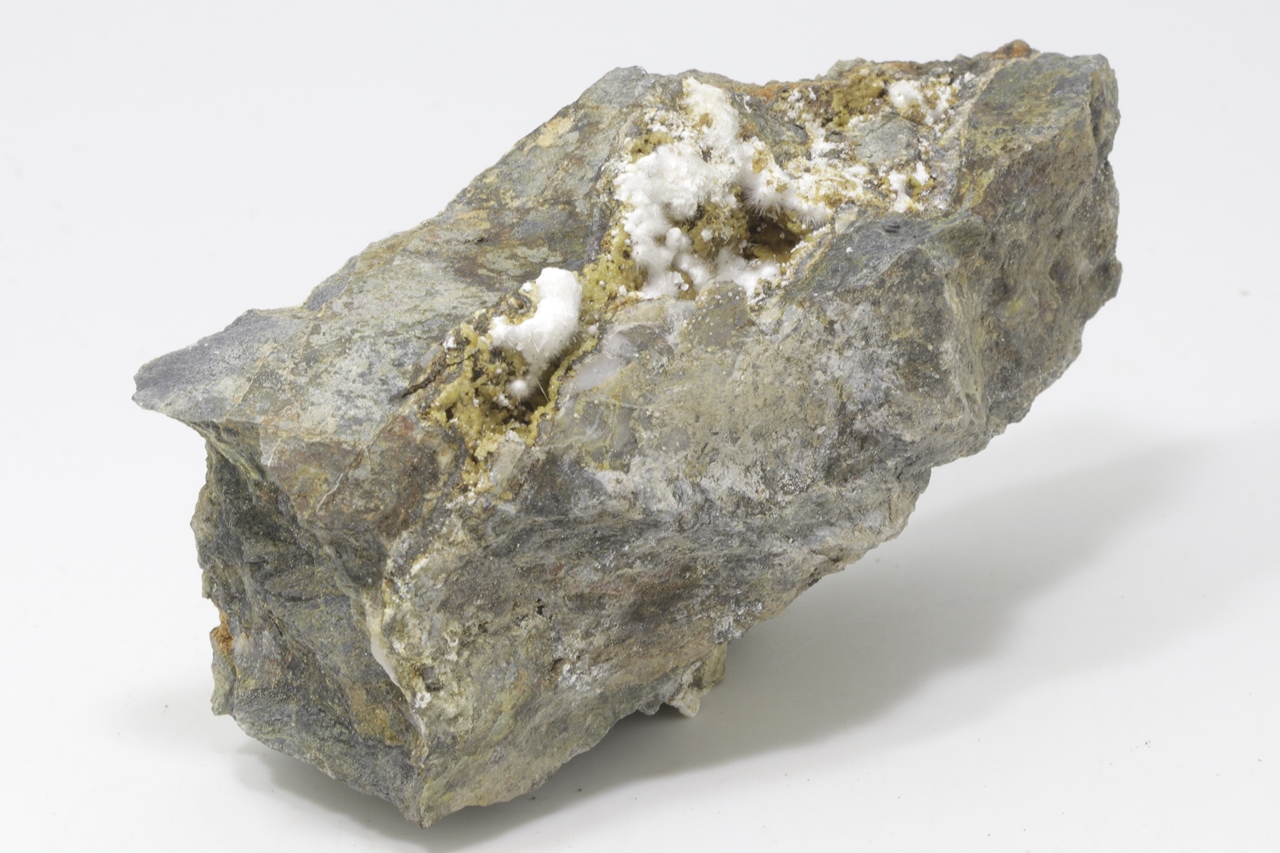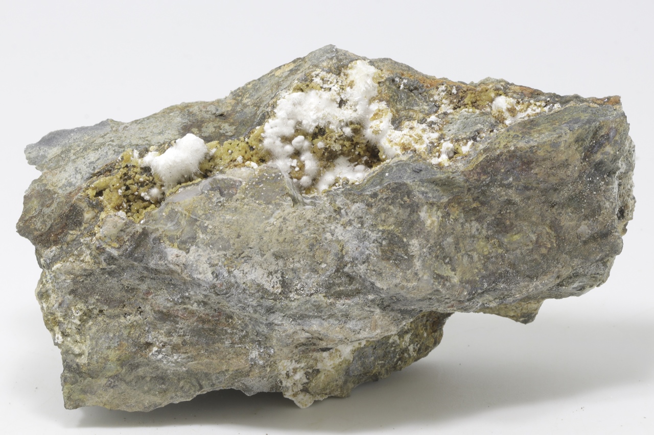 White needle-shaped crystals of pharmacosiderite grown in a cavity. The largest aggregate is 10 mm big. .