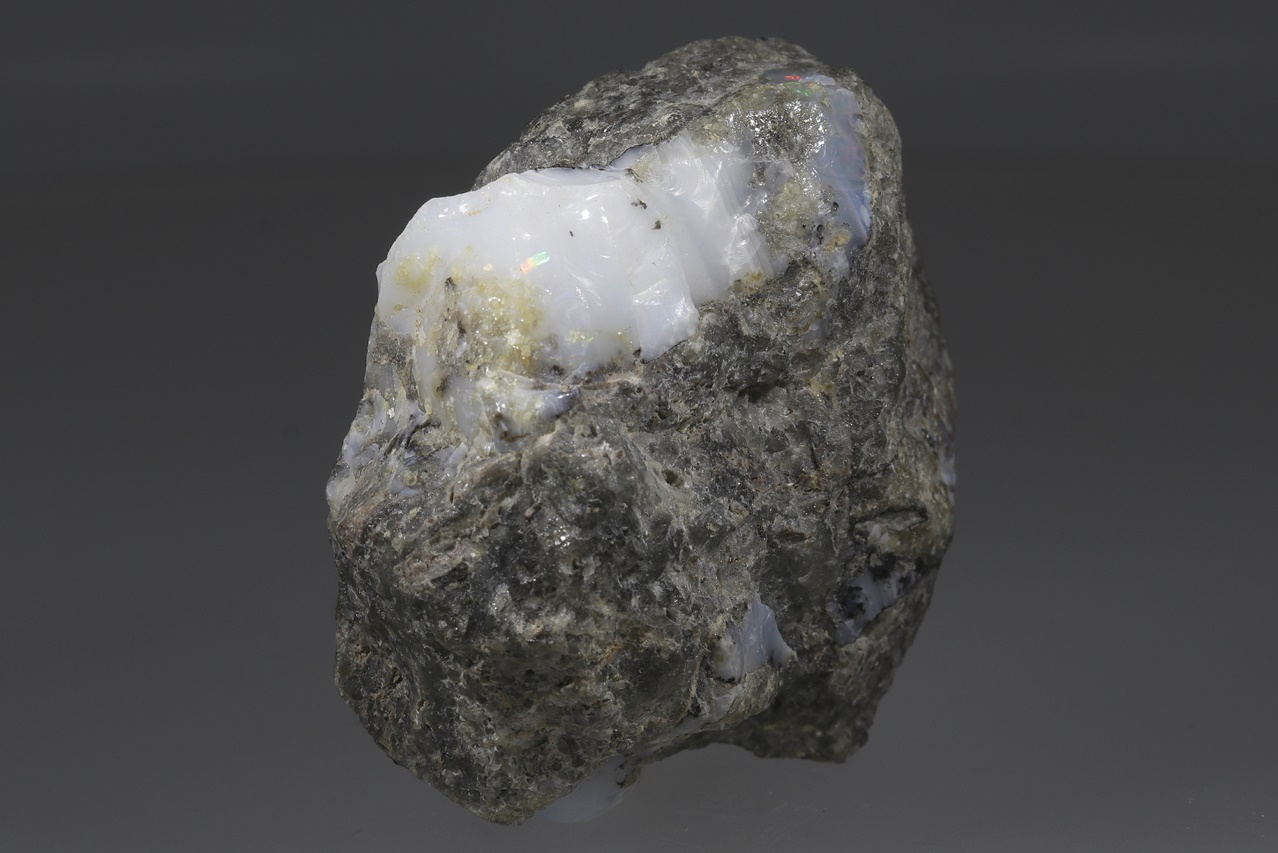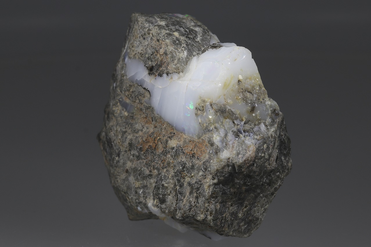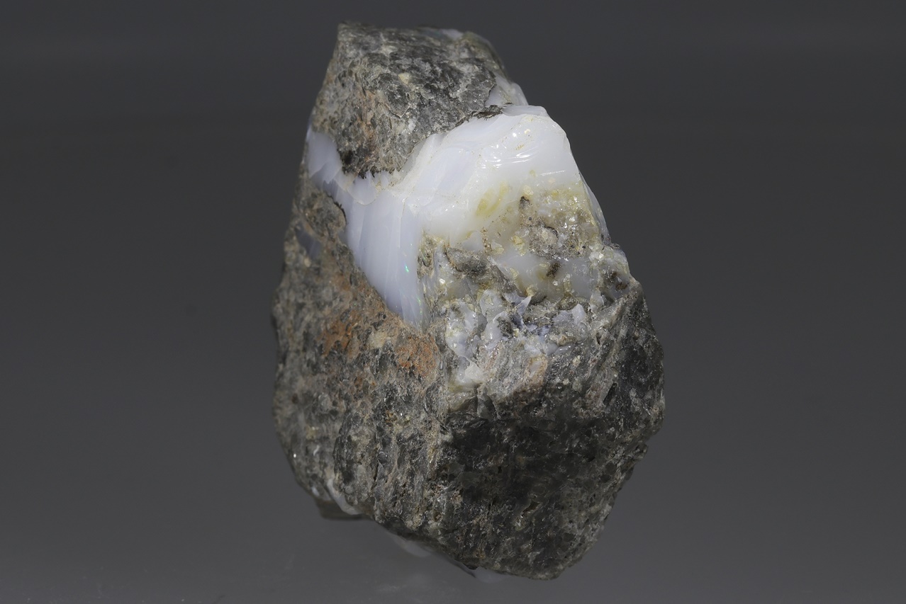 Vein of white opal in the parent rock. Opalescence is most intense in colorless opals .