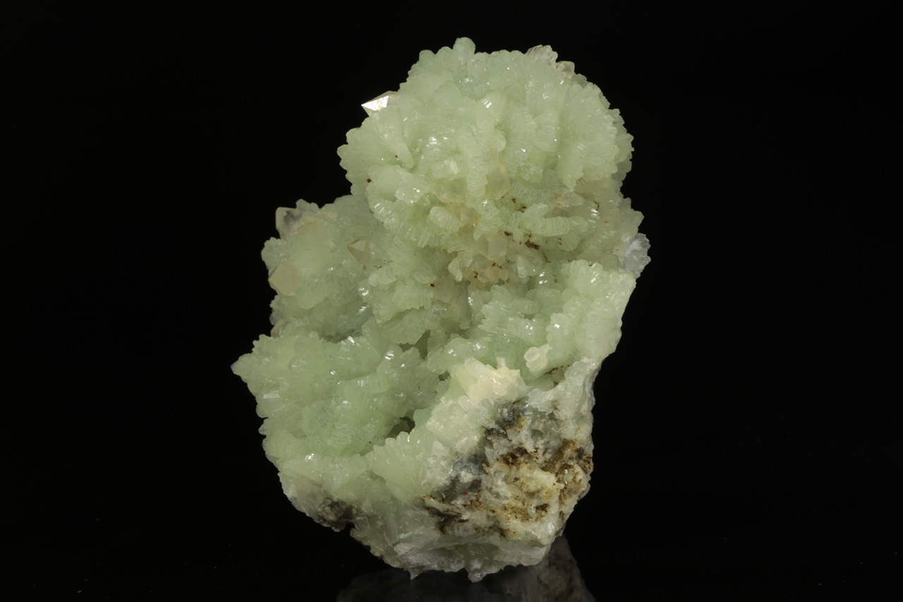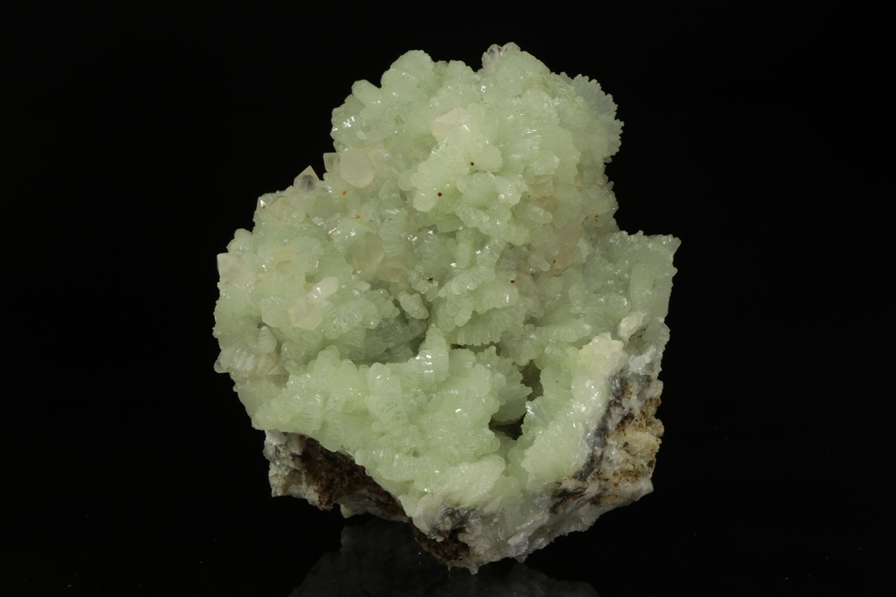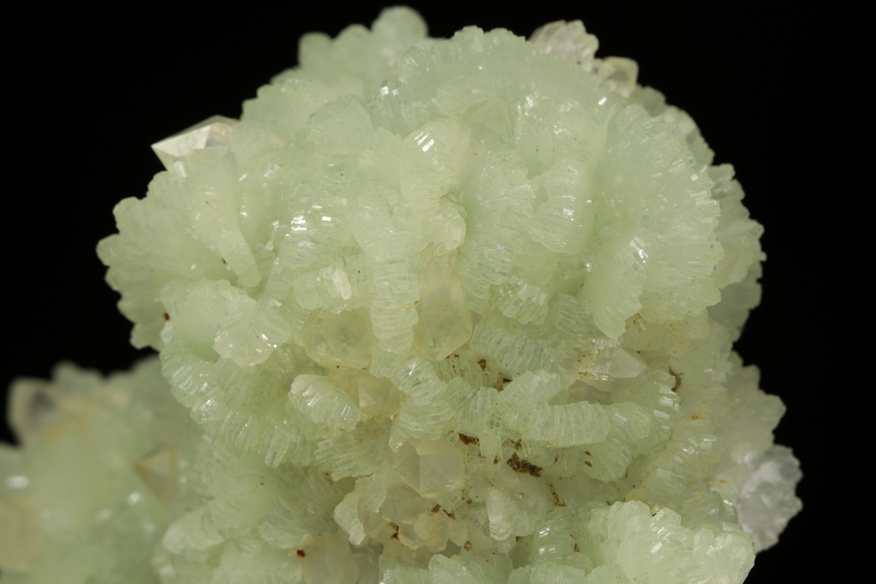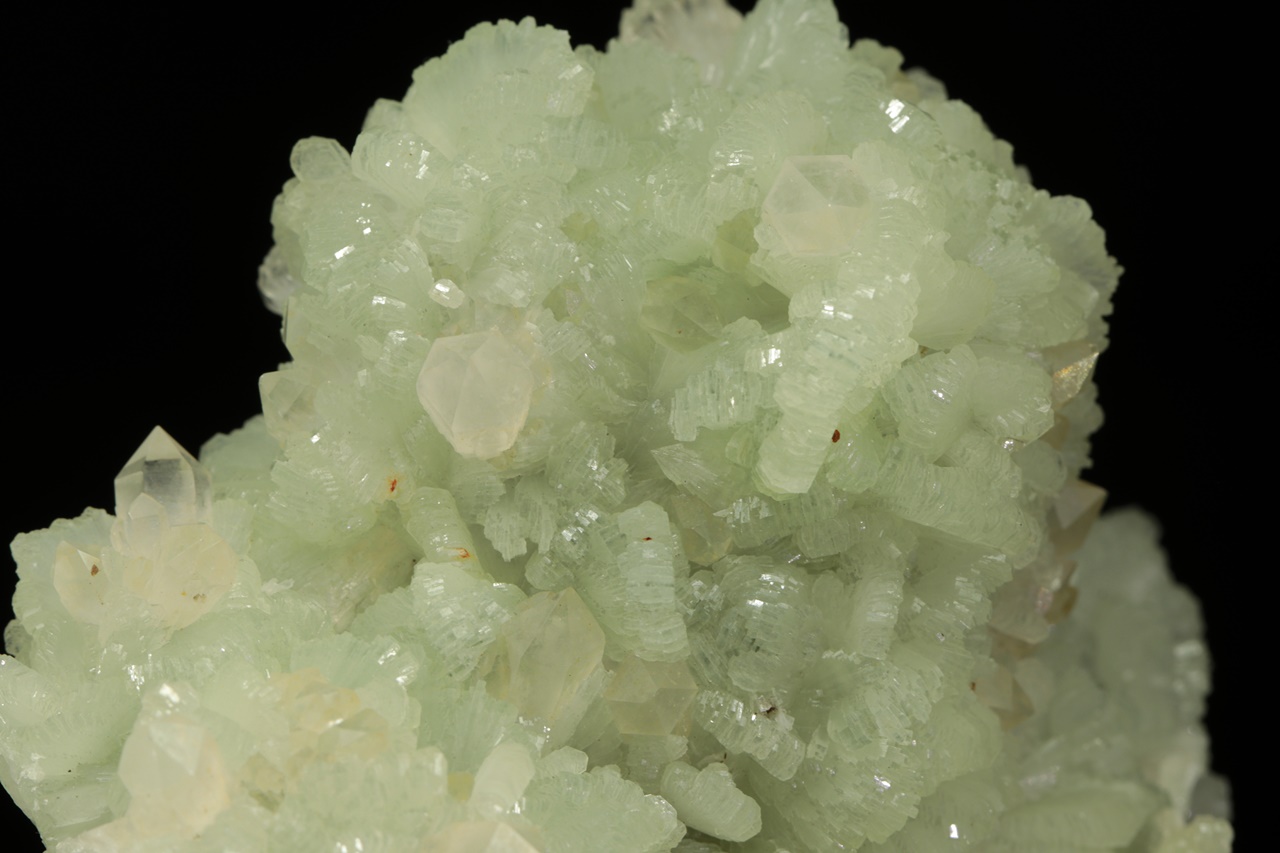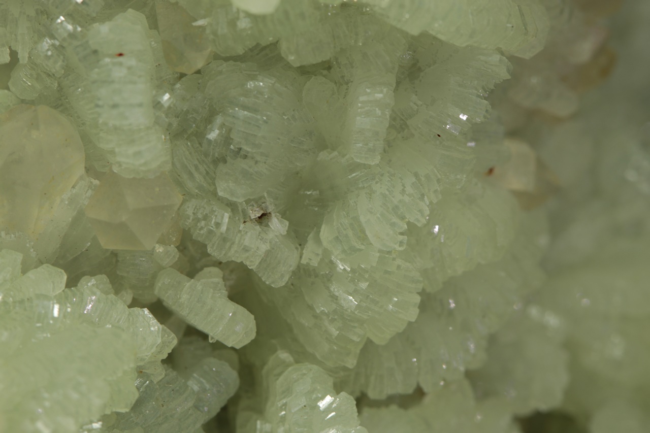 Tabular crystals of light green prehnite forming fans up to 1.5 cm large intergrown with crystal.