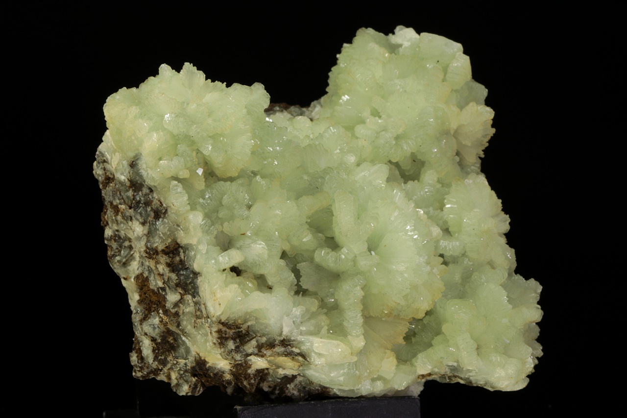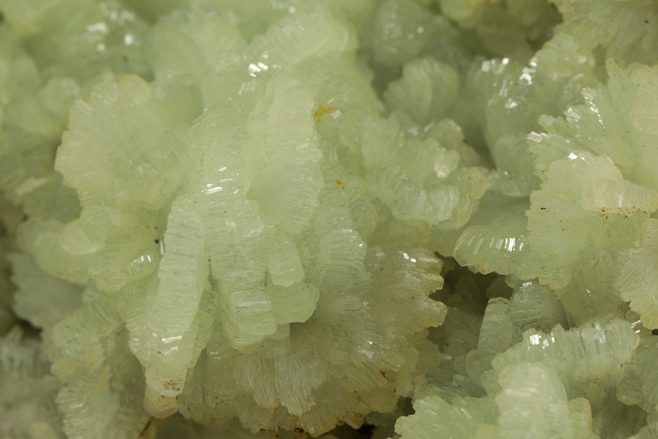 Fan-like aggregates of light green glossy prehnite. The prehnite fans are up to 1.5 cm large.