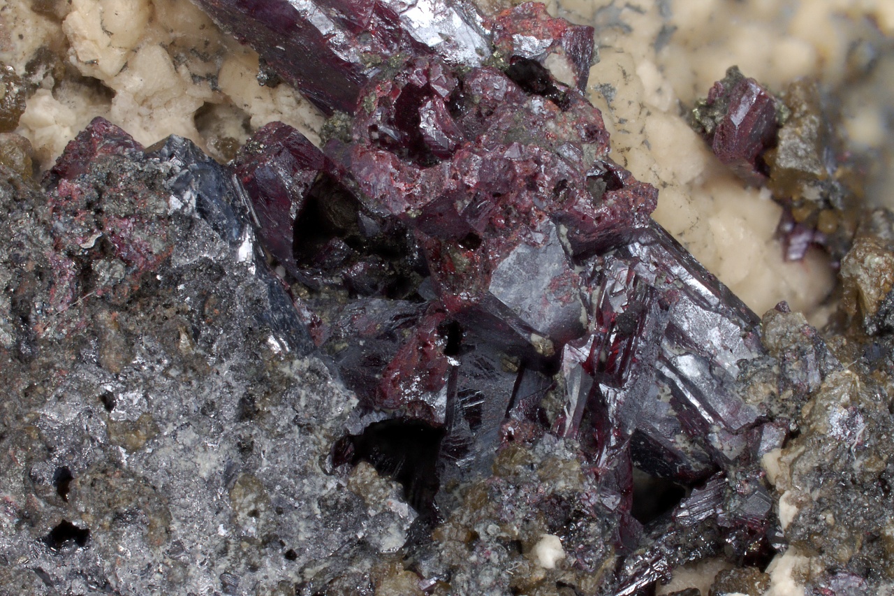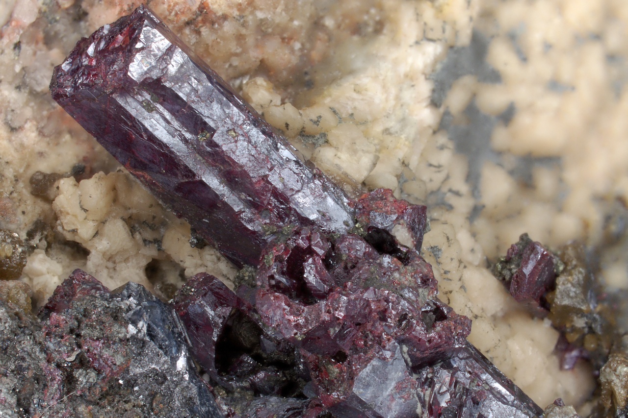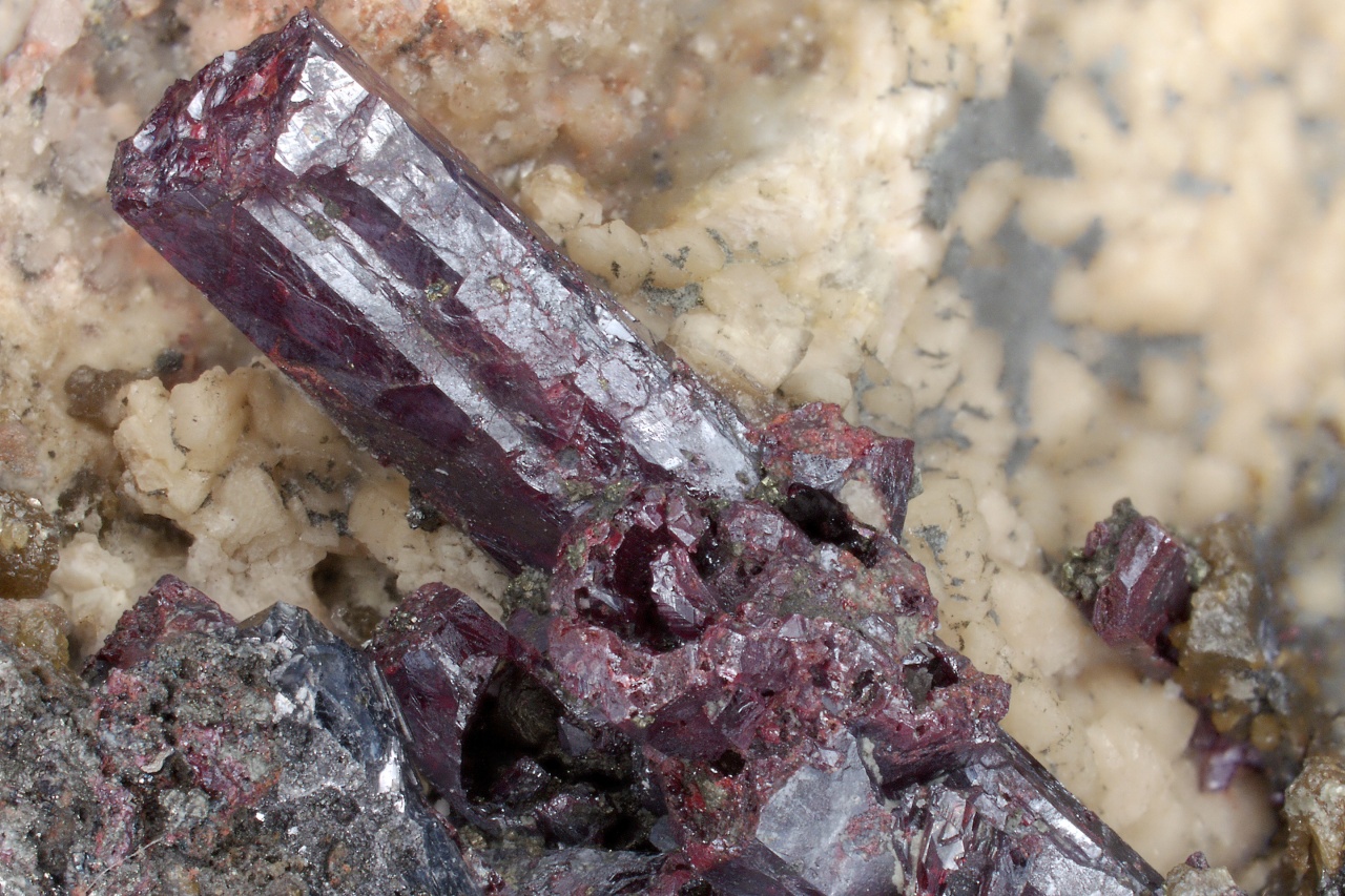 Velmi pěkná bohatá ukázka lesklých červených krystalů proustitu s dominantním sloupcovitým krystalem o o délce 17 mm. Krystaly proustitu nasedají na karbonátovou podložku na více místech spolu s krystaly galenitu. Obtížně sehnatelná ukázka vzácného stříbrného minerálu z dolu na Měděnci v Krušných Horách. Krystaly jsou šetrně vyleptané z kalcitu.