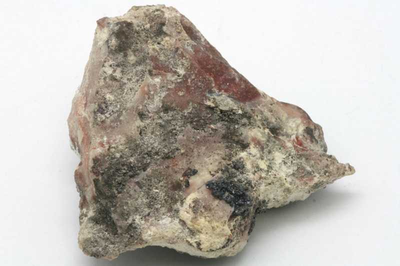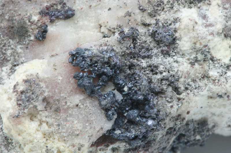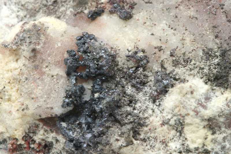 Silver sulfoarsenide from Jáchymov, Czech Republic. Aggregates of red proustite and small hexagonal crystals of argentopyrite, 0.5 mm in size