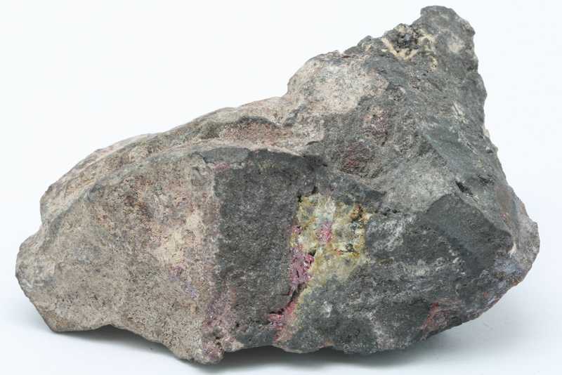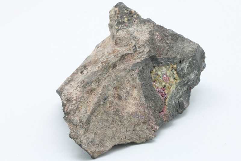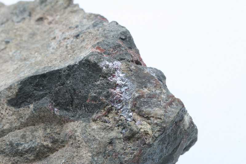 Sample of arsenic with proustite from Jáchymov. Sample of black arsenic together with red proustite.
