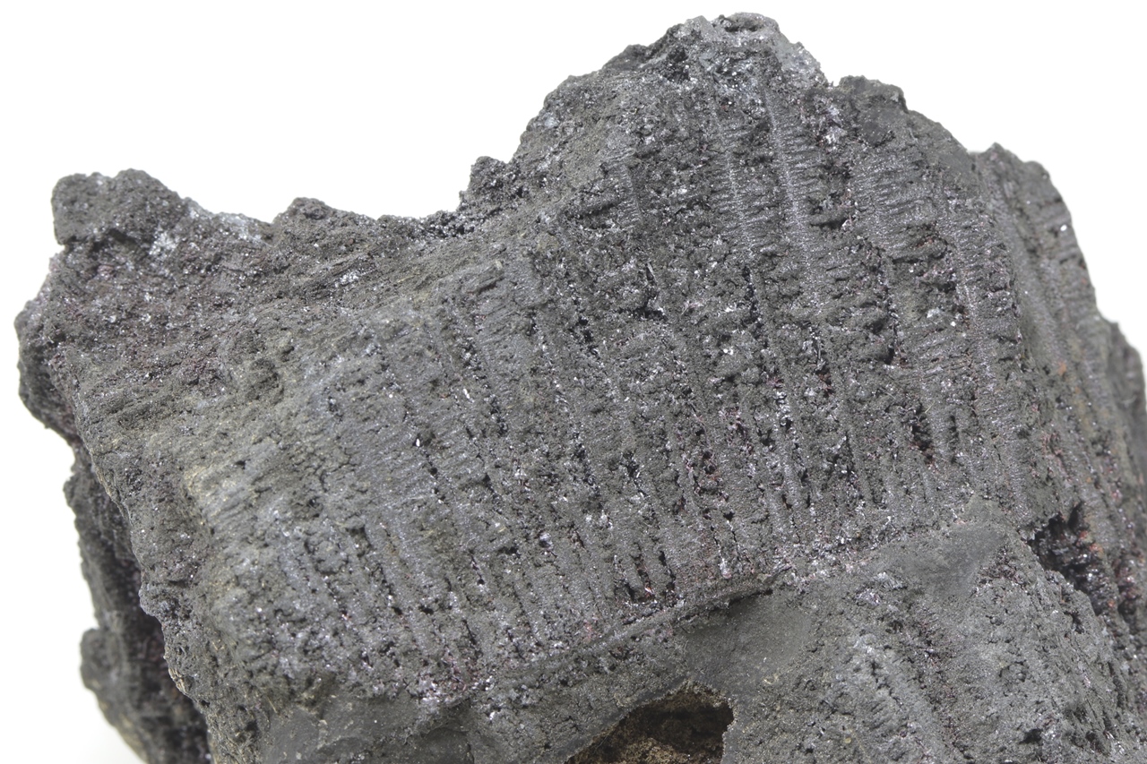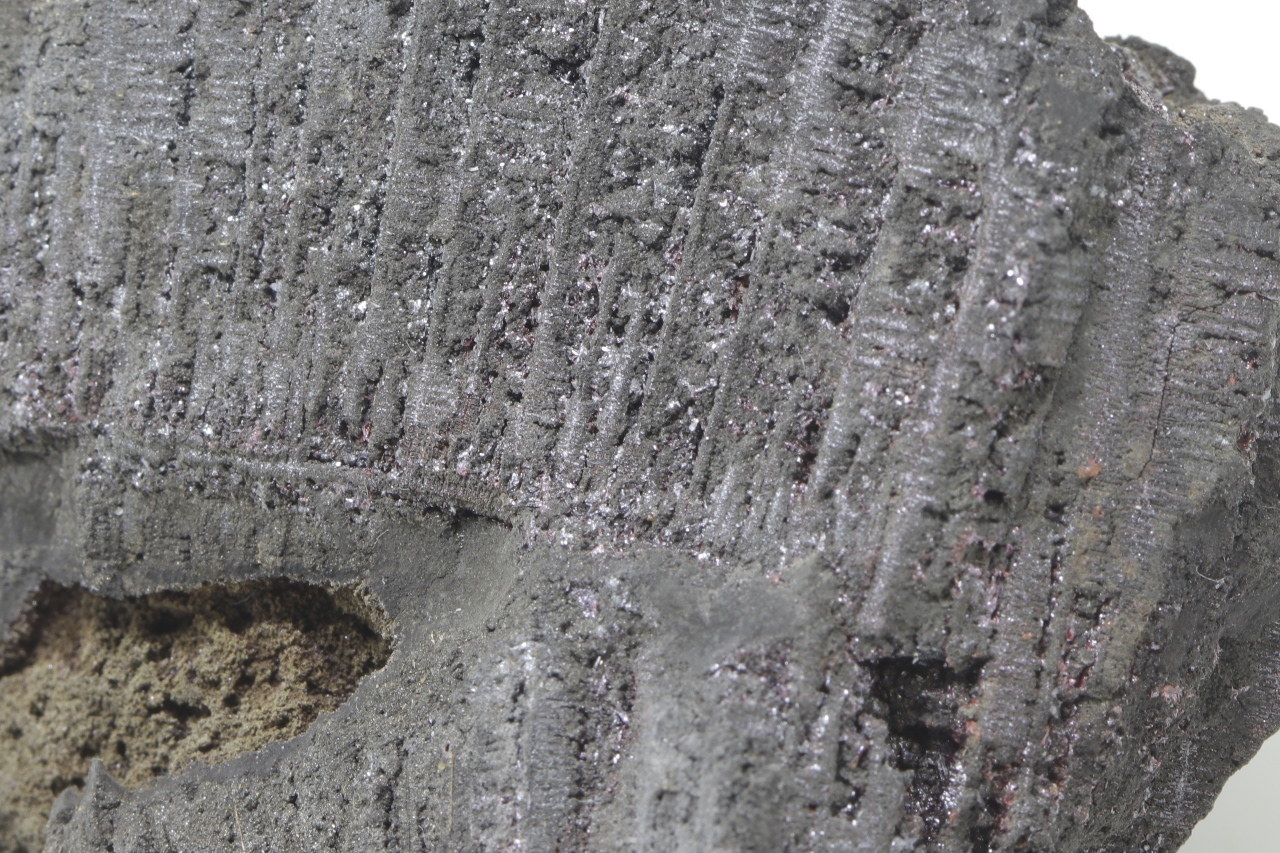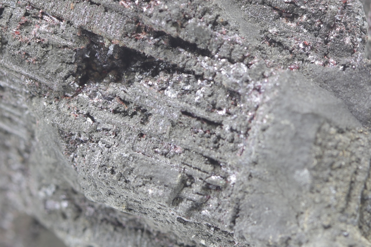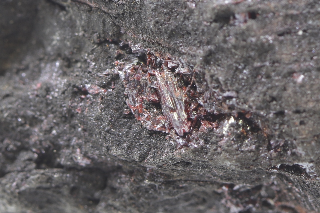 Perimorfóza proustitu v černém arsenu. Dutiny dříve vyplněné stříbrem majícím estetickou pérovitou struktutu jsou vyplněné drobnými lesklými tmavě červenými krystaly proustitu.