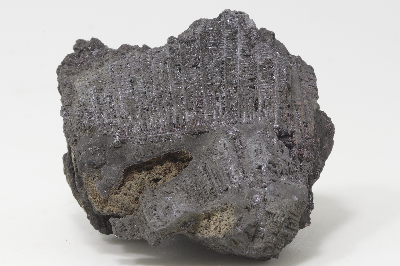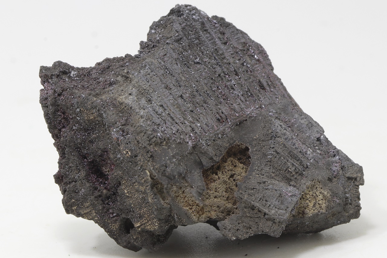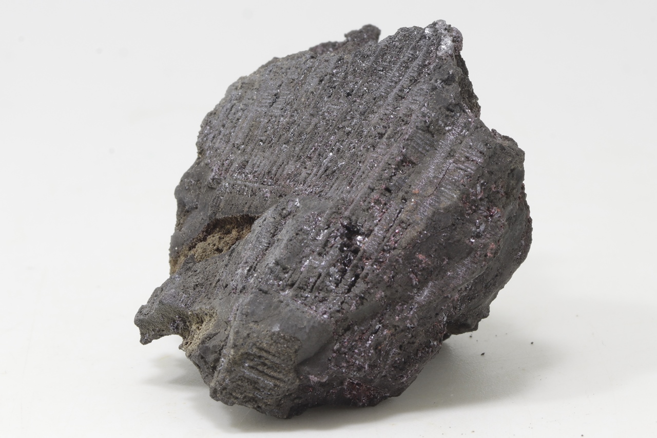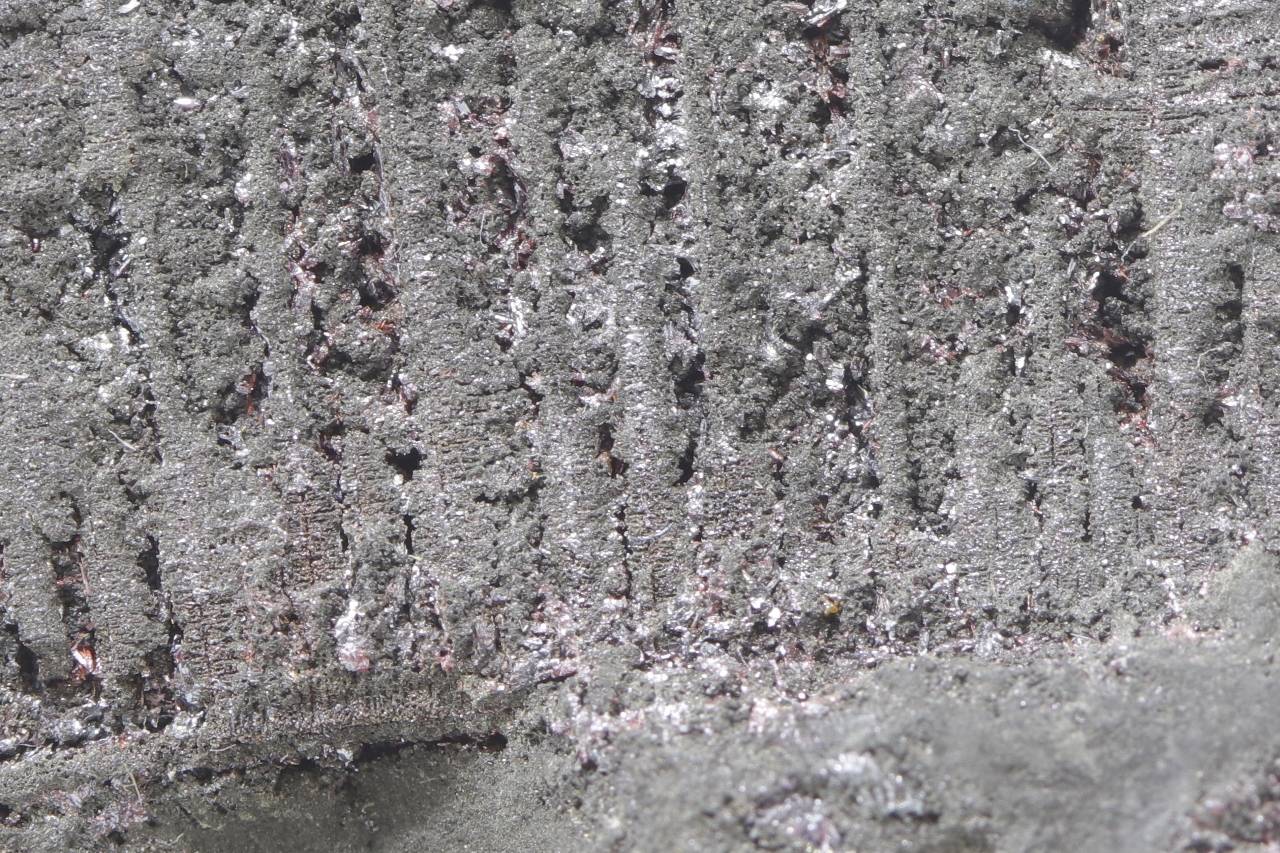 Perimorfóza proustitu v černém arsenu. Dutiny dříve vyplněné stříbrem majícím estetickou pérovitou struktutu jsou vyplněné drobnými lesklými tmavě červenými krystaly proustitu.
