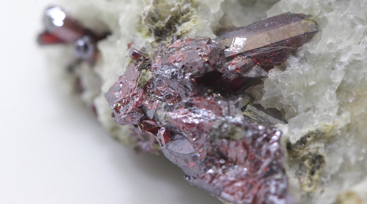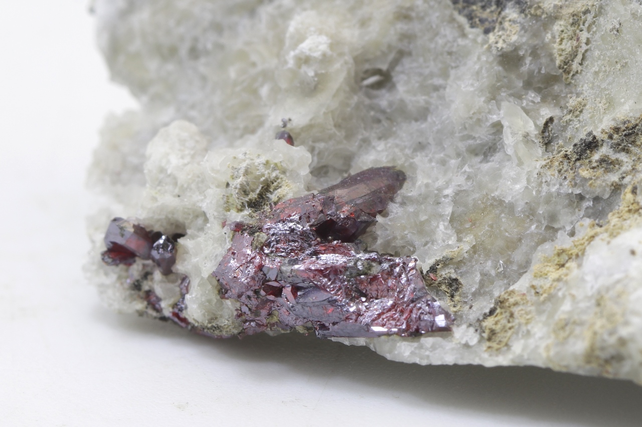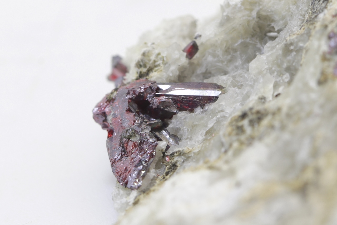 A beautiful specimen of a rich red crystal of silver sulfide on a contrasting light base. The crystal length is 5 mm.