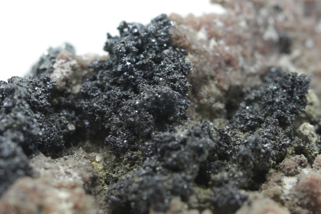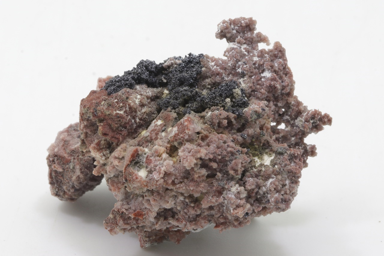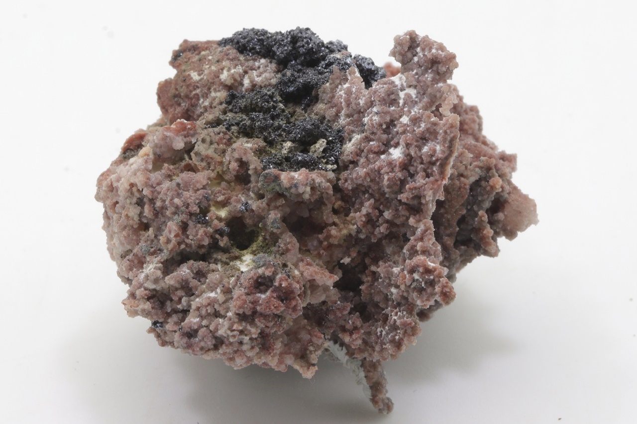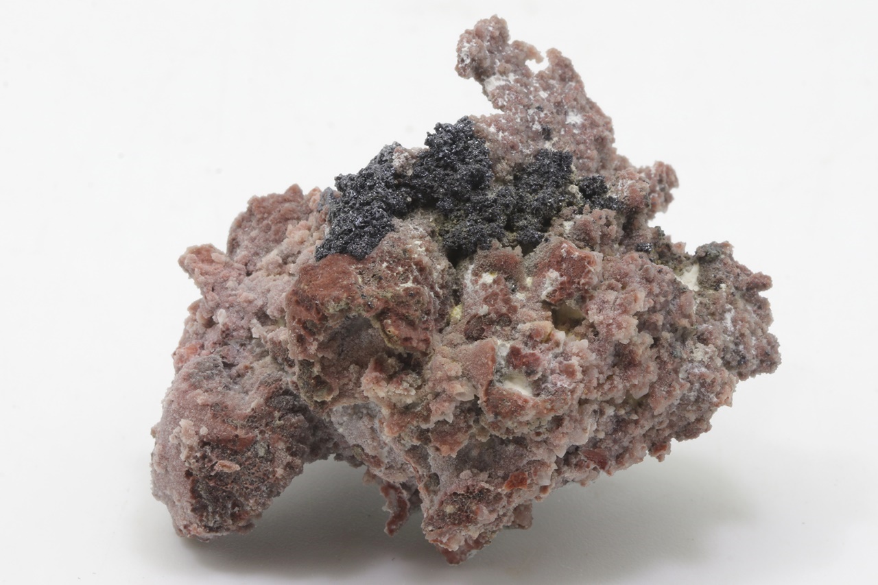 Large cluster of crystals covered with brown dolomite and a cluster of black proustit crystals.