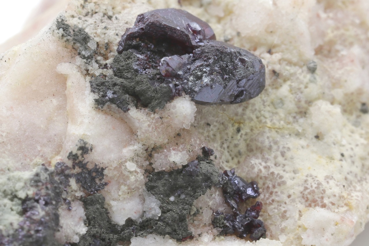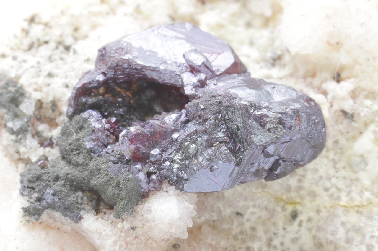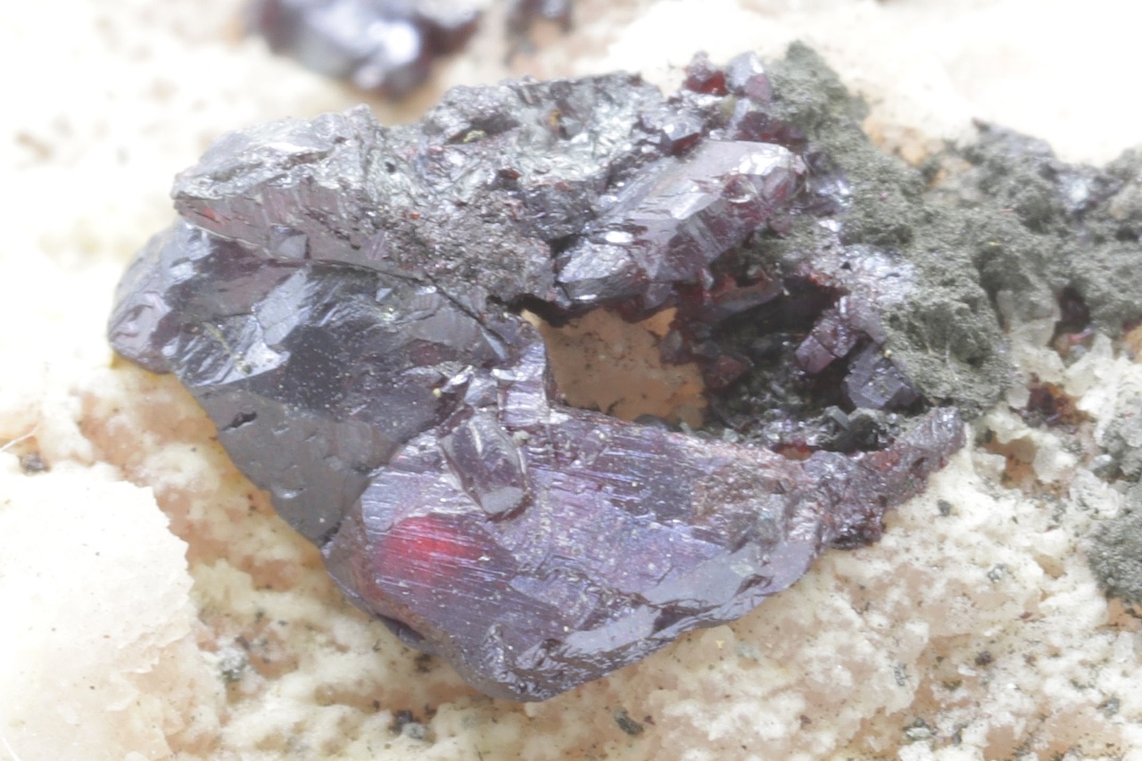 Several well-defined crystals of saturated red silver sulfide from the type locality. The larger cluster is 8 mm in size.