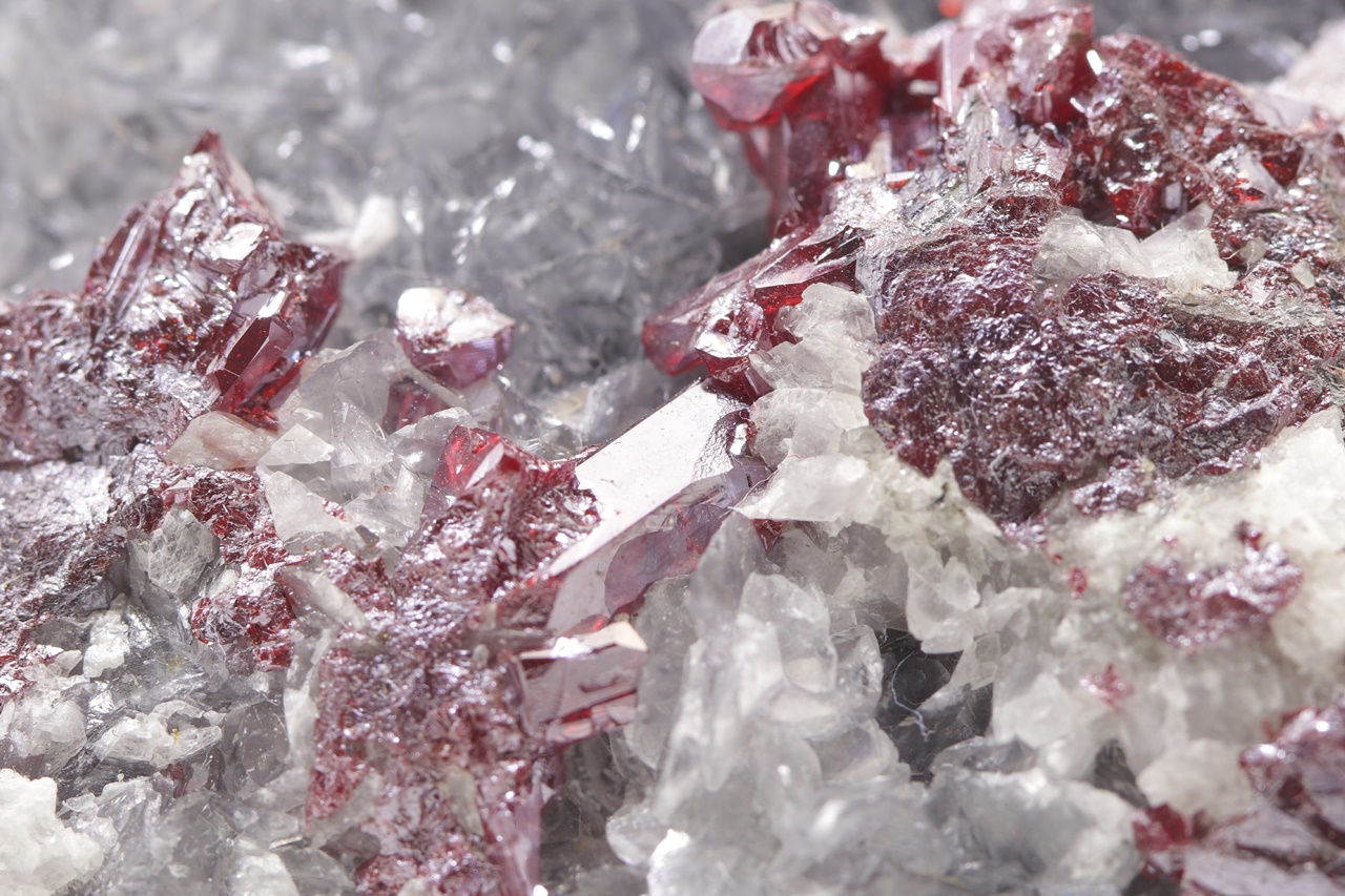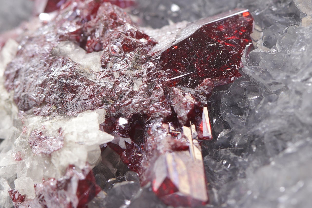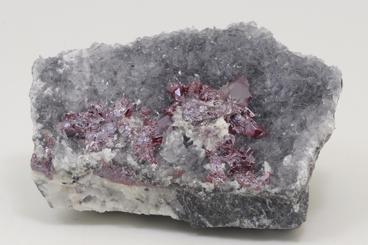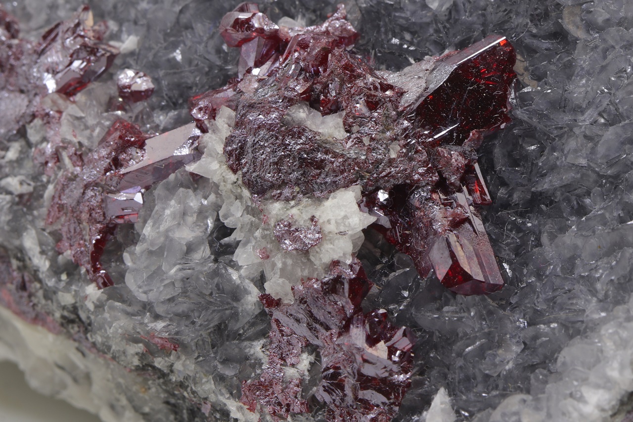 A beautiful example of large, very shiny, intensely red Proustit crystals grown on crystals of contrasting gray Calcite. The largest Proustit crystal is 10 mm in size.