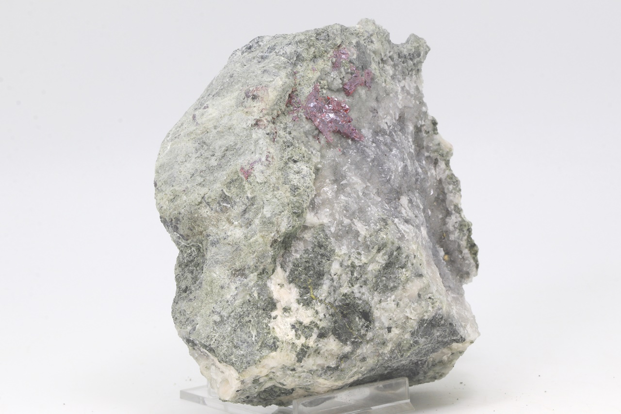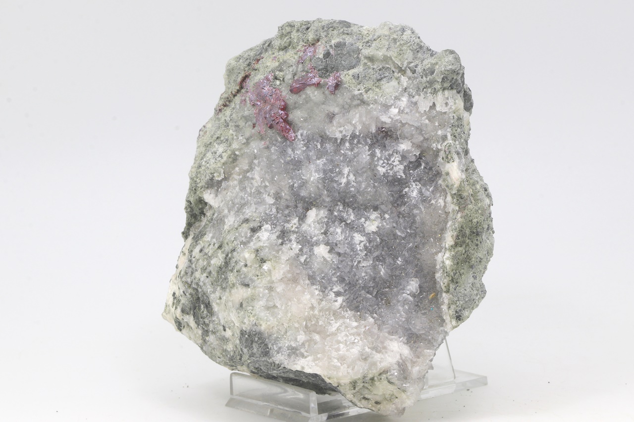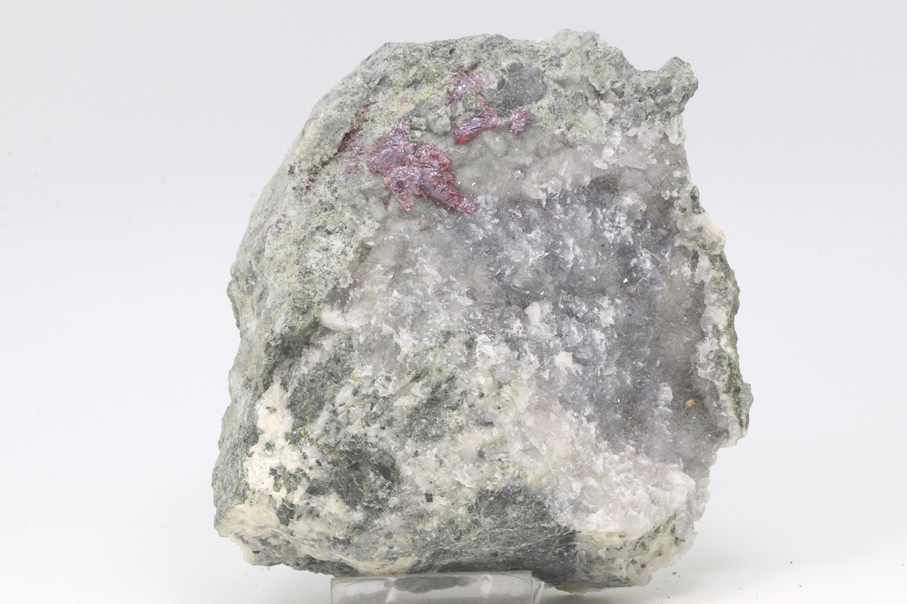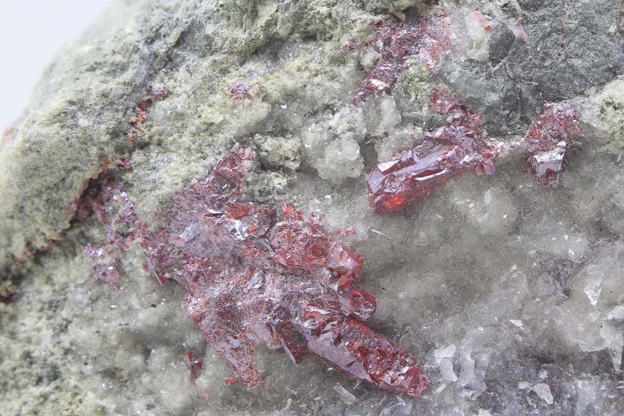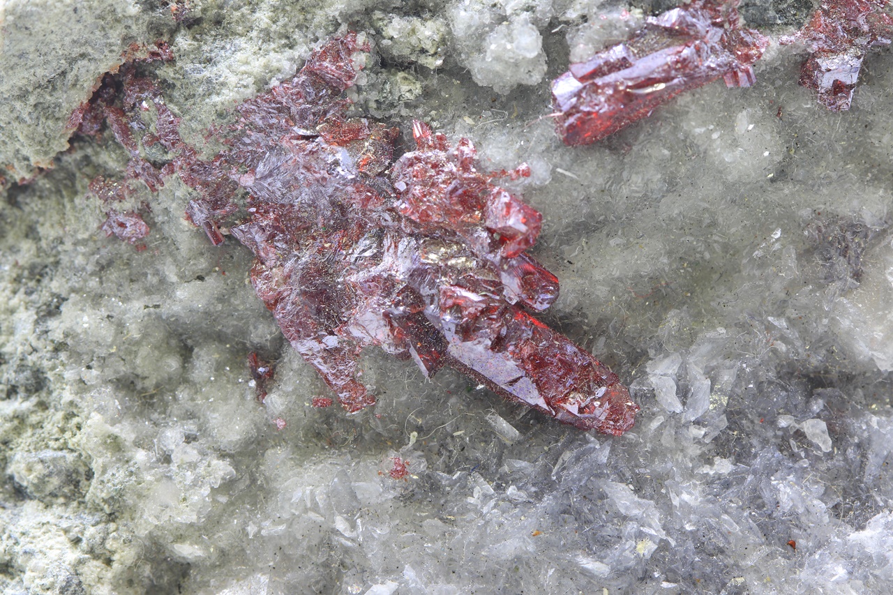 Bright red, translucent crystals of silver sulfide grown on clear calcite. The lower cluster of crystals is 23 mm in size, the upper crystal is 10 mm in size.