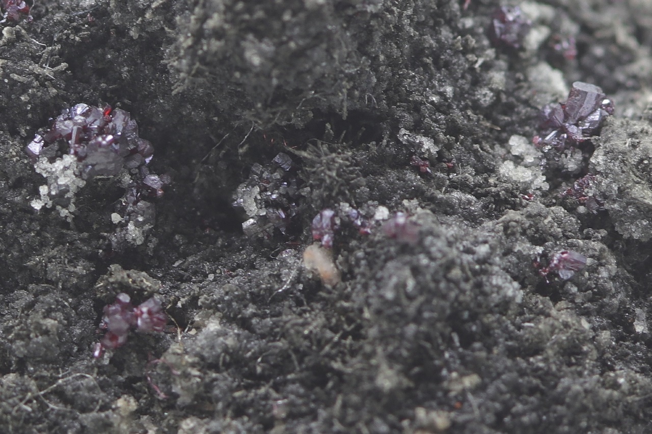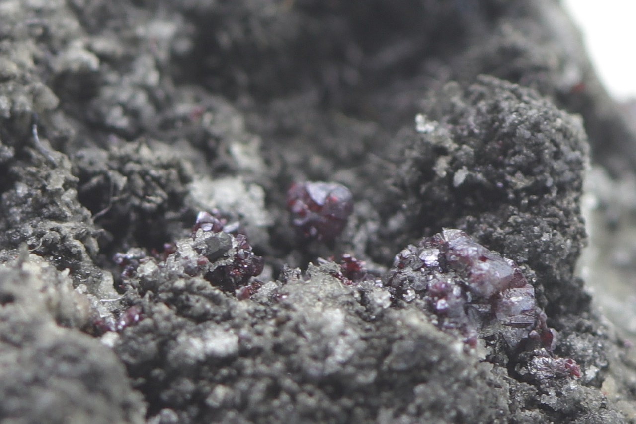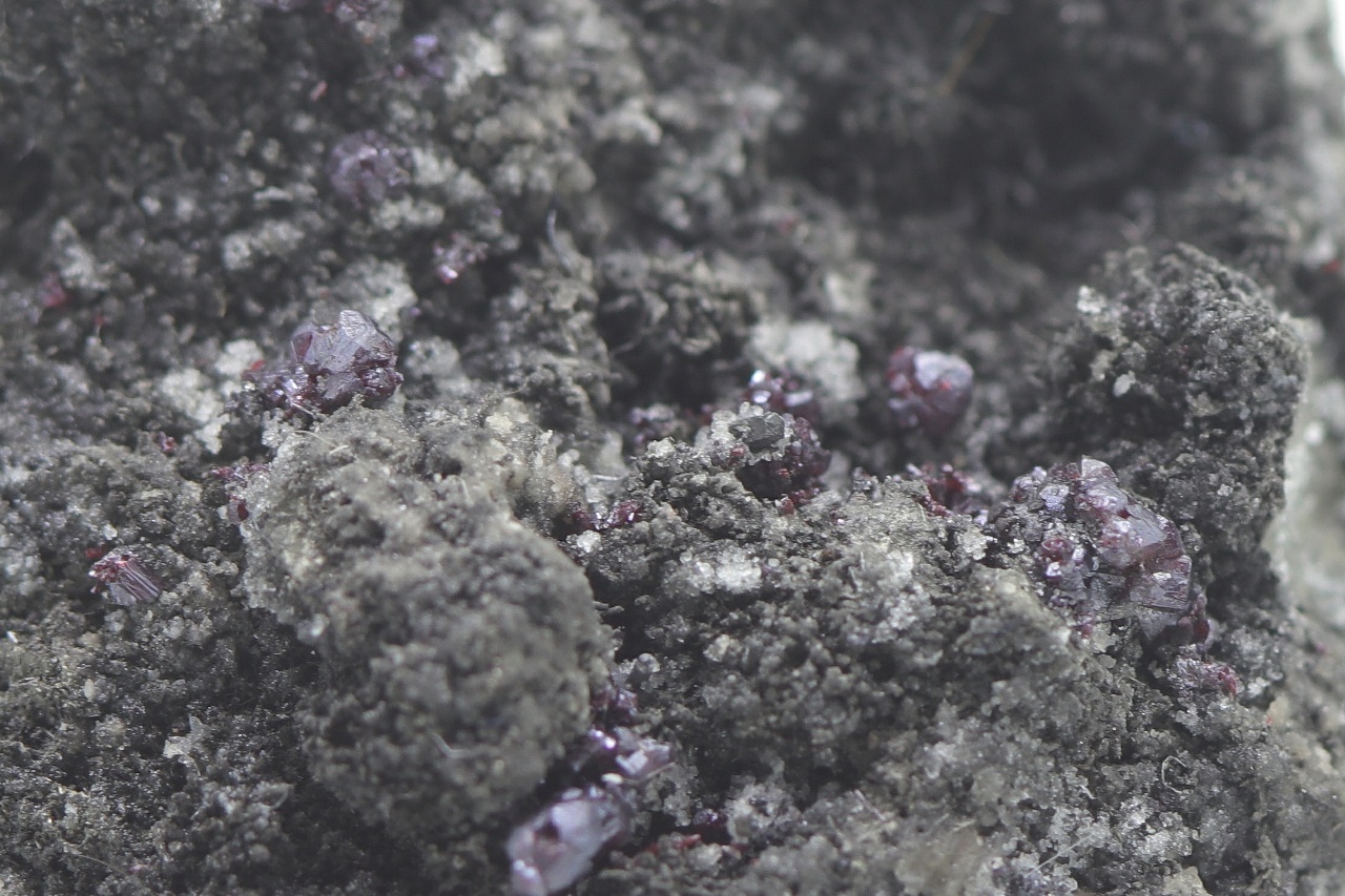 Deep red crystals of Proustit growing on black Pyrit forming small elongated pseudomorphs after Argentopyrit.