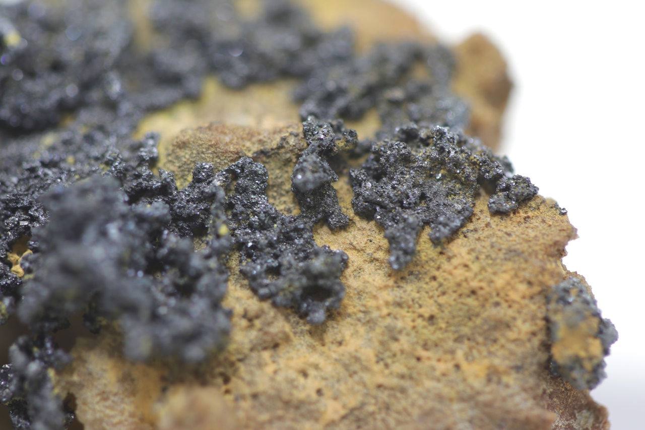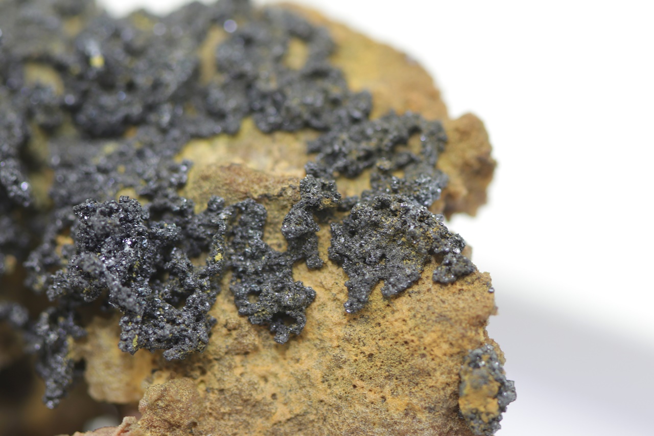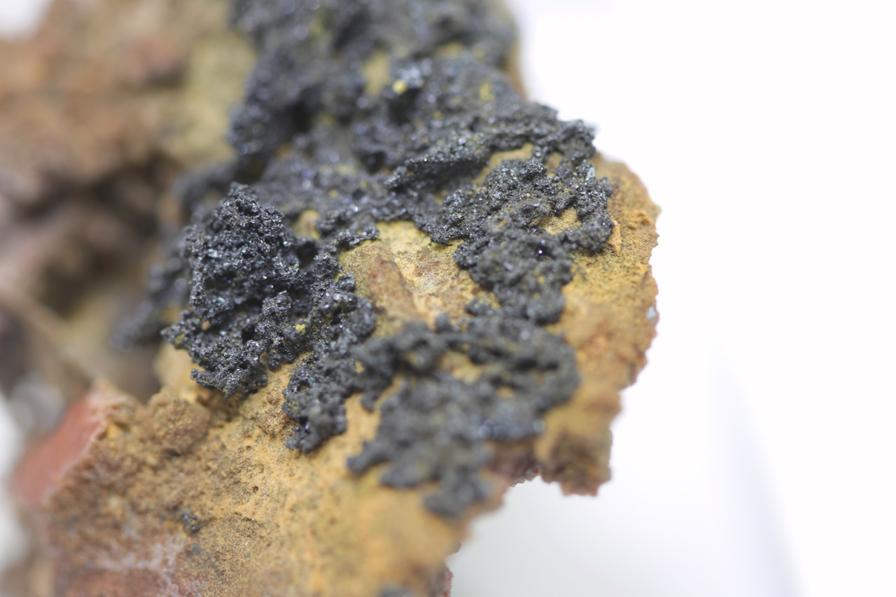 A sample of rust-colored, porous quartz, on which tiny, metallically lustrous proustit and acanthite crystals grow. The individual crystals also often grow on one another, forming spatial aggregates. In one part, there are also undamaged and spatially organized larger proustit crystals, whose cluster reaches a size of up to 0.4 mm. It is a very rich and especially undamaged sample of these minerals from the 12th floor of the Svornost mine on the Geschieber vein in Jáchymov. Jáchymov is a type locality for both minerals.