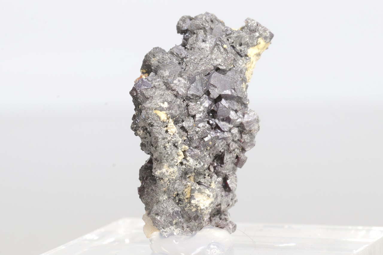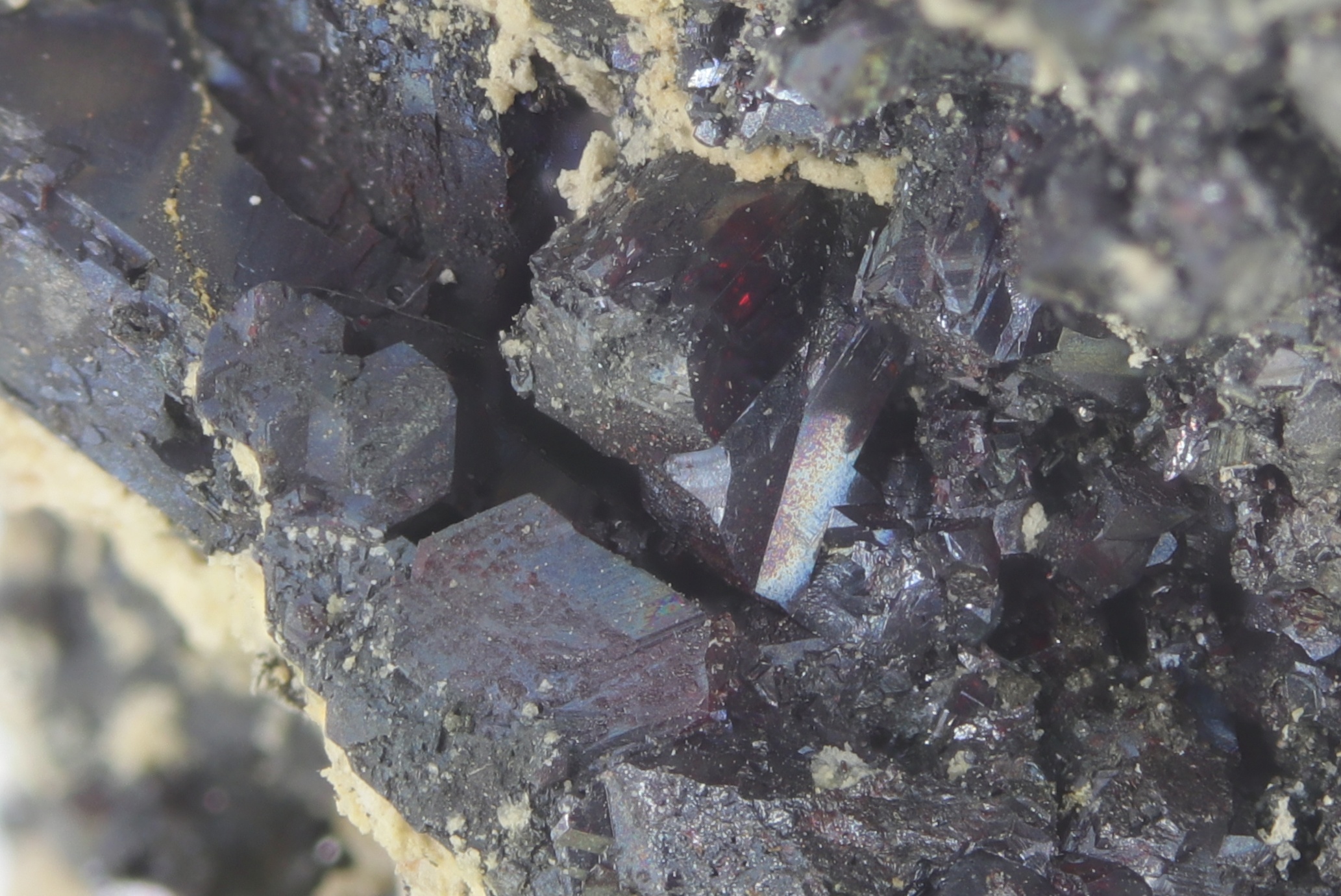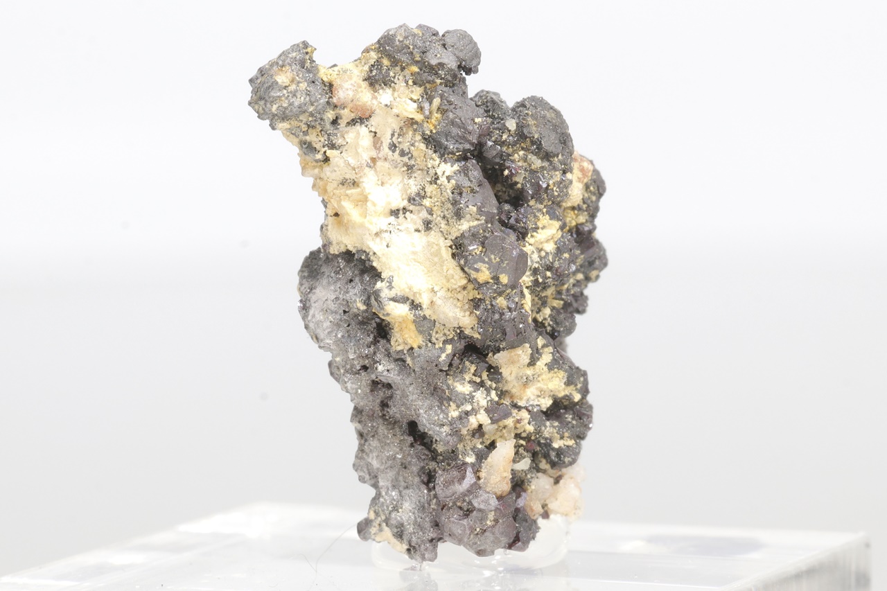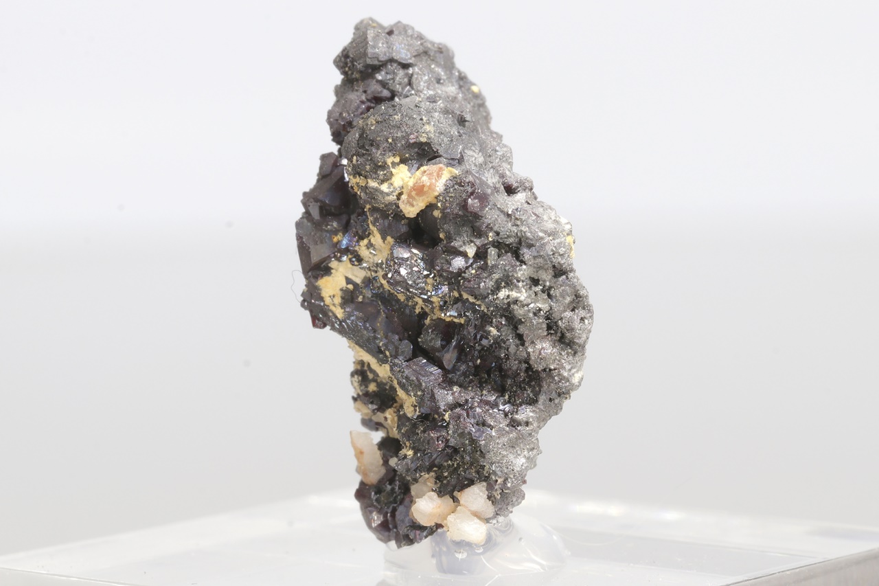 Sample of druzy with dark red crystals of proustit with tabular, approximately 0.5 mm large crystal of a rare mineral sternbergite. Both minerals have type locality in Jáchymov.