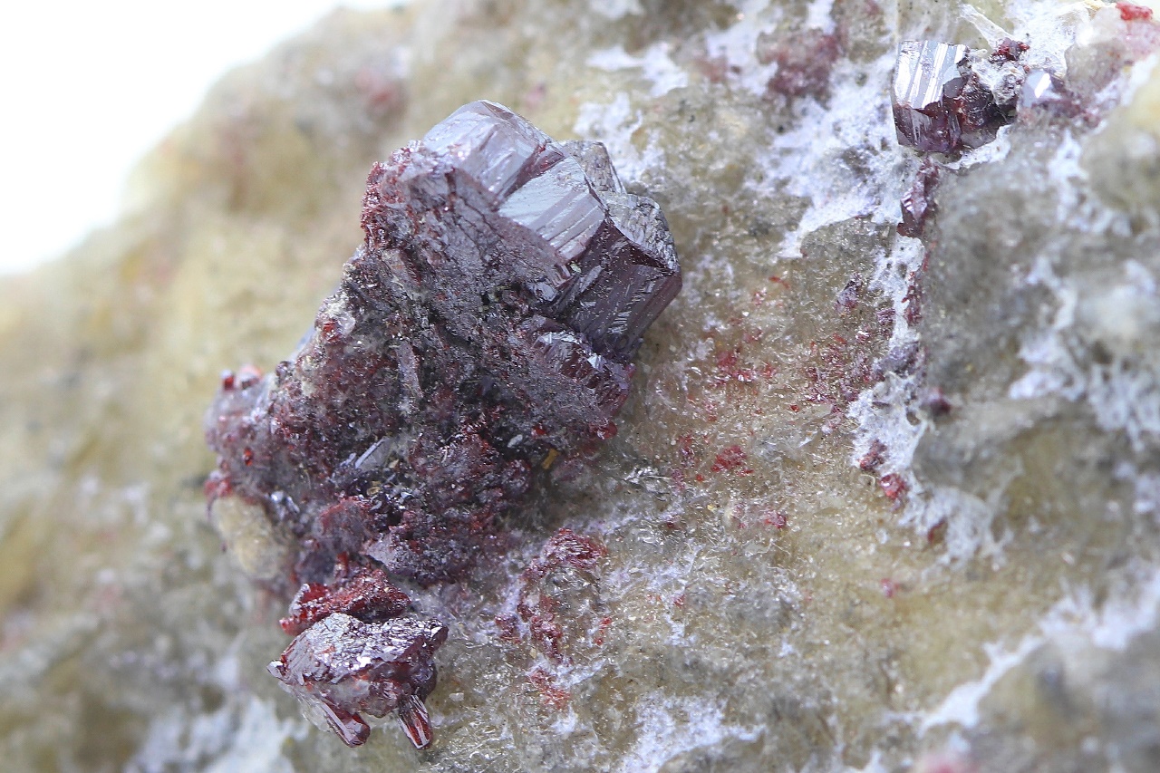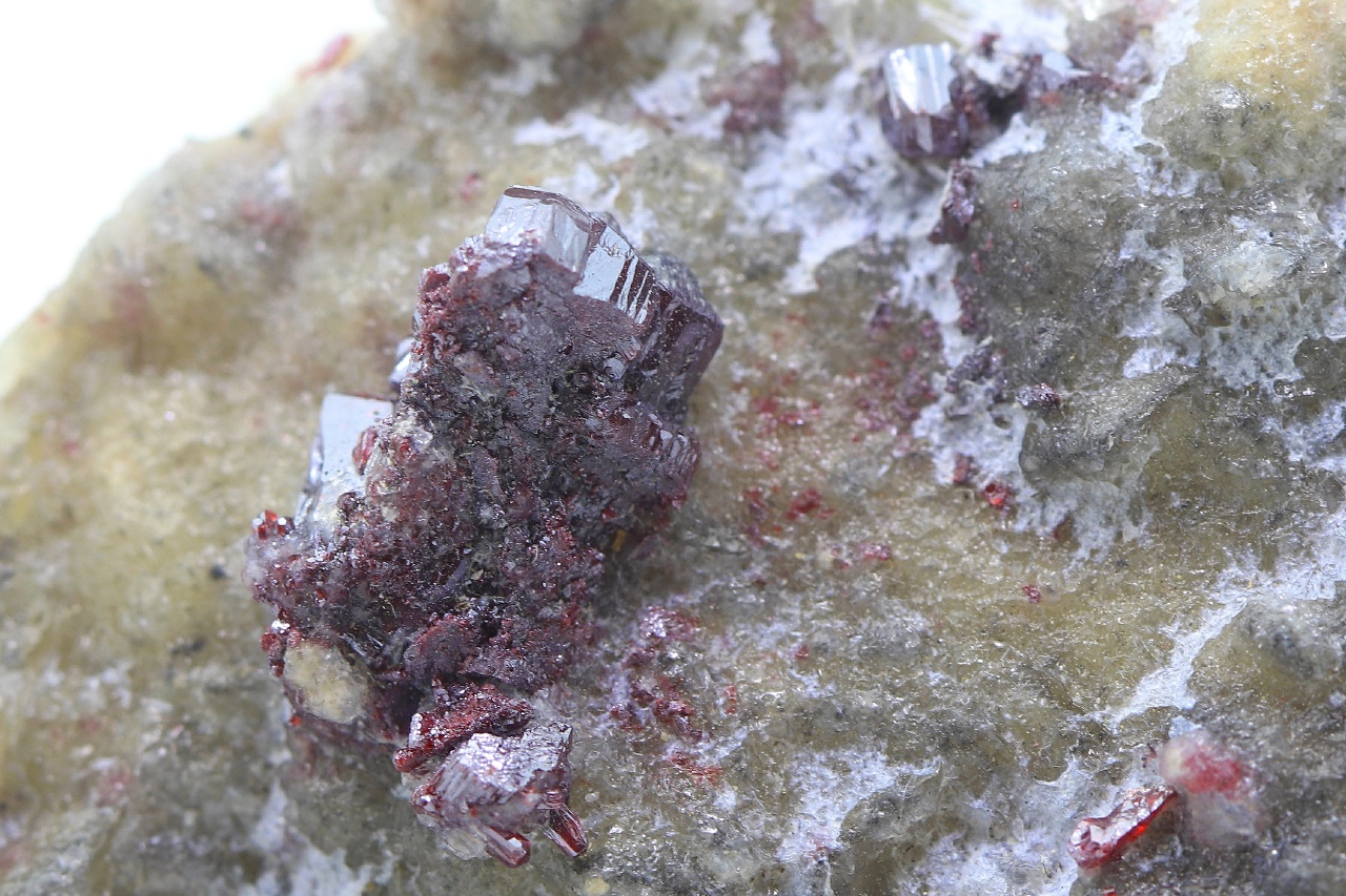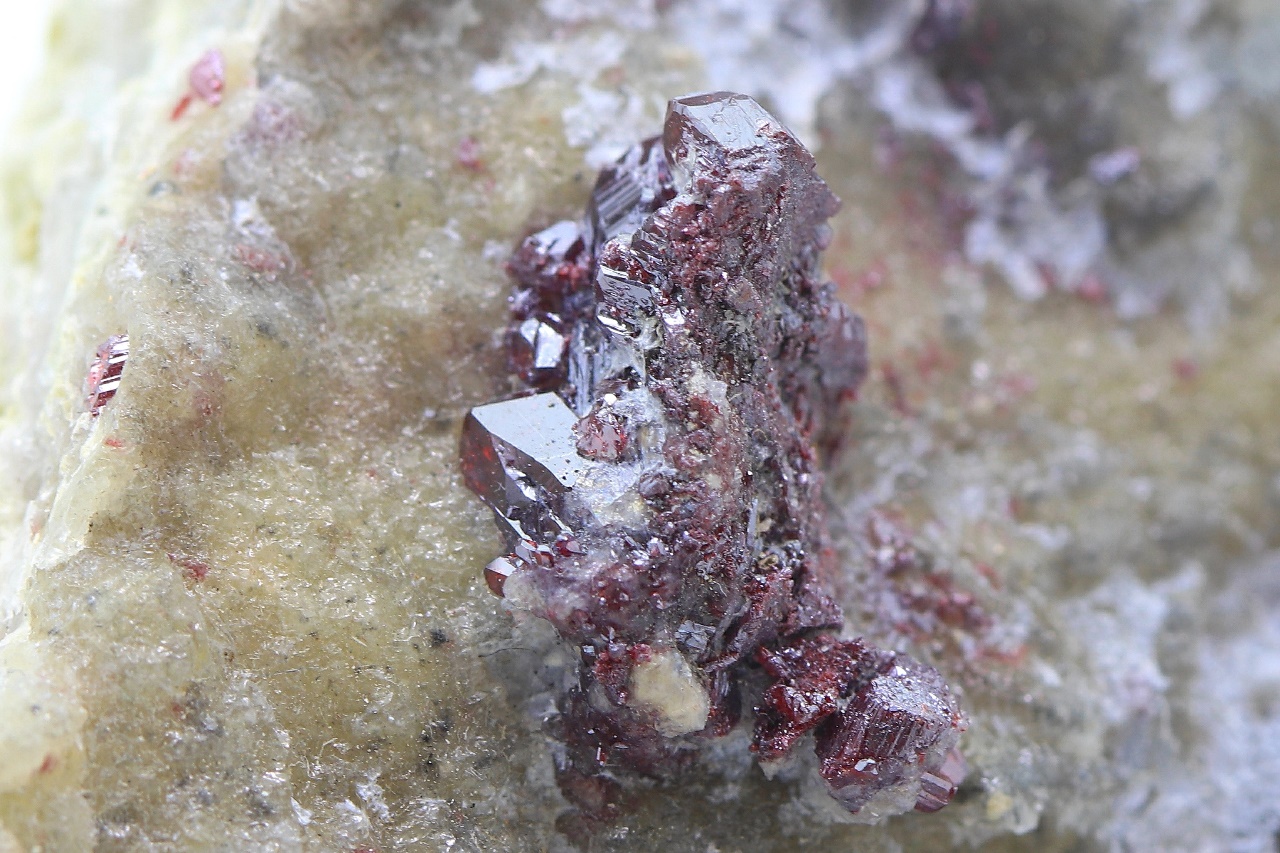 Cluster of dark red Proustit crystals. The size of the cluster is 16 mm .