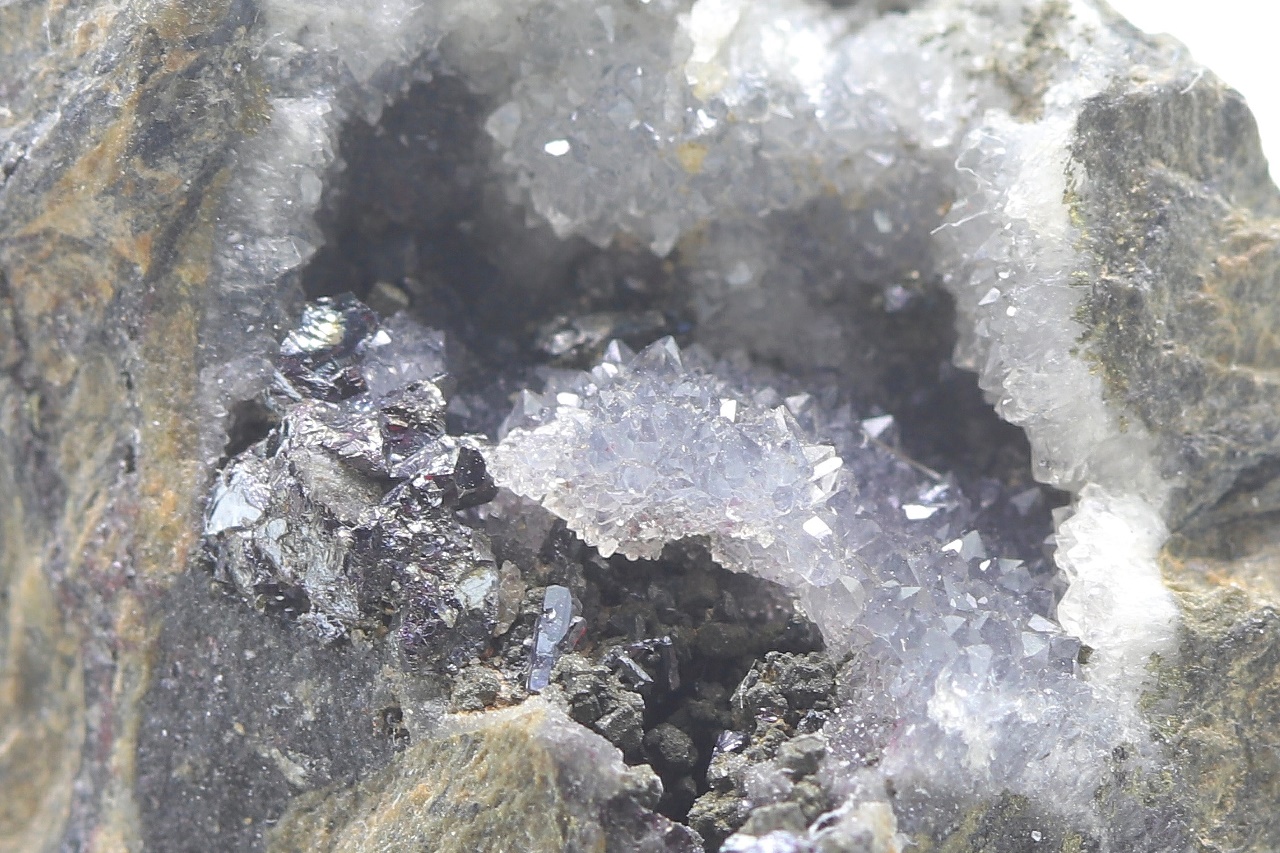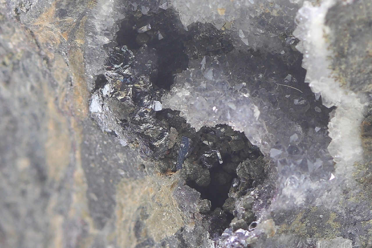 Pyrargyrite crystals up to 3 mm large grown in a quartz cavity.