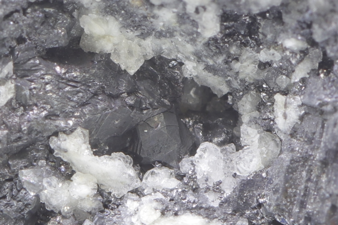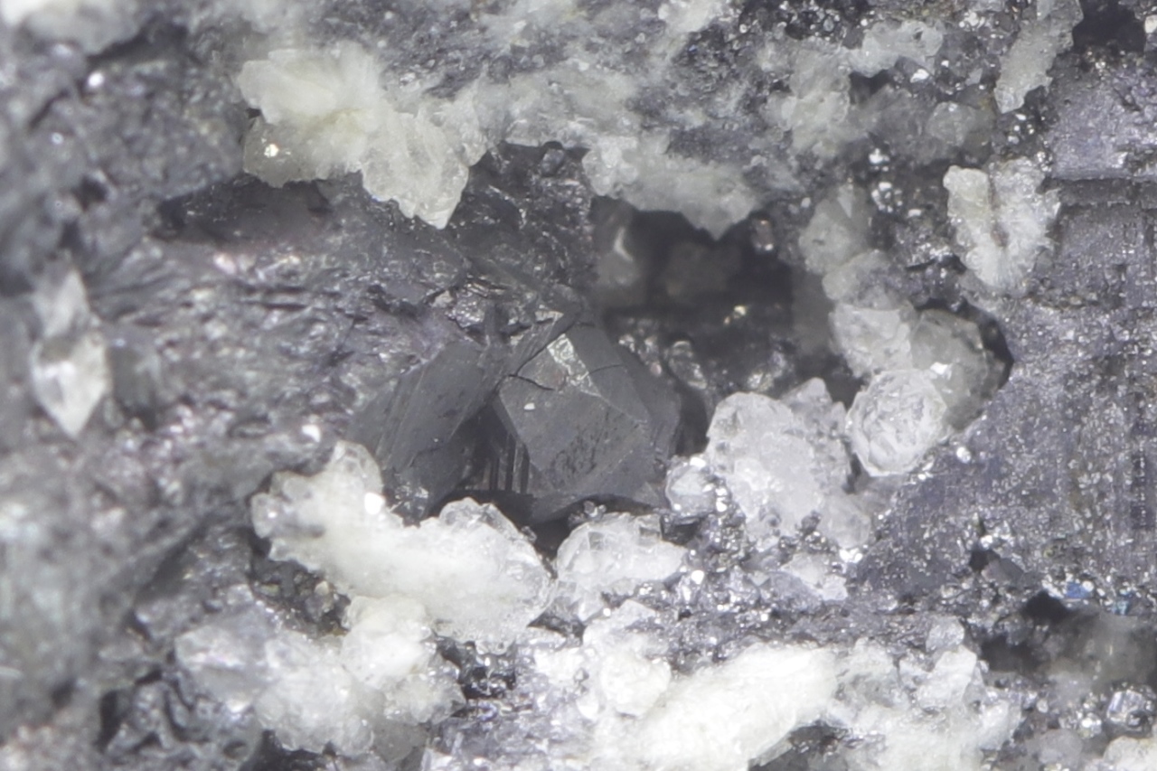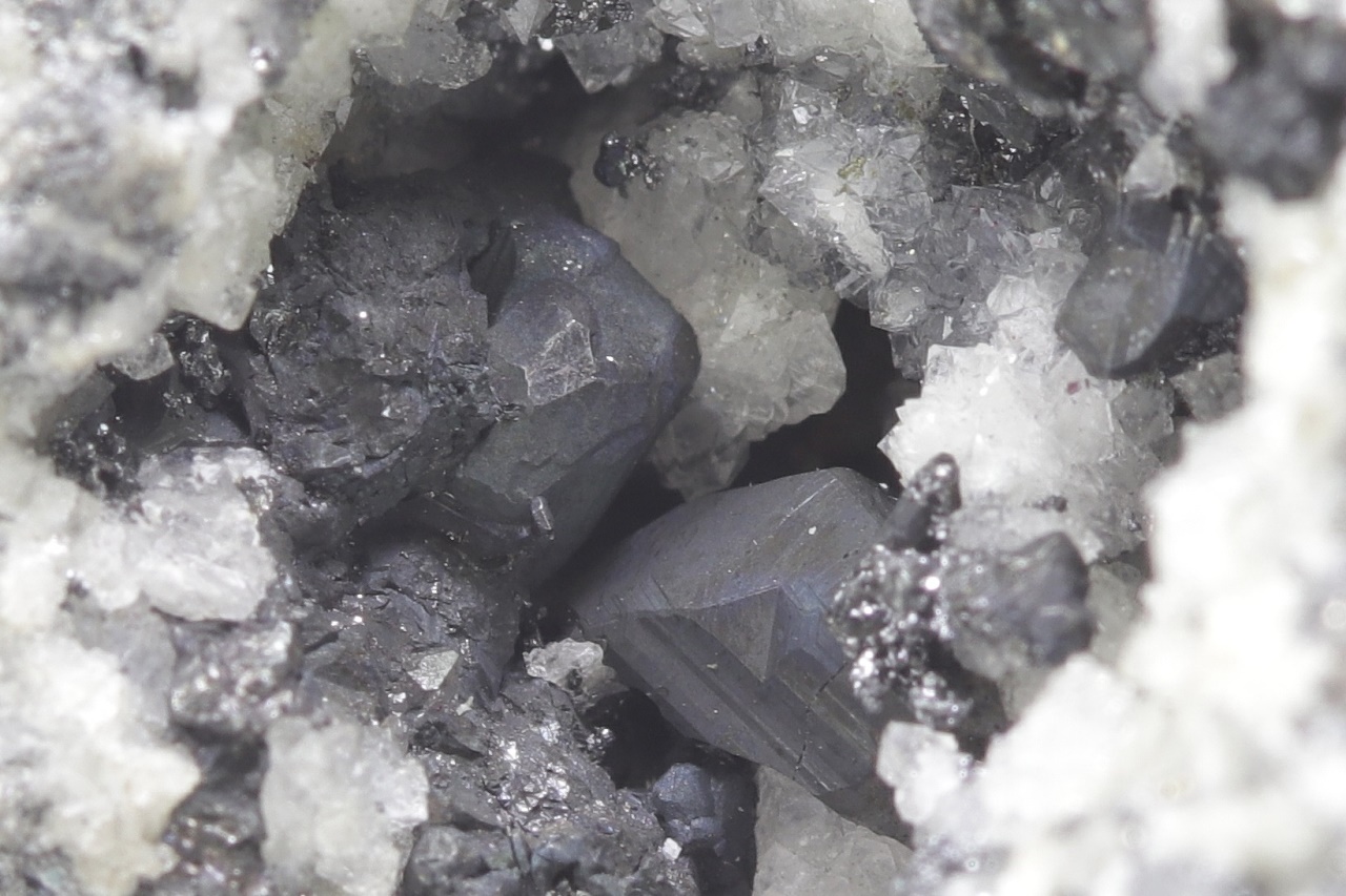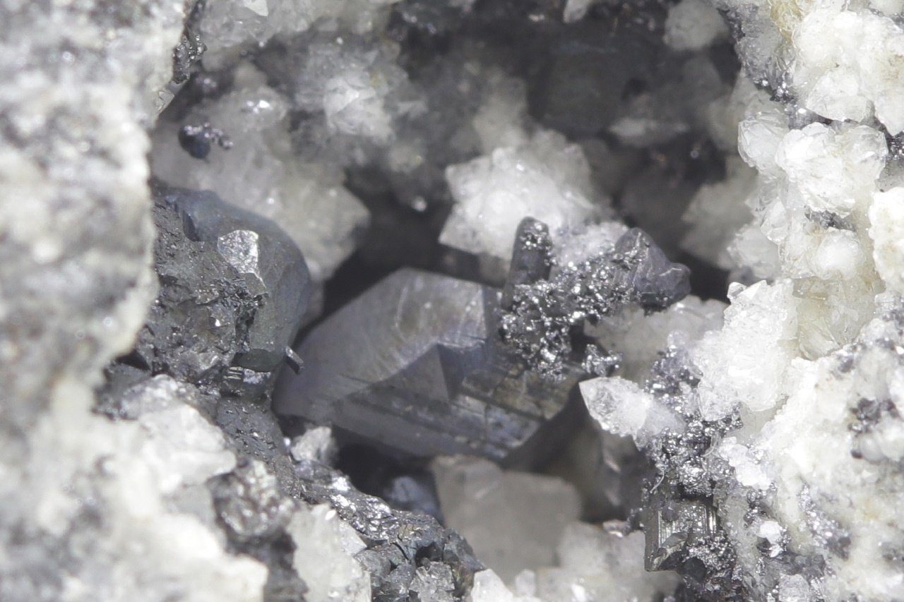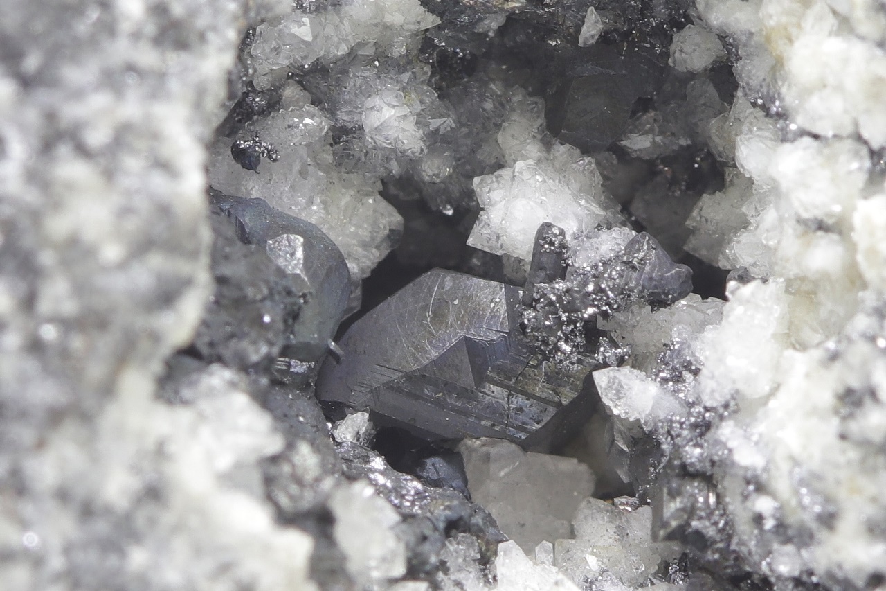Sample of Příbram vein matter with cavity-grown pyrargyrite (up to 3 mm in size), on which smaller lustrous crystals of stefanite have grown.
