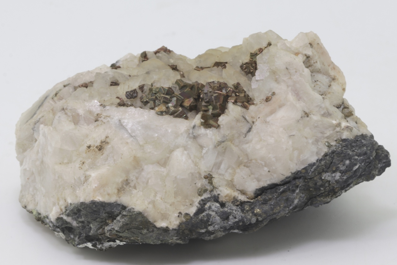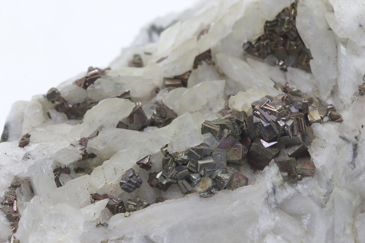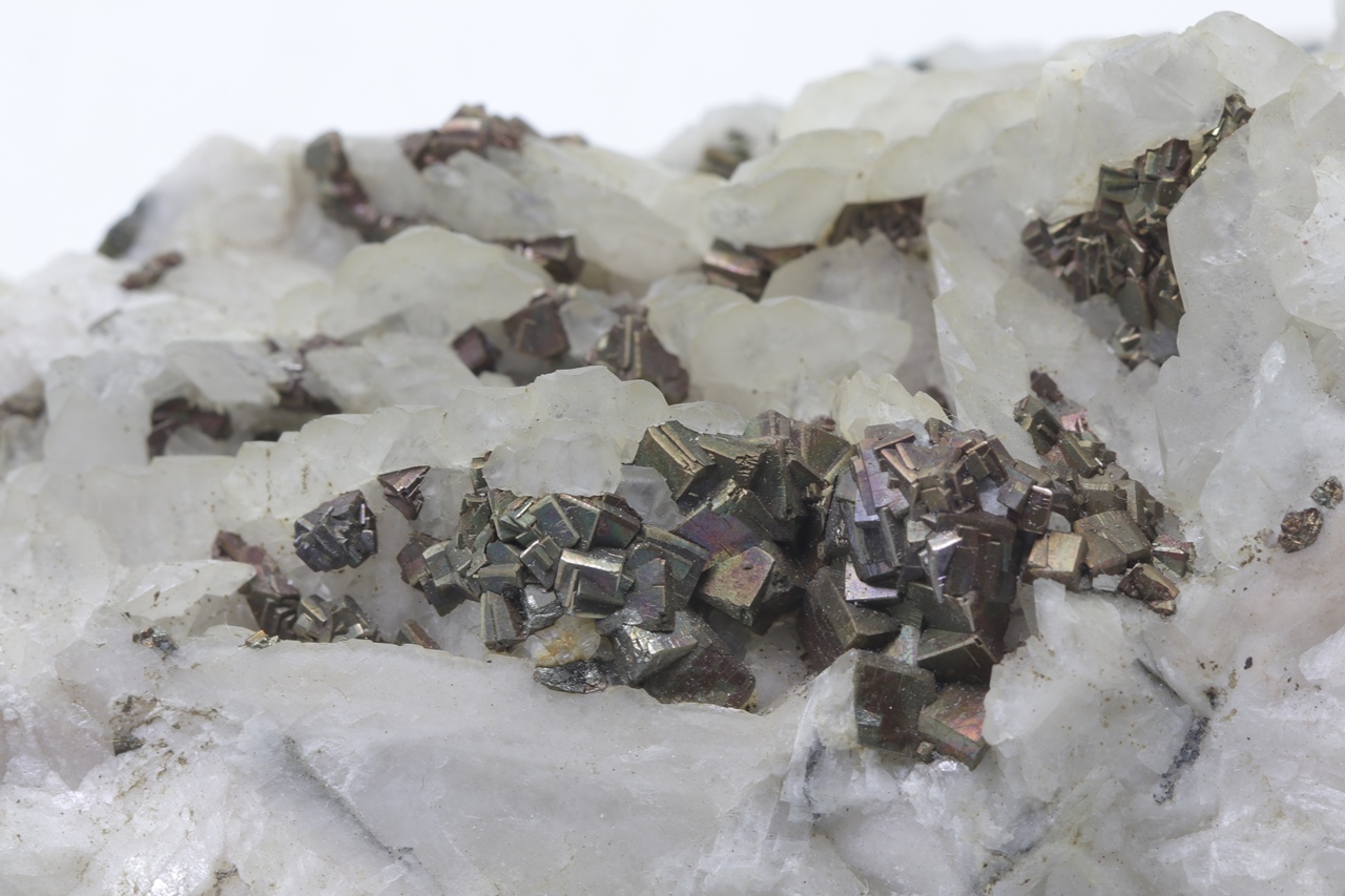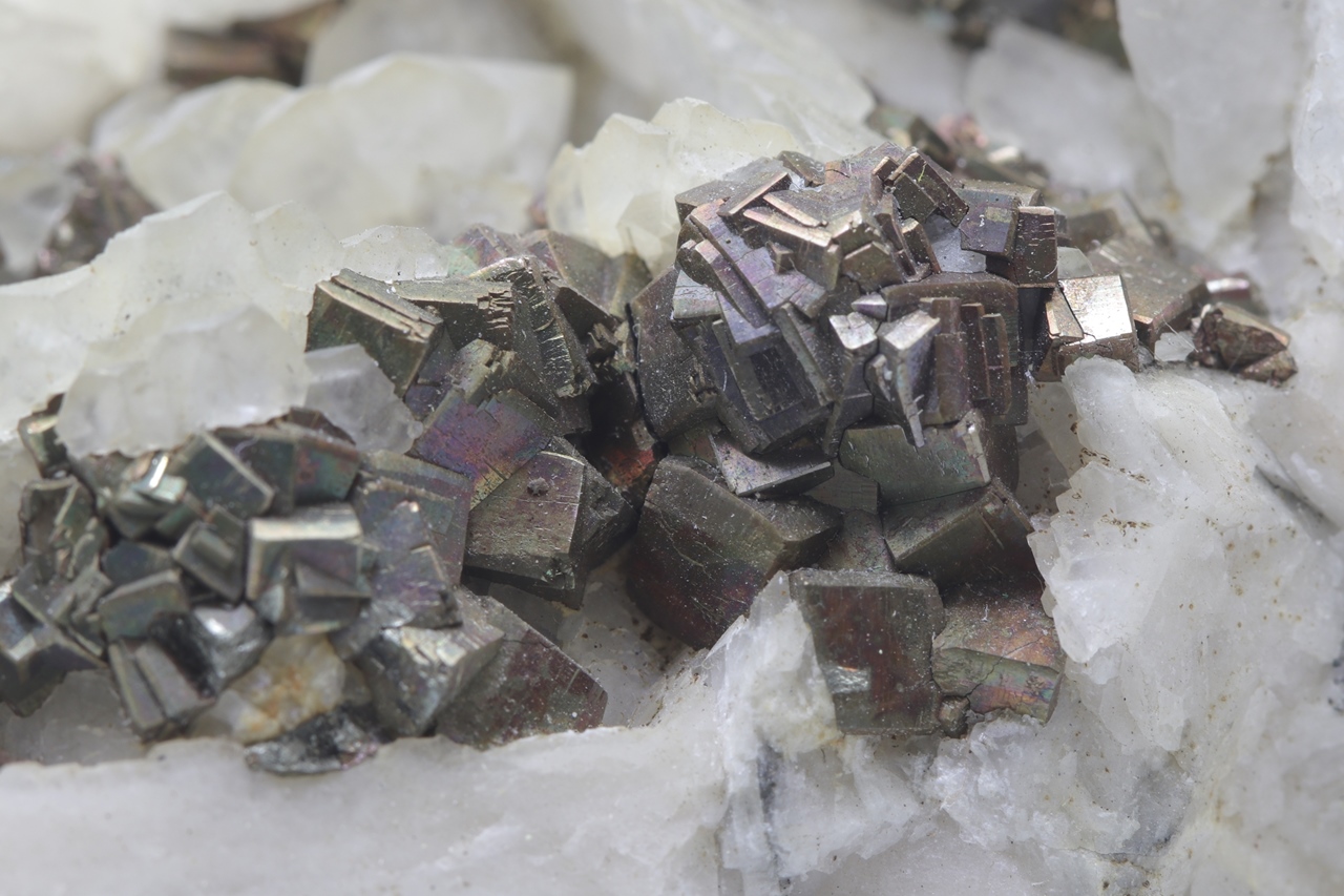 Pyrite crystals grown on white calcite up to 3 mm in size.