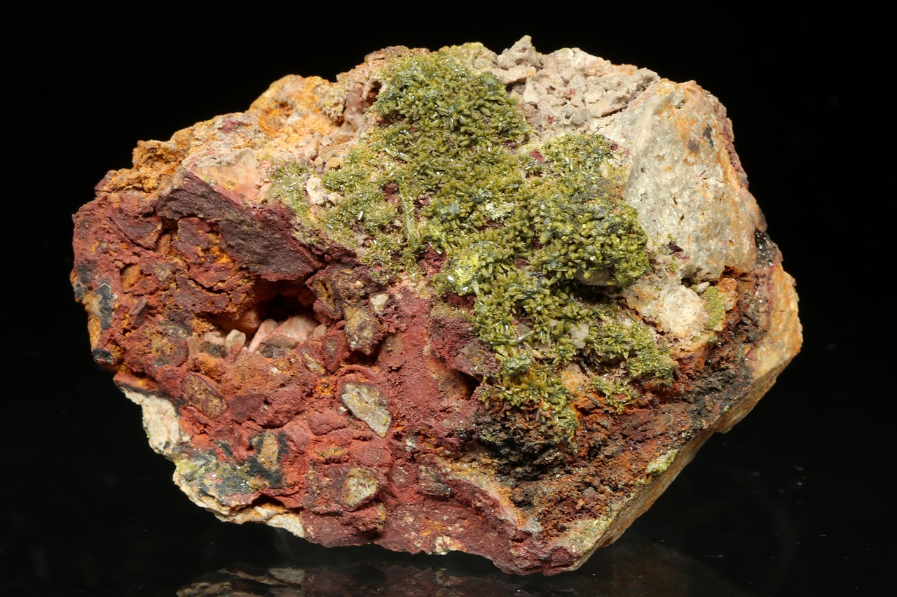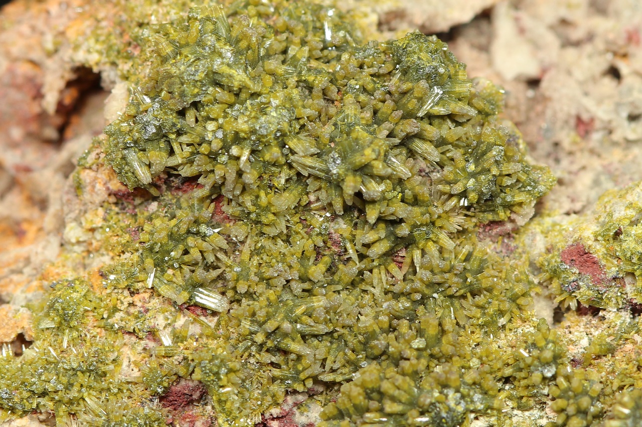 Esthetic druse of green crystals of lead phosphate about 1 mm big. The interesting feature is the atypical zonal development with yellowish tips of the crystals.