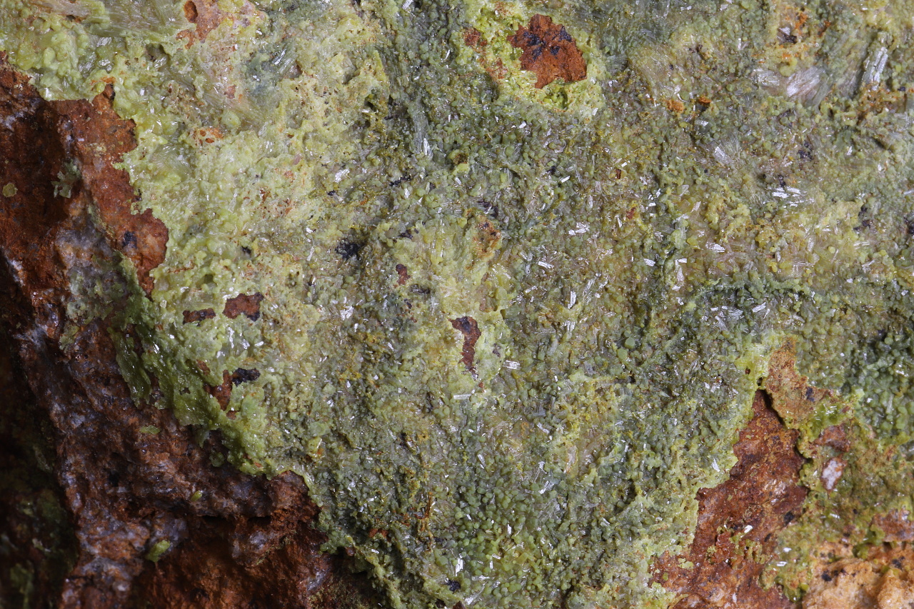 Rich larger sample of hexagonal pillar-like crystals and finely crystalline crystals of green pyromorphite on altered slate. Pyromorphite is from the historic Ag-Pb-Zn Ratiboř Ice Mountain mining district, where active mining last occurred before 1850. The occurrence of secondary minerals including pyromorphite at this location is very rare .