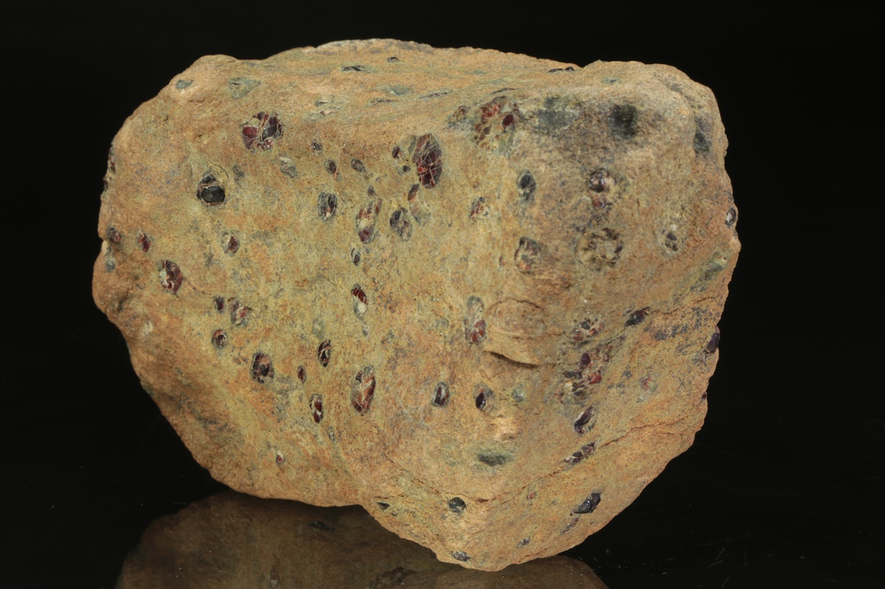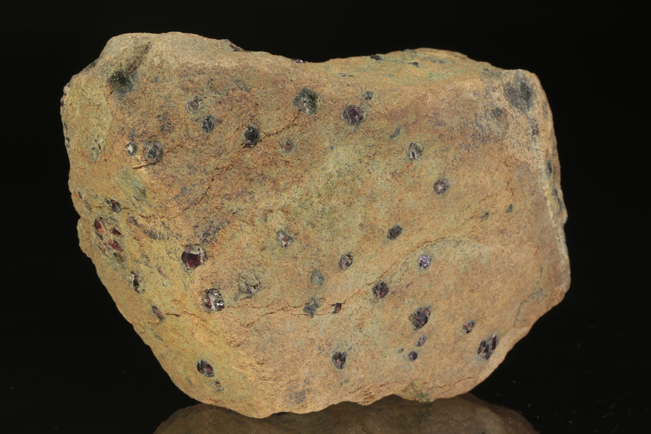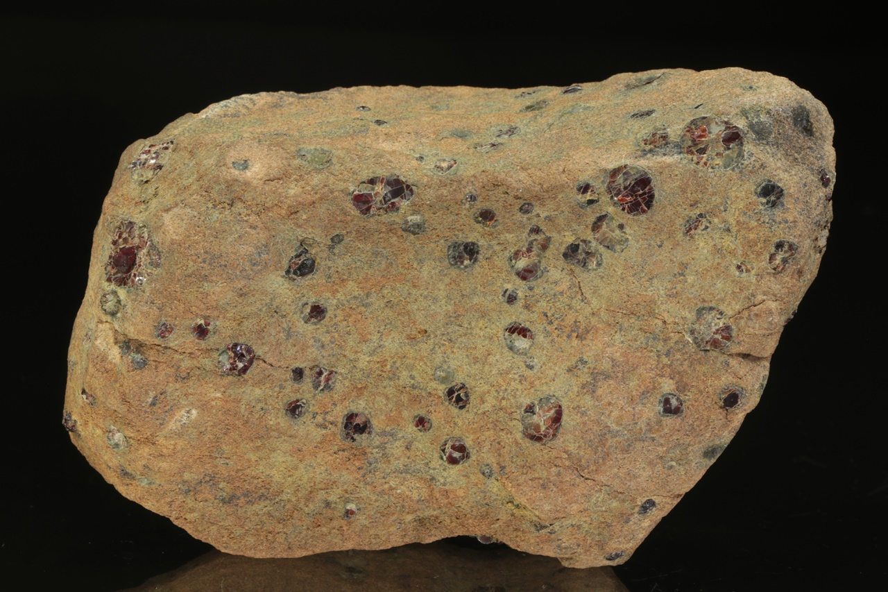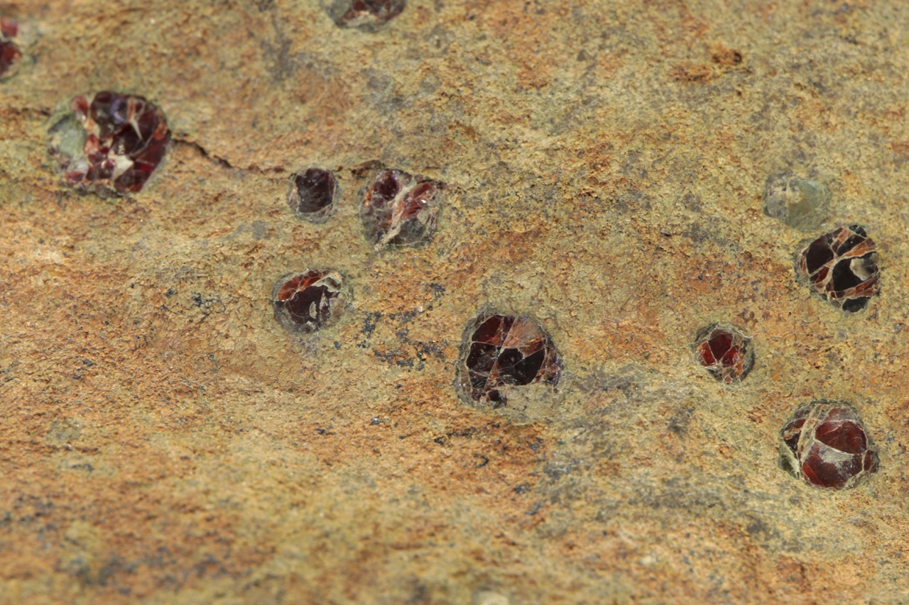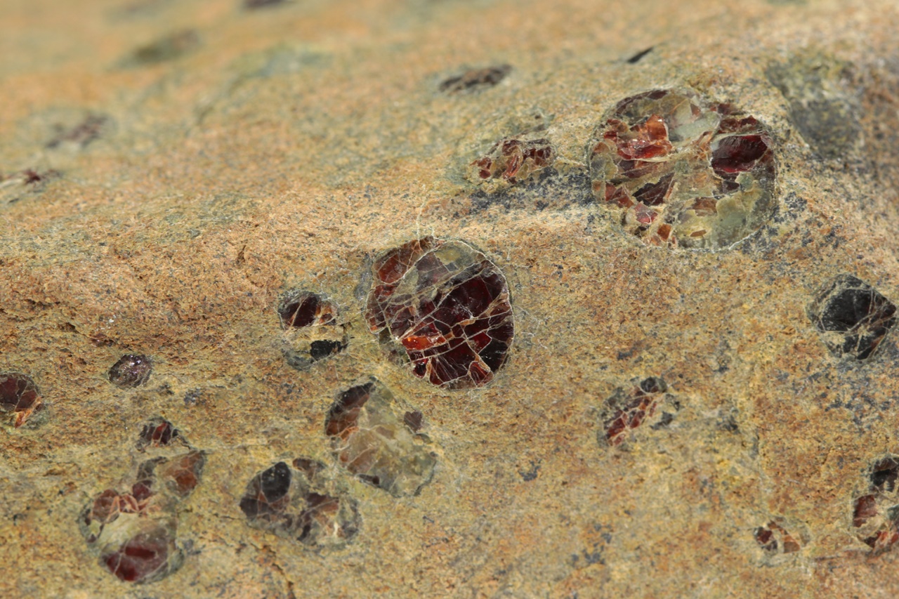 Grains of red Garnet in the weathered Parent rock. The largest Garnets are up to 8 mm in size .