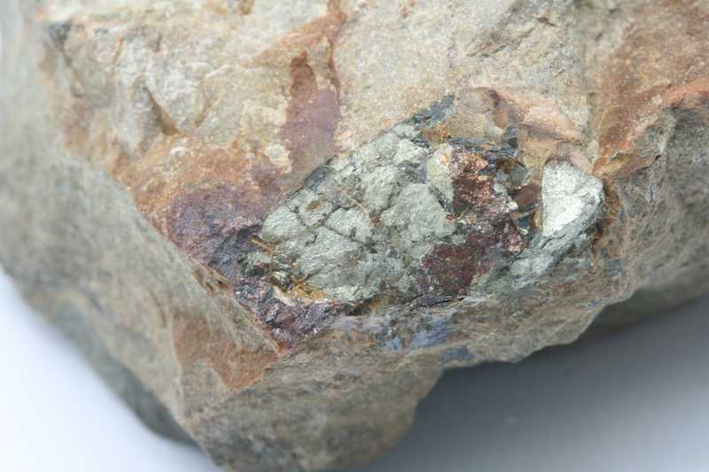 Sample of the rare manganese and titanium oxide pyrophanite from Chvaletice. Nice matrix of the host rock with flat and shiny pyrophanite crystals from the historical Mn-rich deposit.